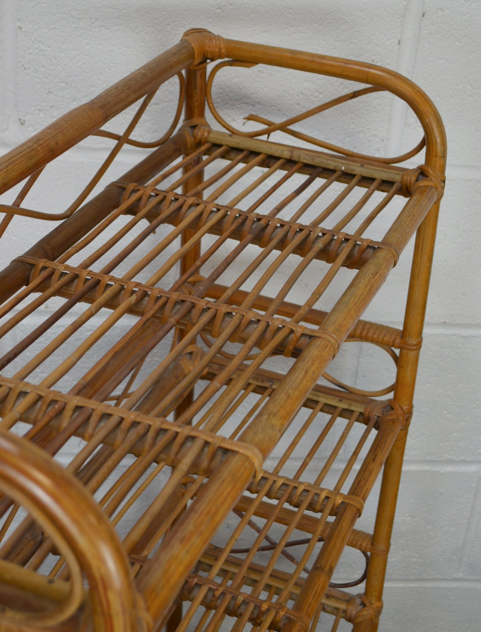 Italian Modern Design - A vintage 20th century bamboo and wicker woven open window bookcase shelves. A woven series of four shelves to gallery top rails and bow shape details to the ends.