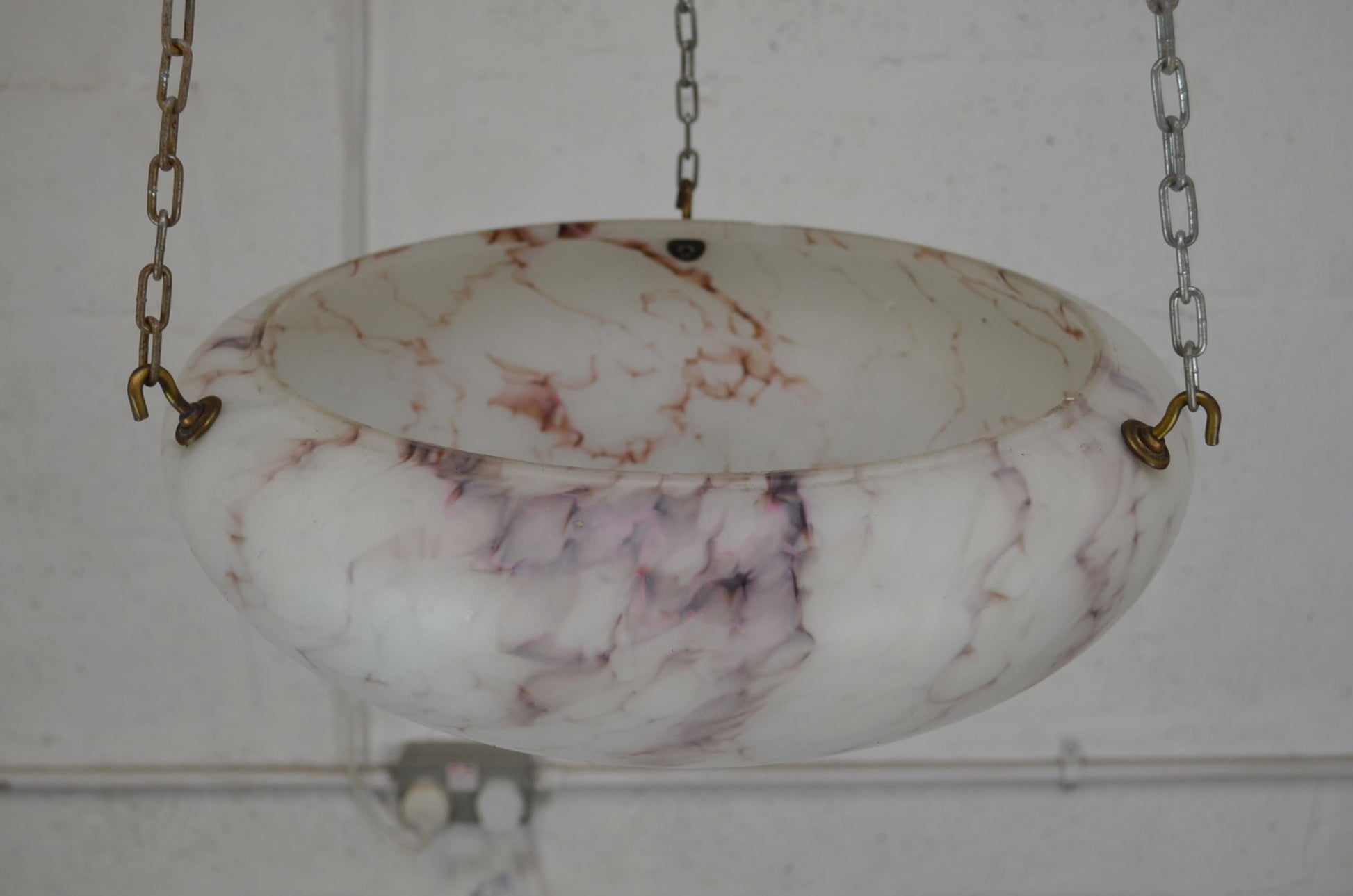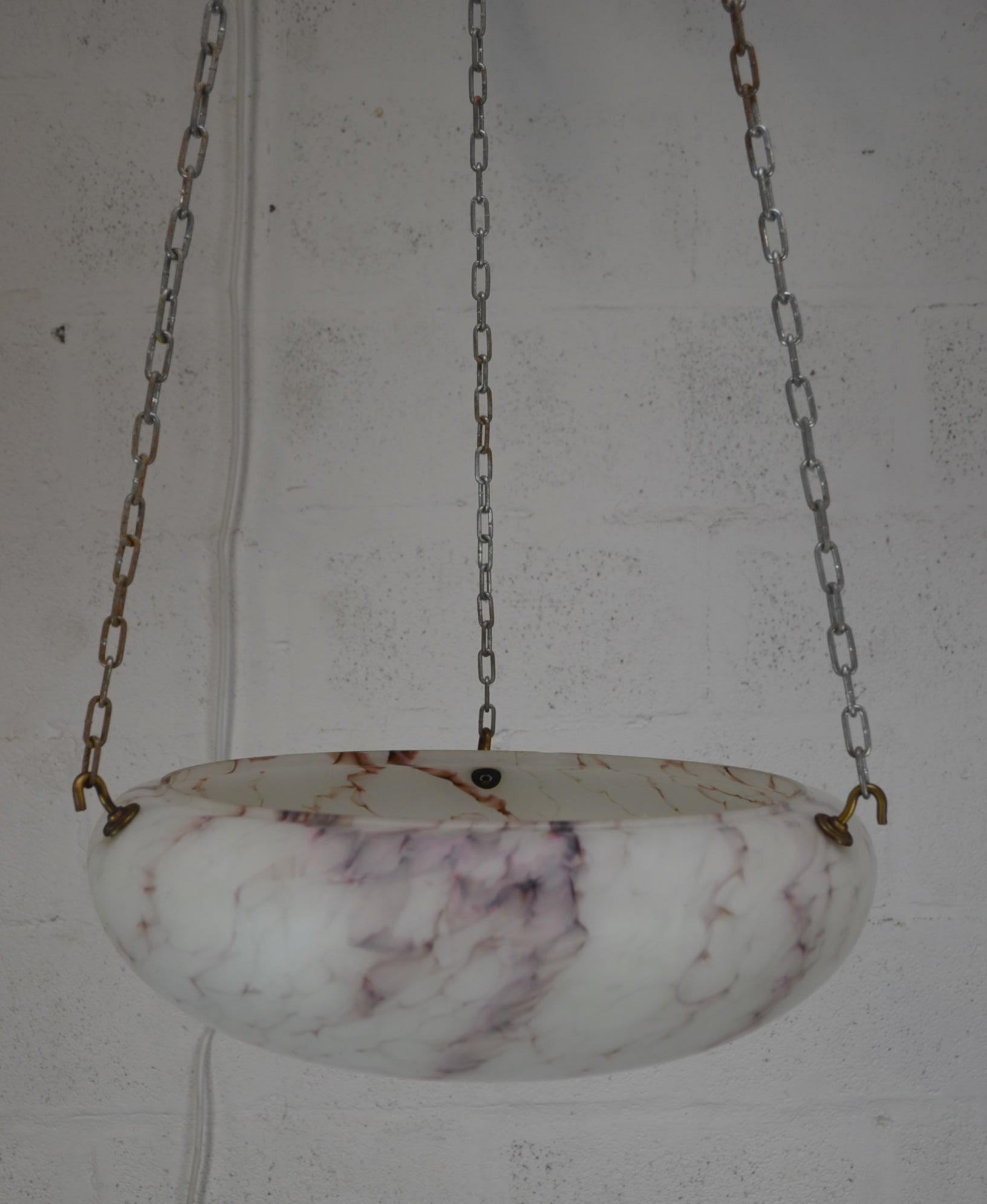 A vintage 20th Century Art Deco mottled white and purple flake glass fly catcher ceiling light shade of classic form with new ceiling hooks.