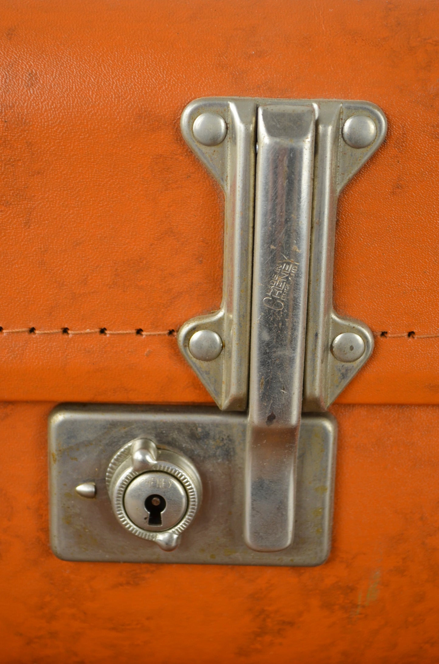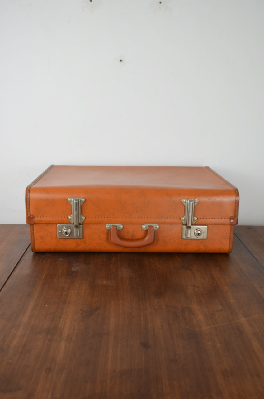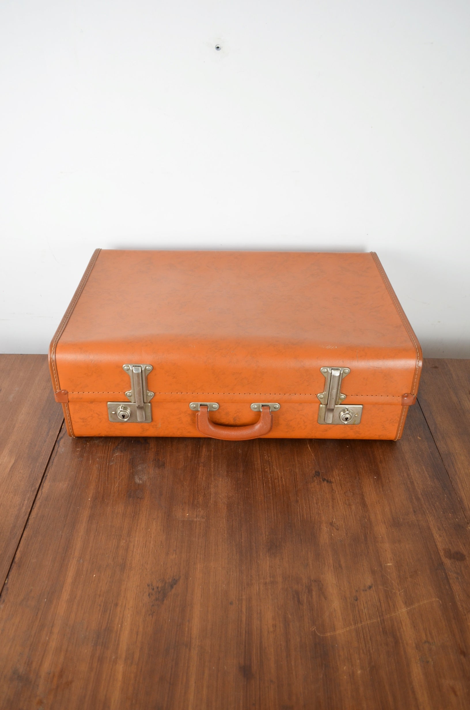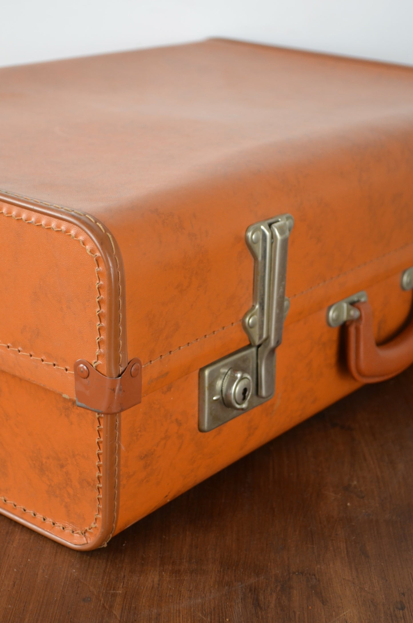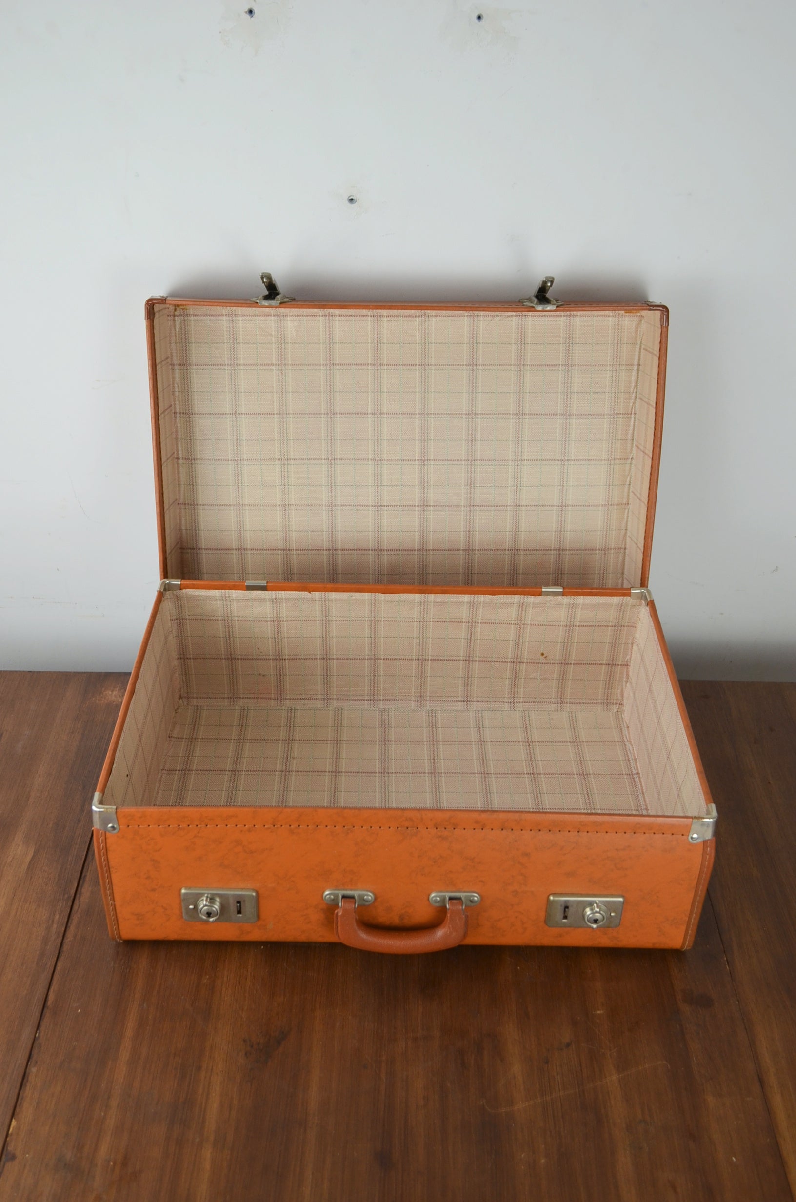 A vintage english, solid, leatherette suitcase with working latches, checkered lining and carry handle. Great for use as an occasional table or storage particularly above a wardrobe.