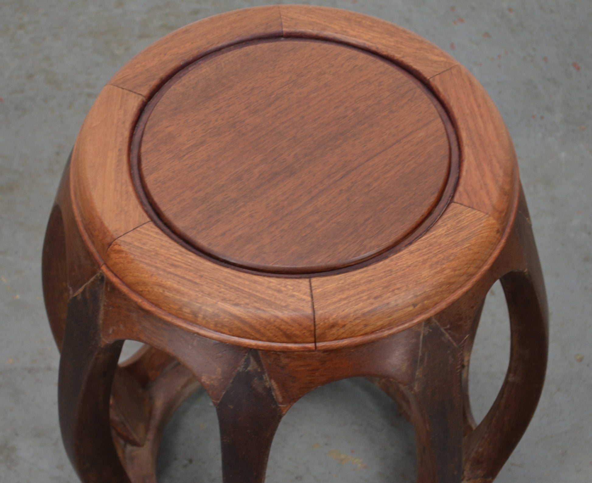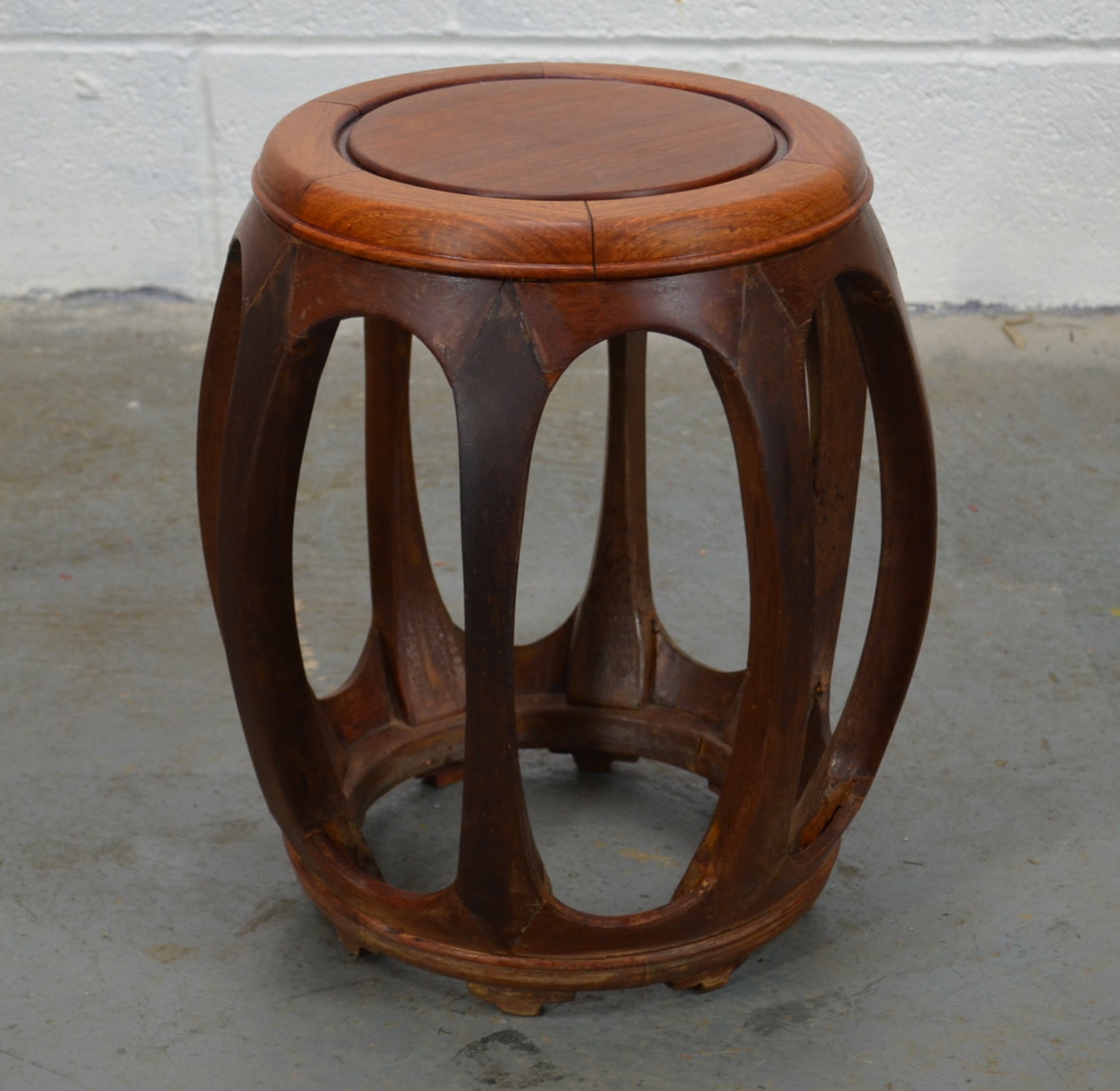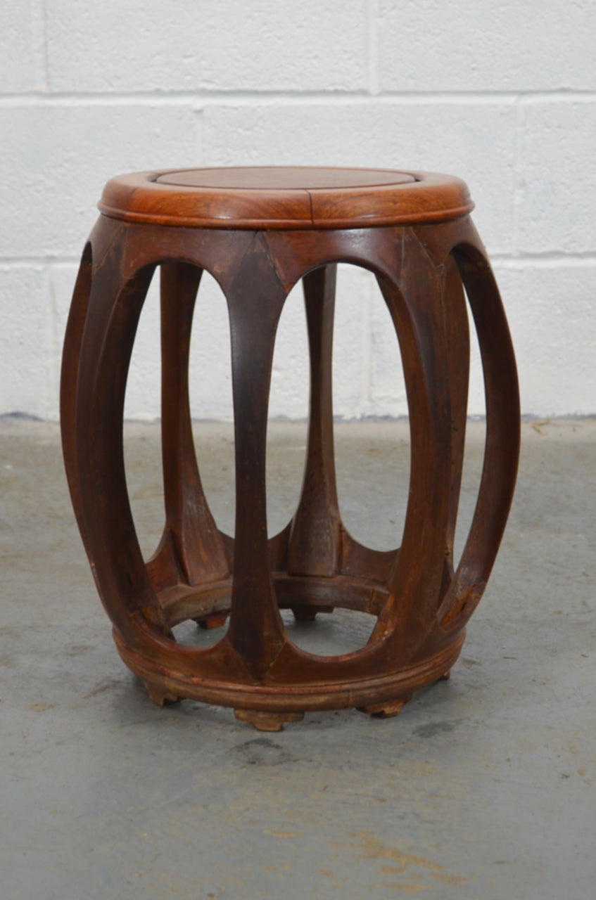 A vintage possibly mid century rosewood Chinese drum stool. Handmade from forms sections which provides an attractive and practical stool or plant stand.