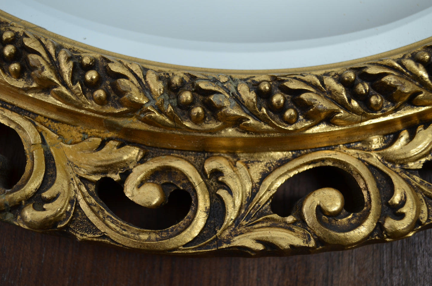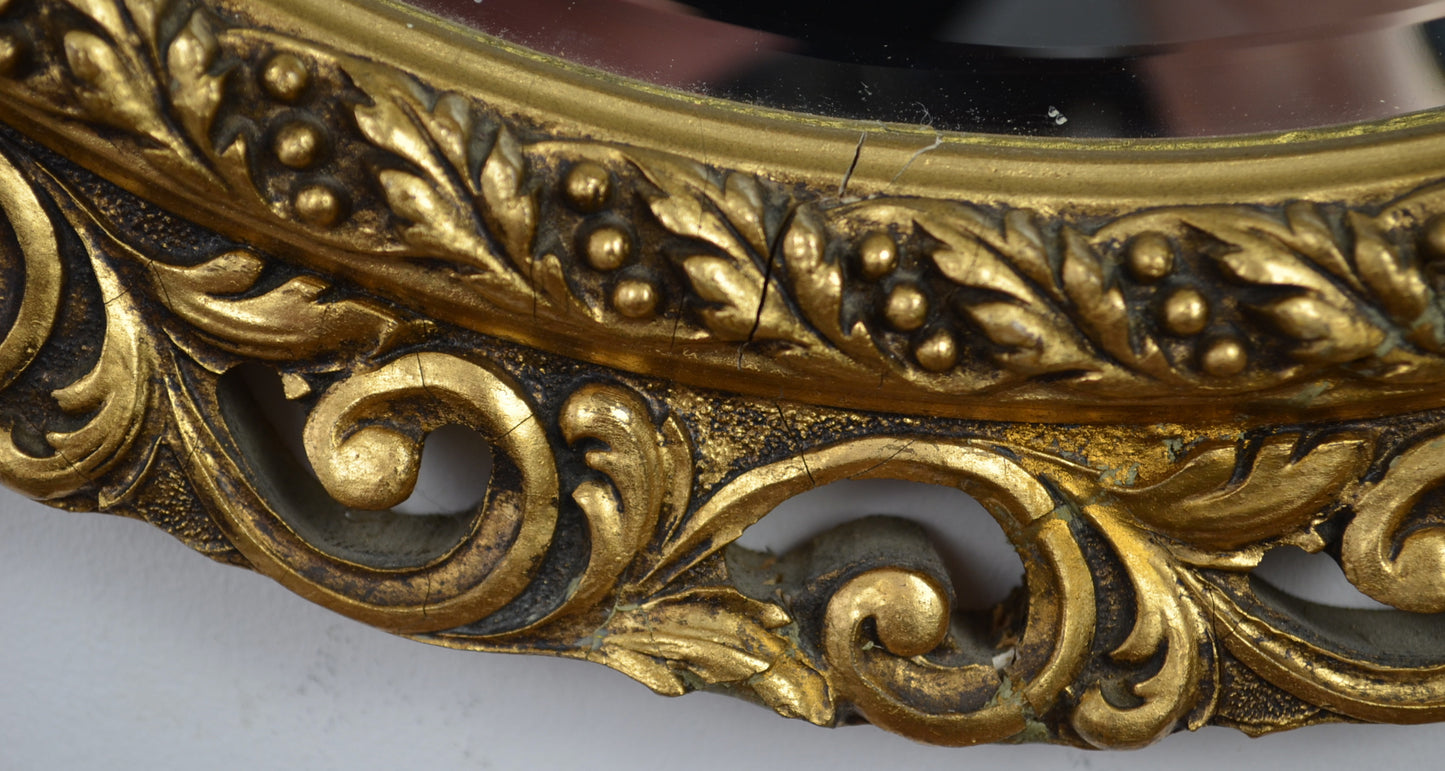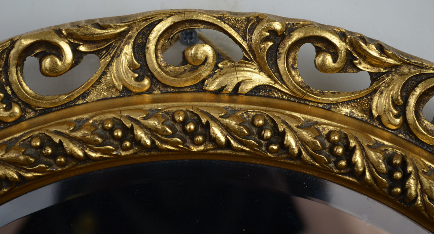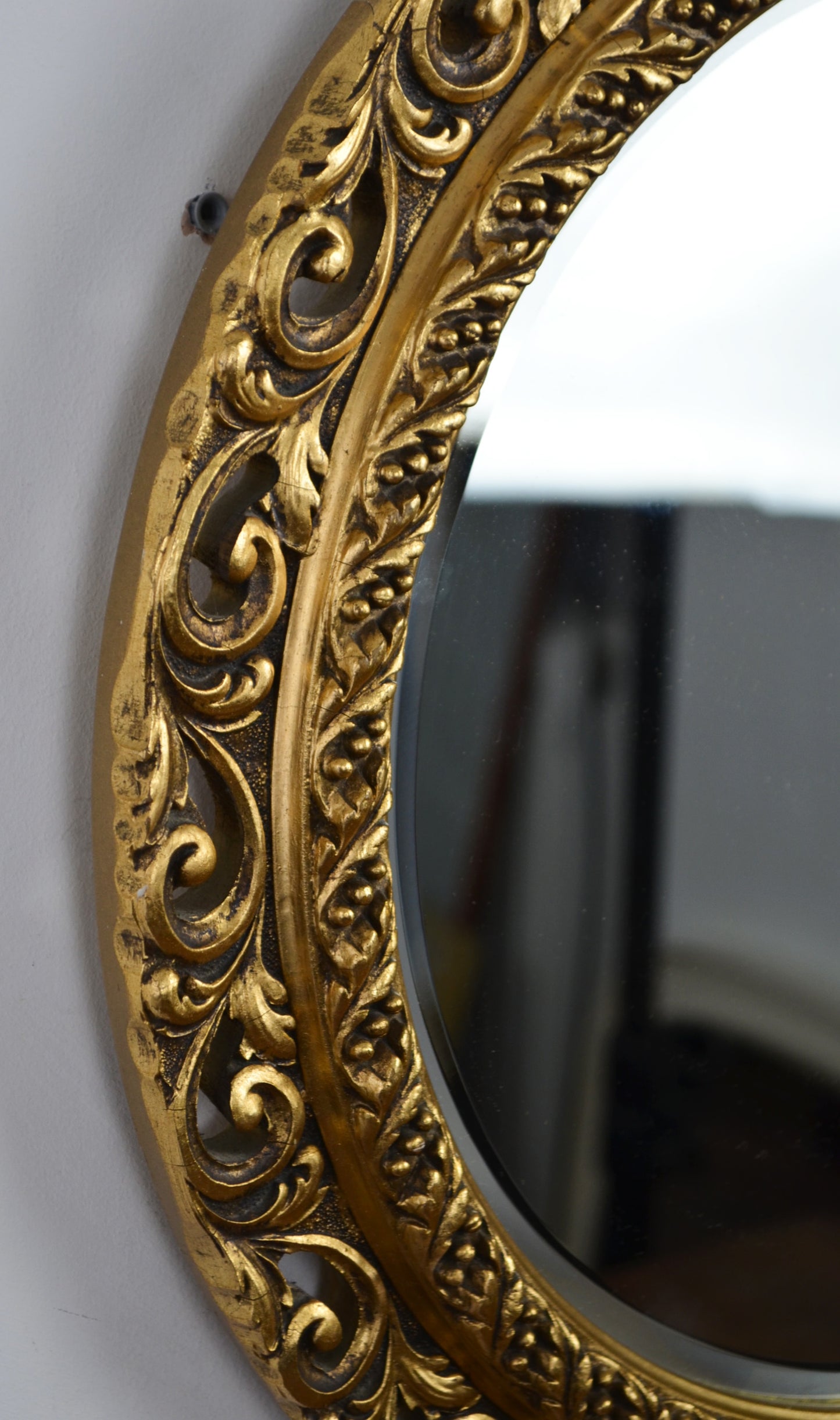 A vintage 20th-century antique-style wall mirror with moulded gilt plaster frame and hanging rings to the back.