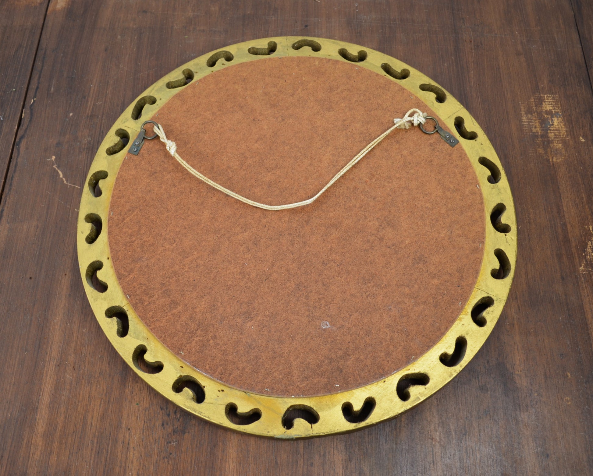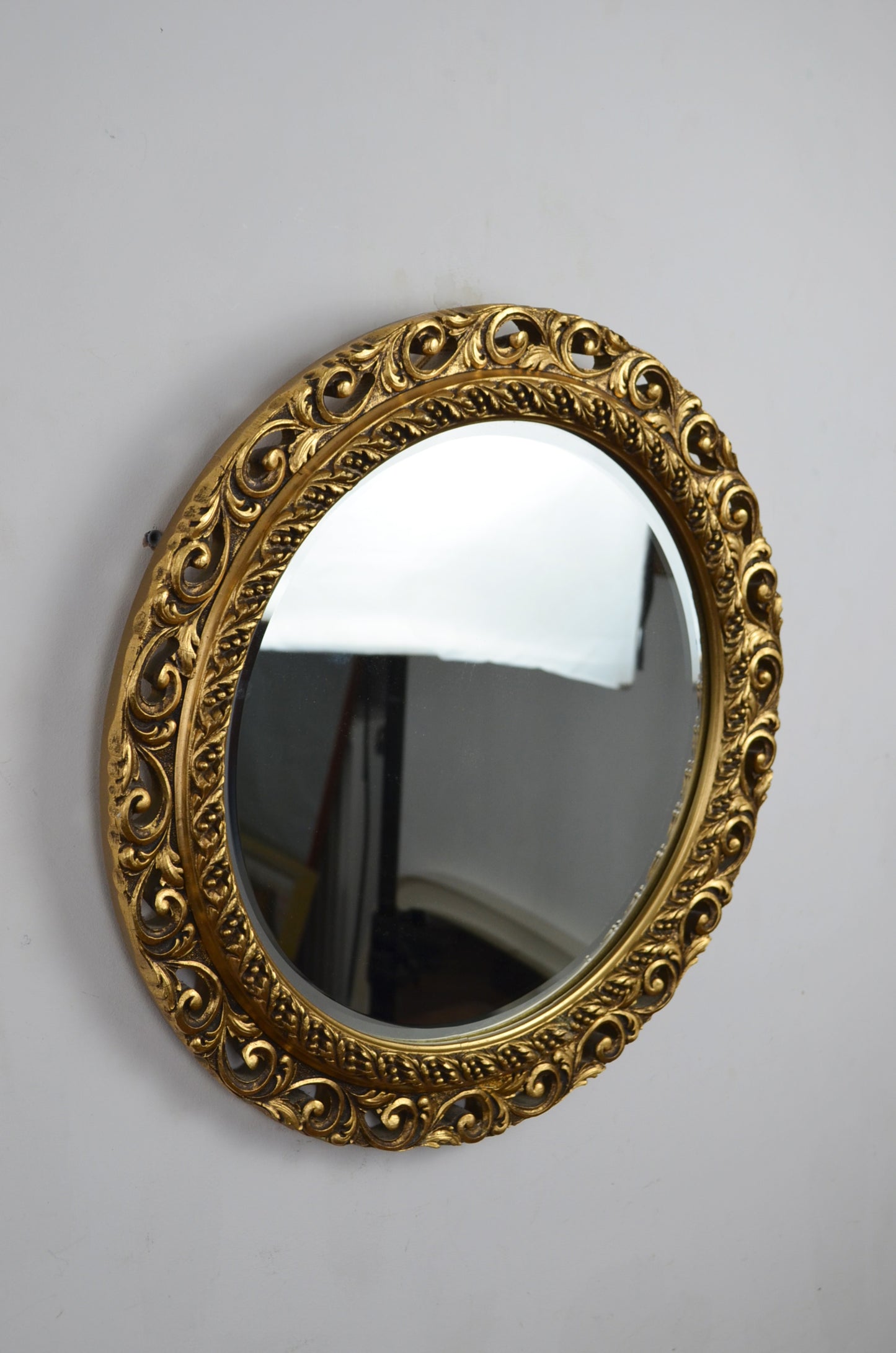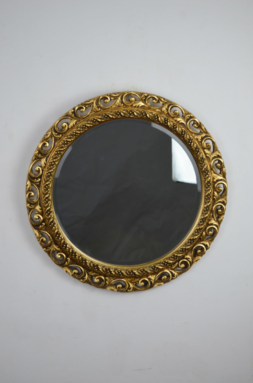 A vintage 20th-century antique-style wall mirror with moulded gilt plaster frame and hanging rings to the back.
