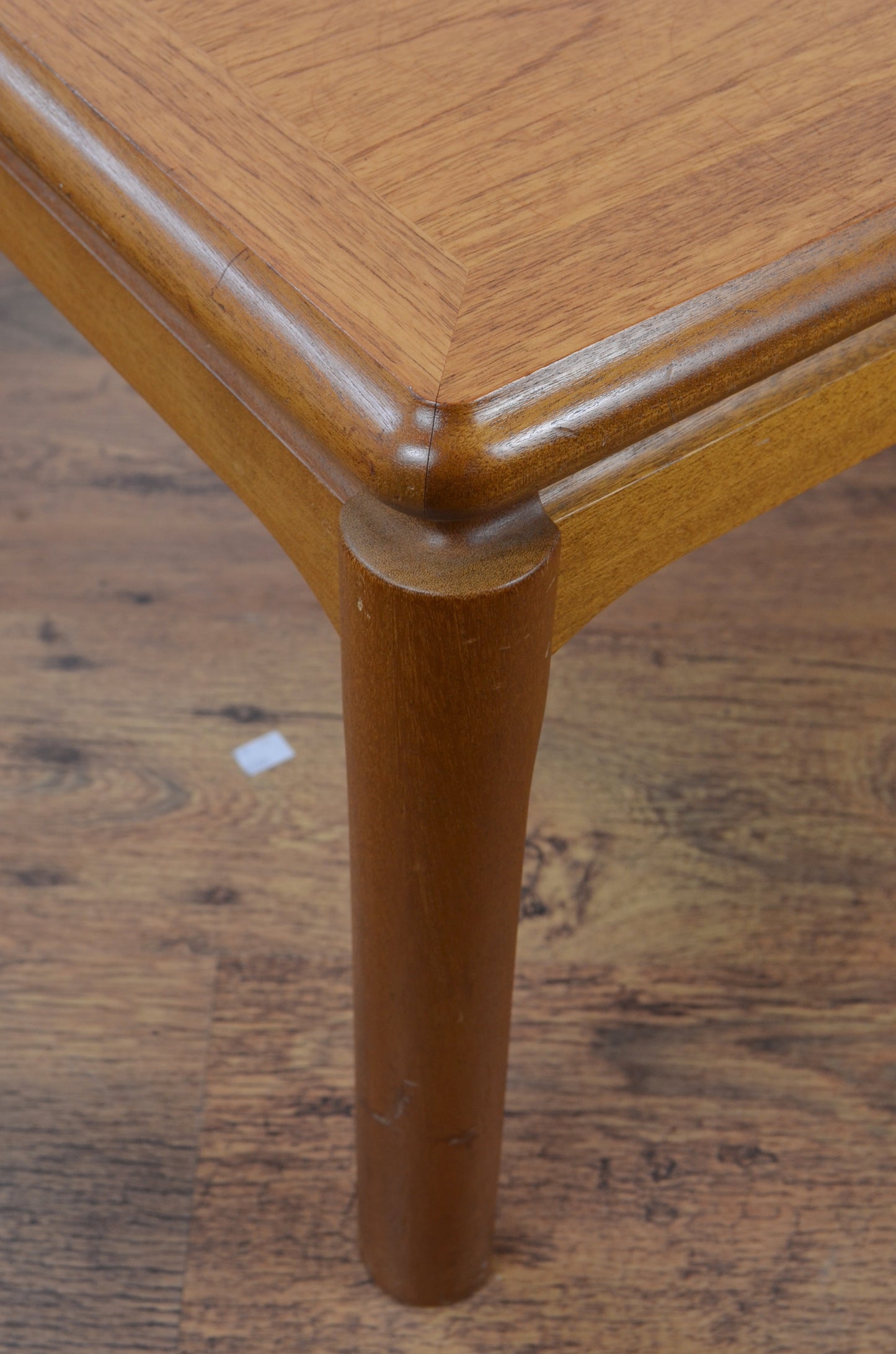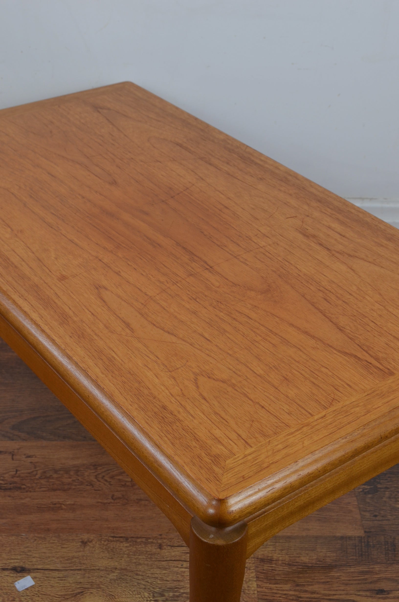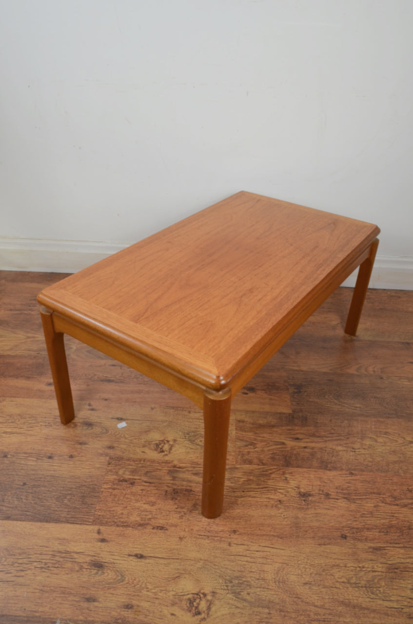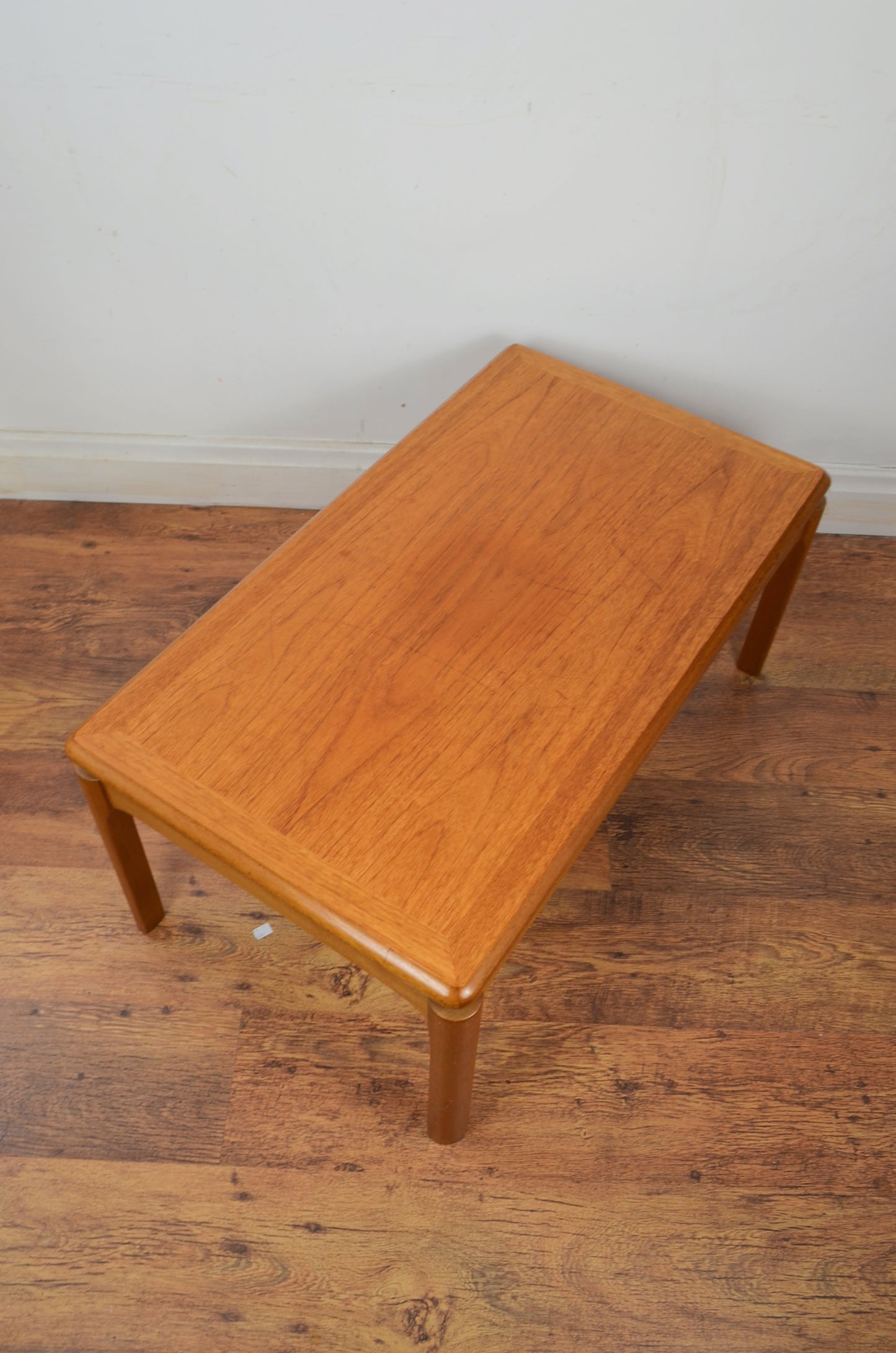 A vintage 20th century Nathan teak wood coffee table with lovely grain of a rectangular form, curved edges raised on shaped supports.