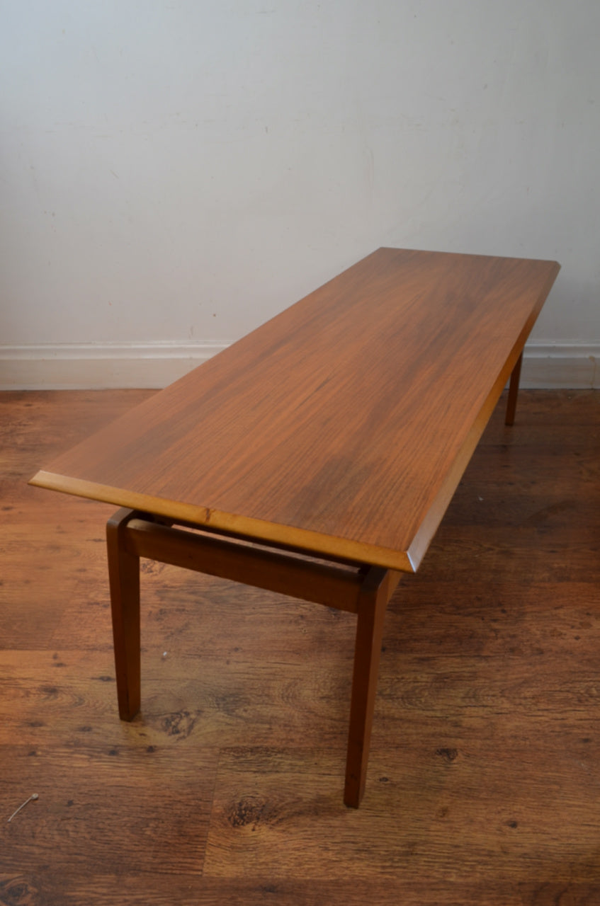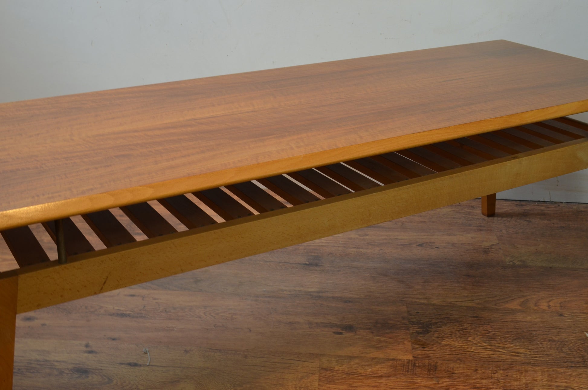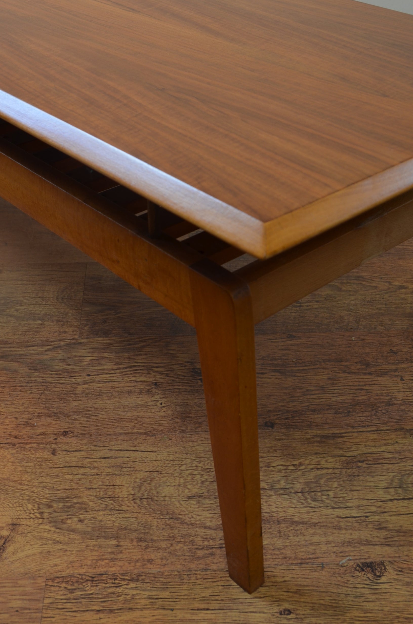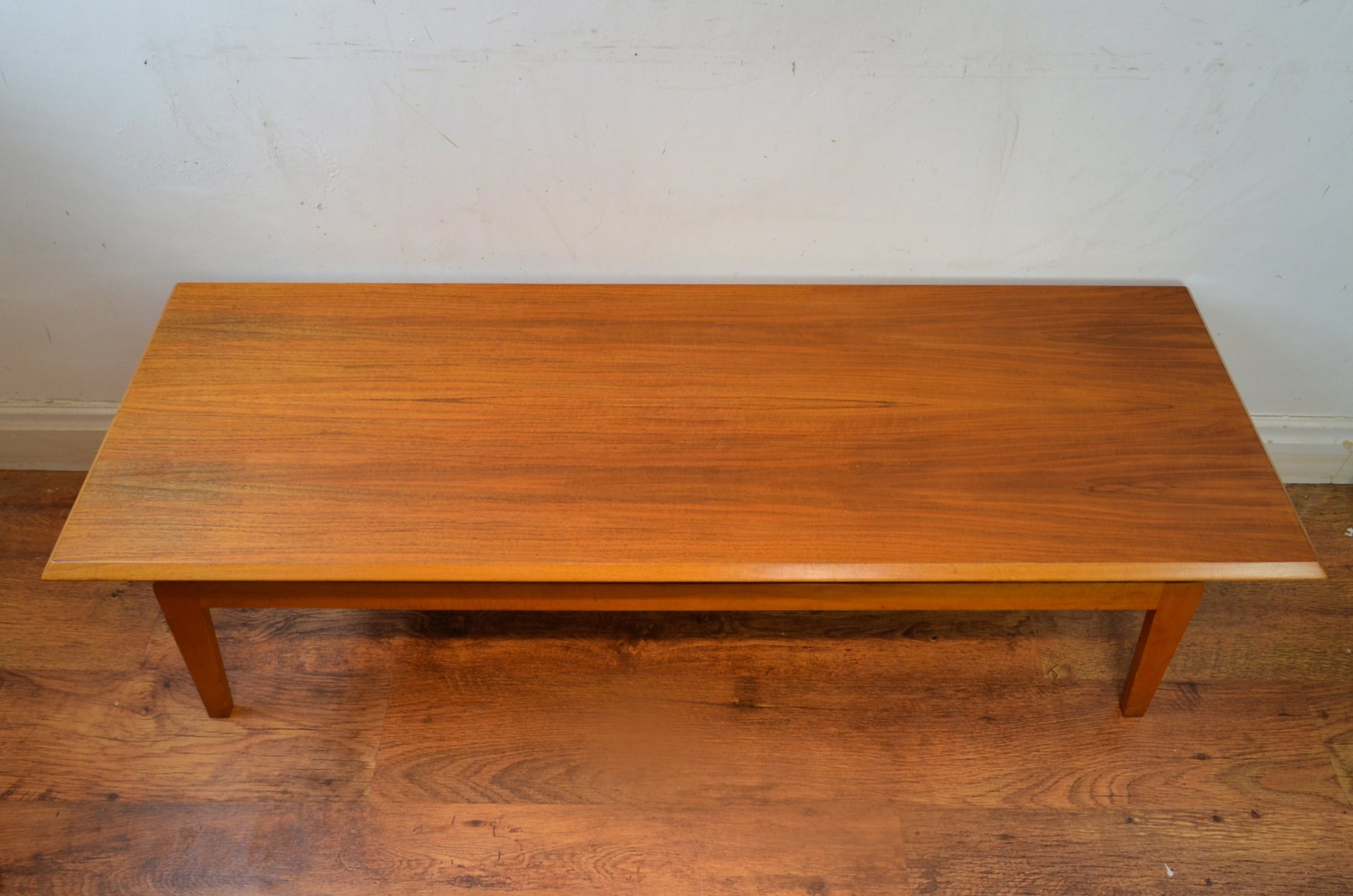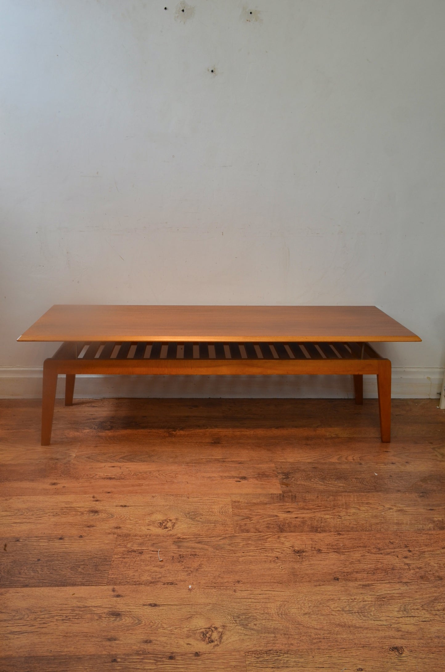 An original vintage 1960's Danish Scandinavian teak wood coffee table having a chamfered edge suspension set floating top with slatted magazine rack under tier and raised on shaped angular legs.