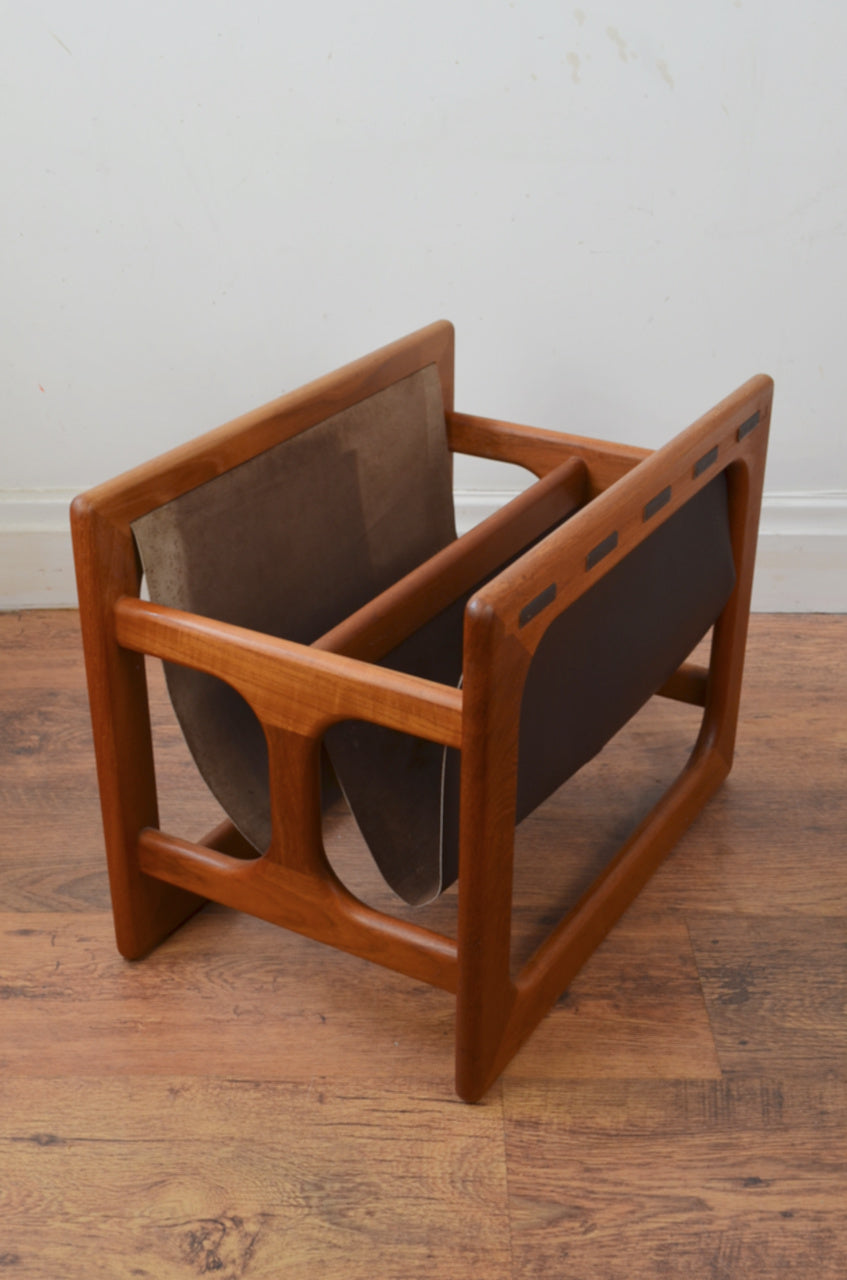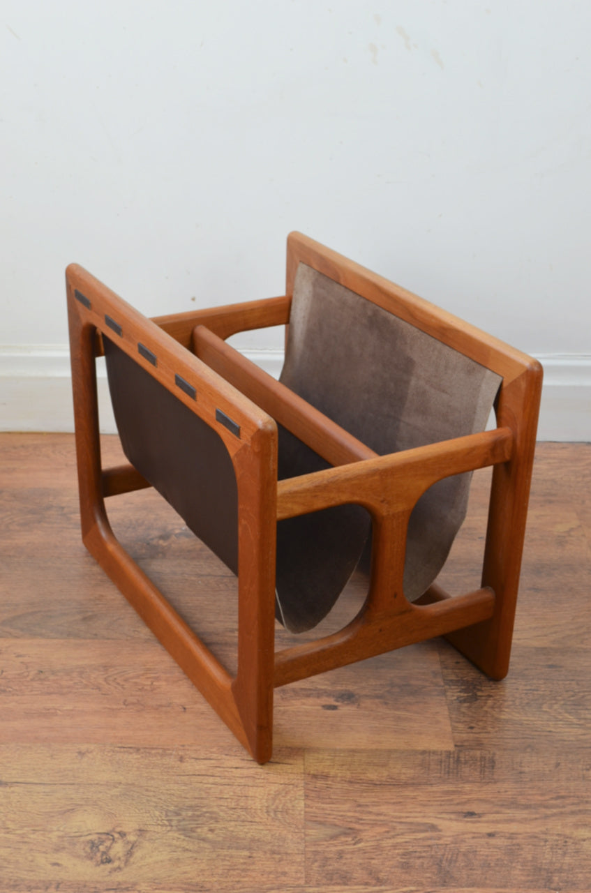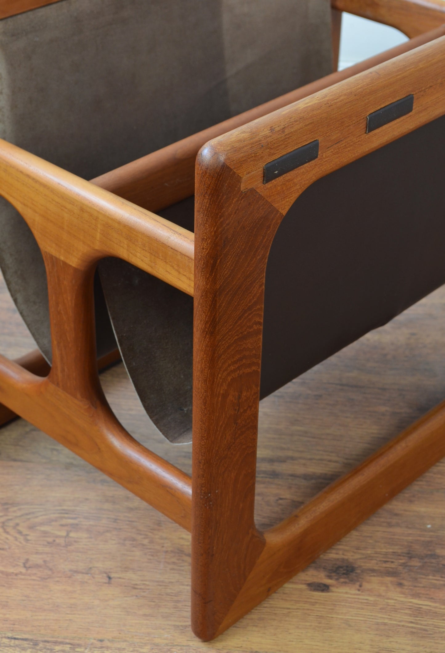 A mid century Aksel Kjersgaard for Salin Moblers magazine rack made of teak and suede leather made in Denmark in the 1960s.