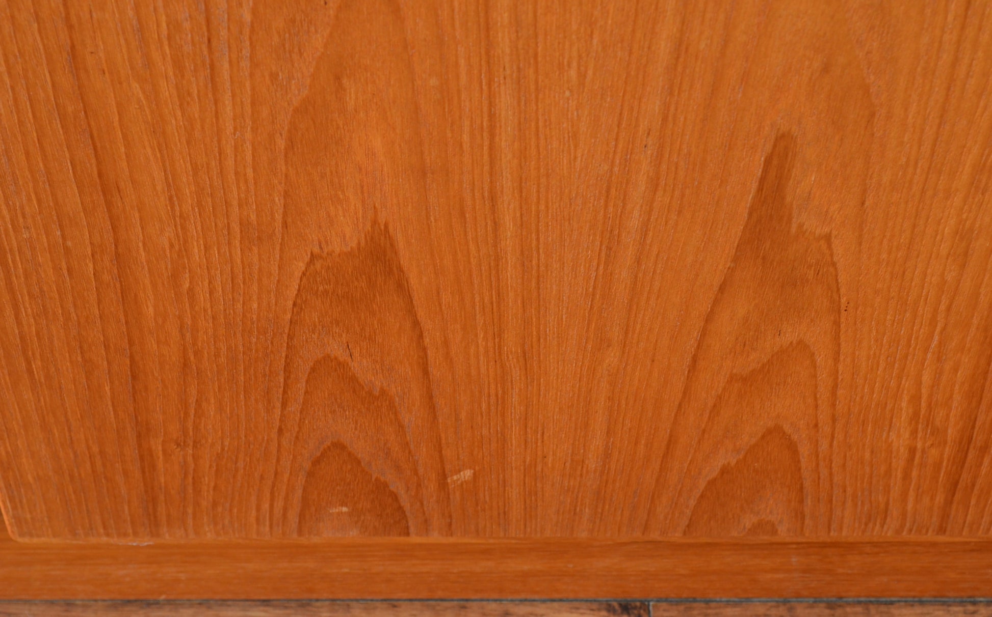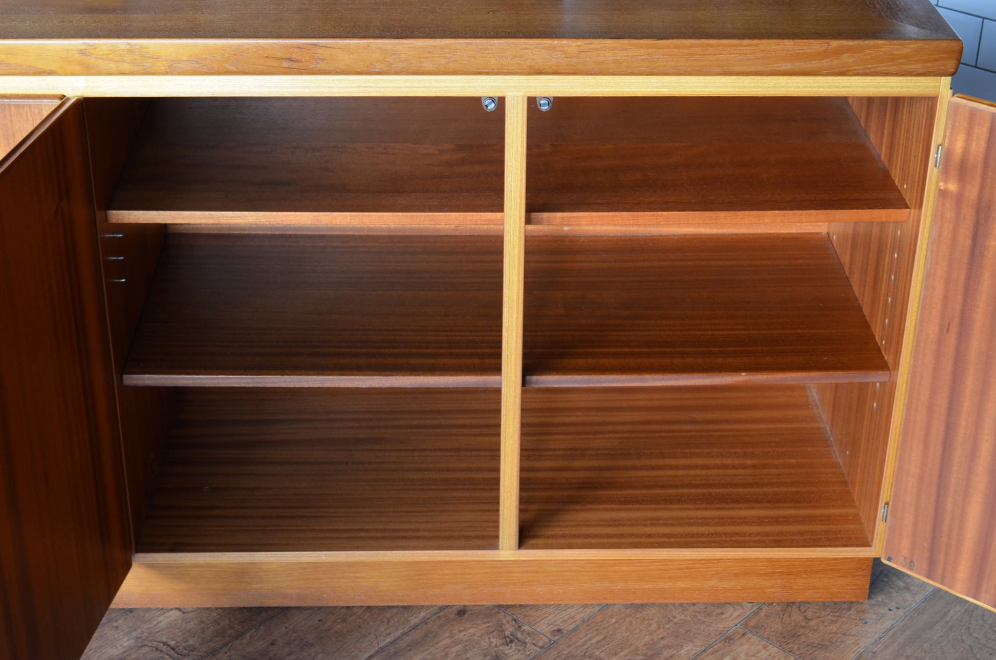 A vintage teak sideboard by Danish maker Stovby Mobelfabrik. Comprising of three storage cupboards with drawers and green baize interior in one. Great shape to the top and hinges.
