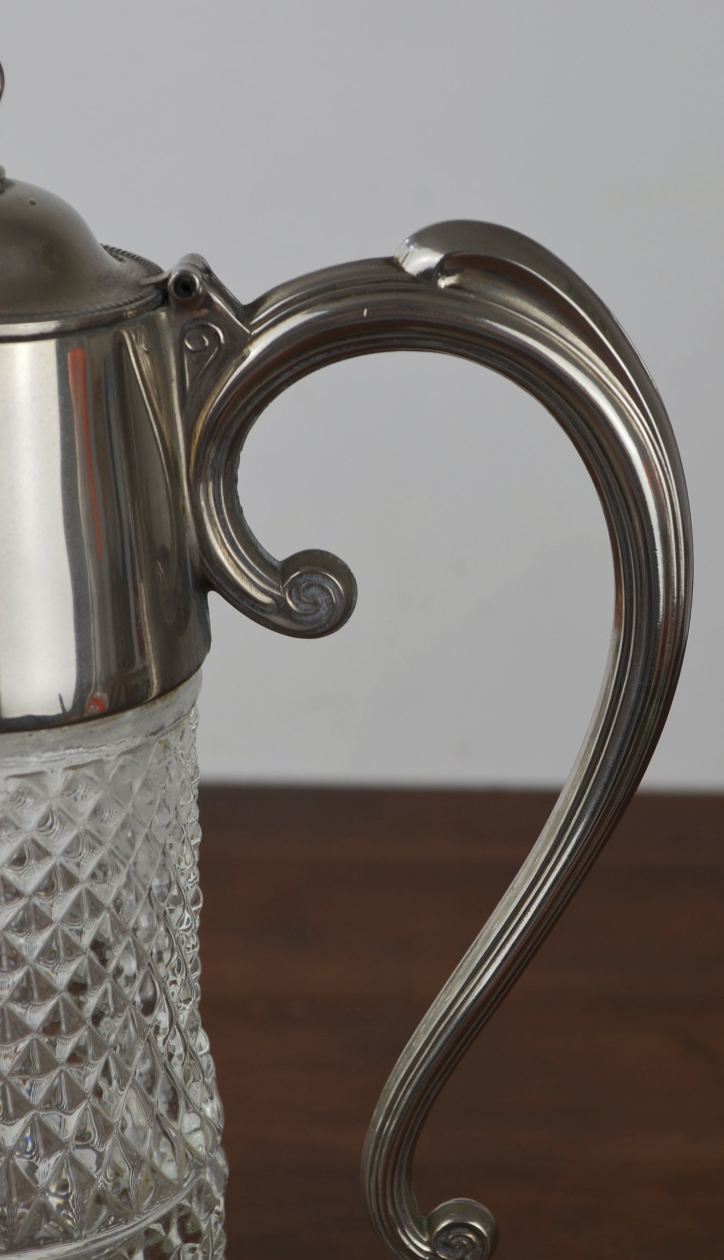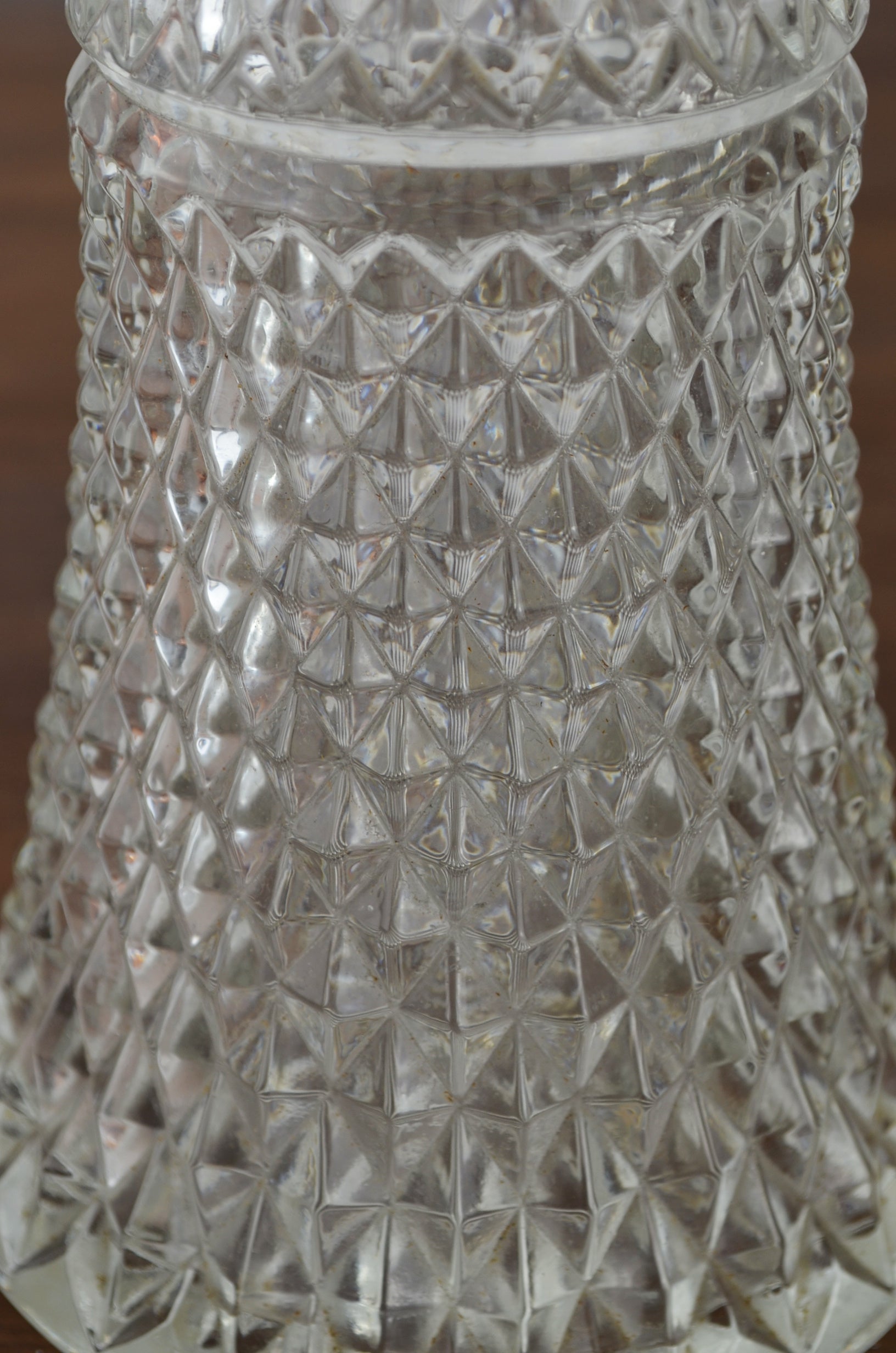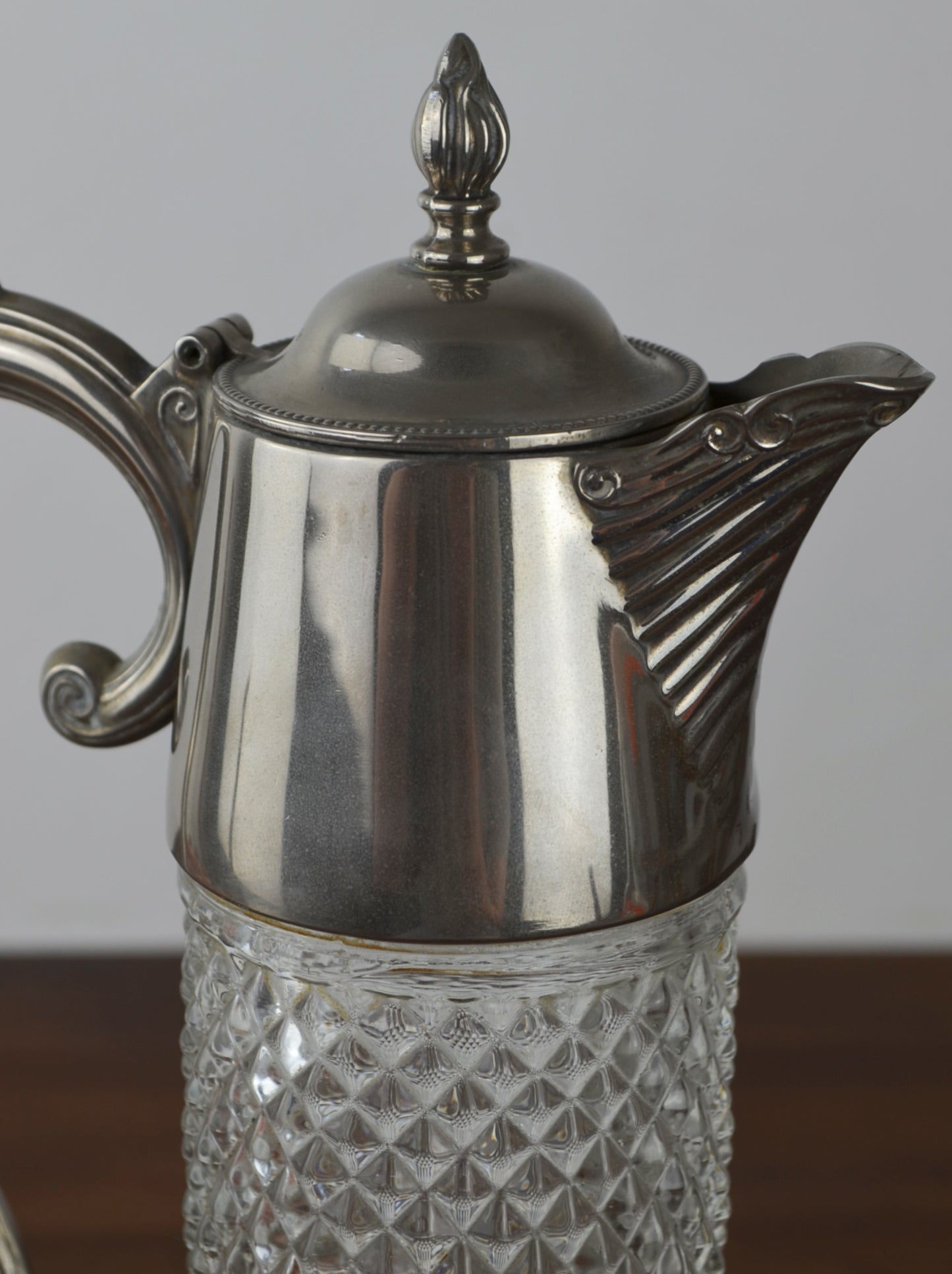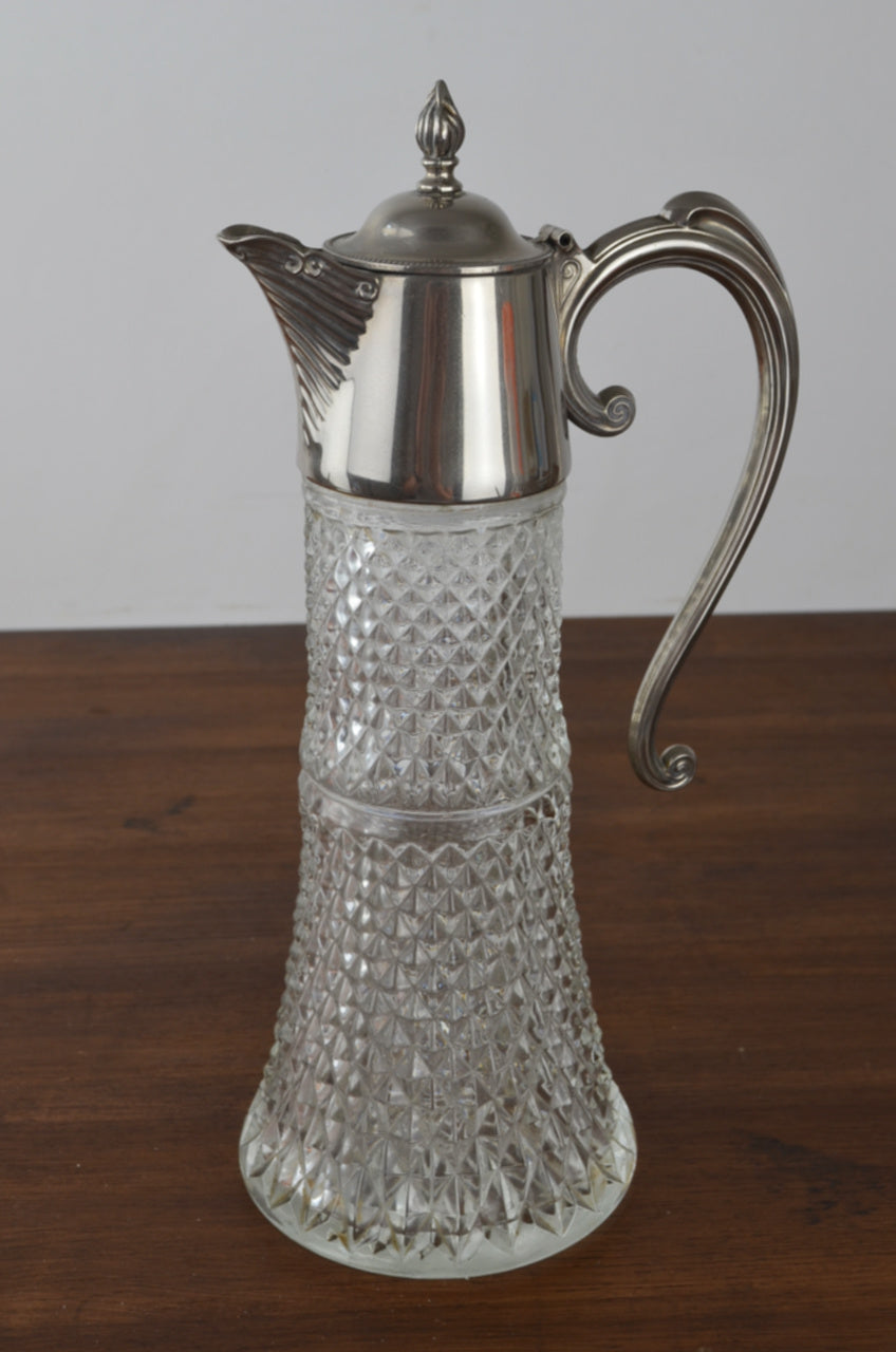 Vintage mid century pressed glass claret decanter with diamond hexagonal design set into the glass & silver plate mount and handle.