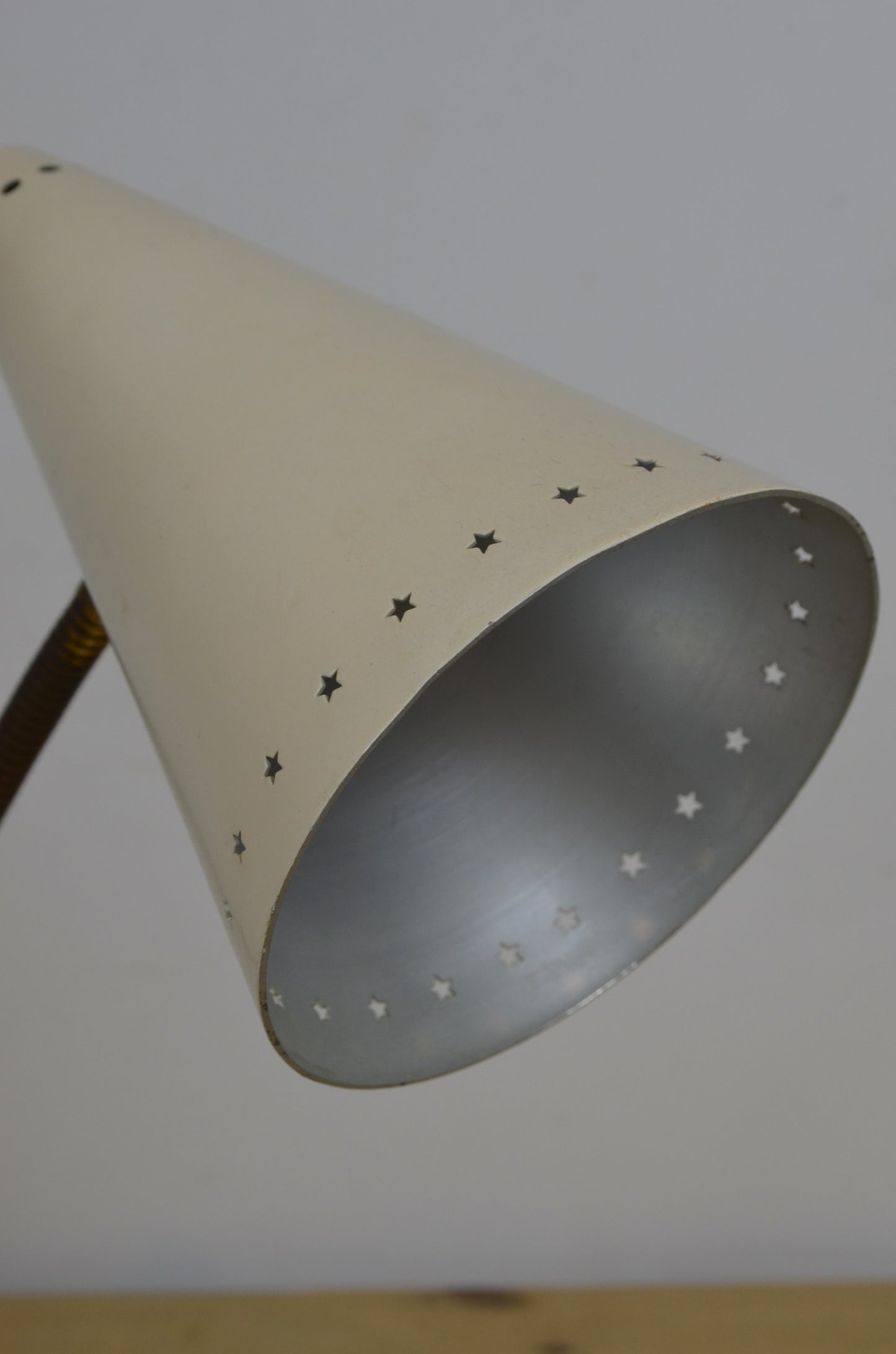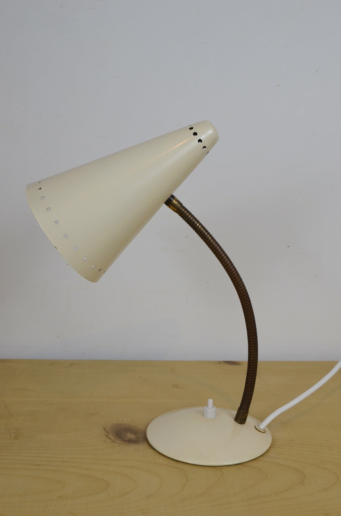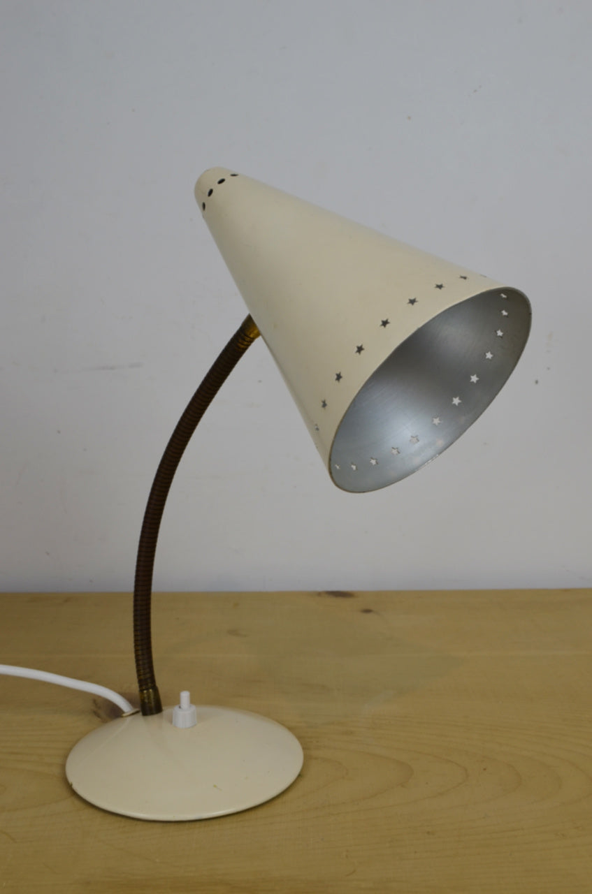 A vintage 1960s gooseneck desk lamp. Cream with perforated stars shade and brass gooseneck.