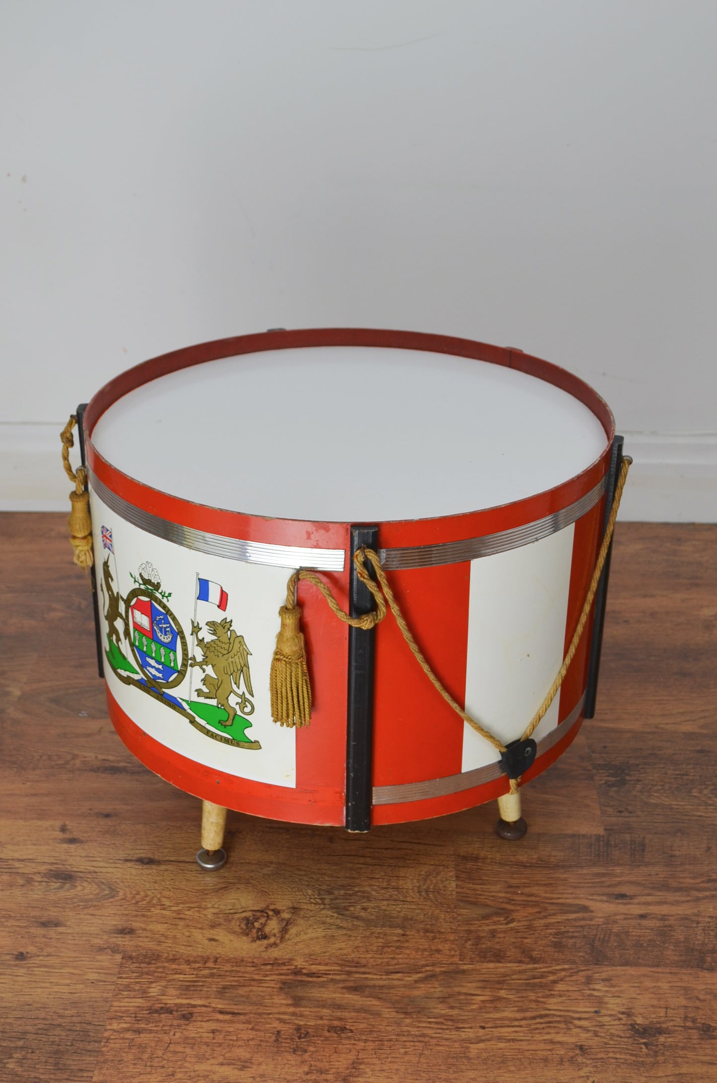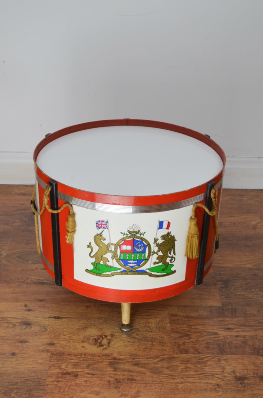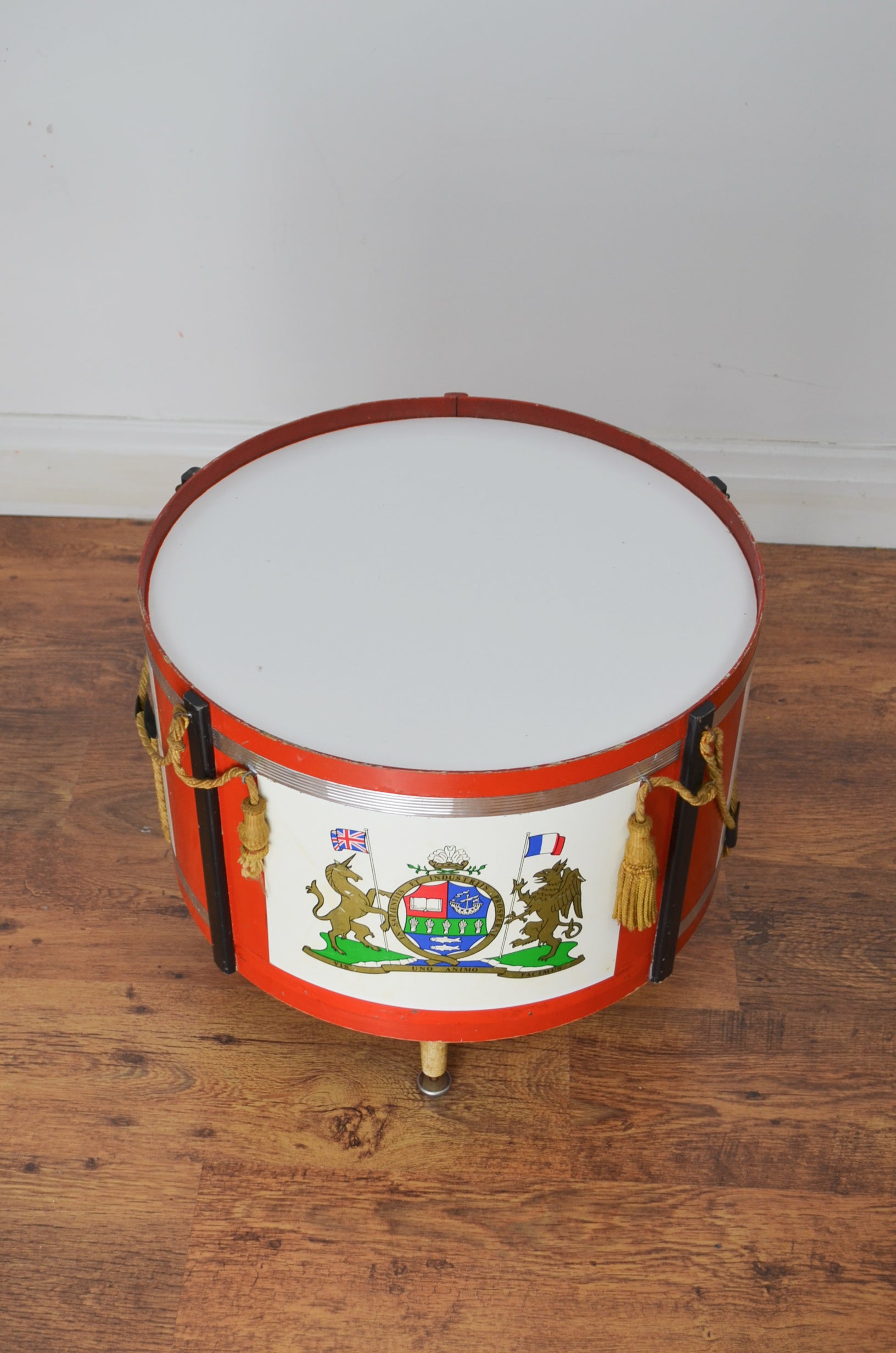 Britain and France crest drum table raised on splayed legs with silver band decoration and golden rope detail. Some latin inscriptions including 'with thy wisdom & with one mind'