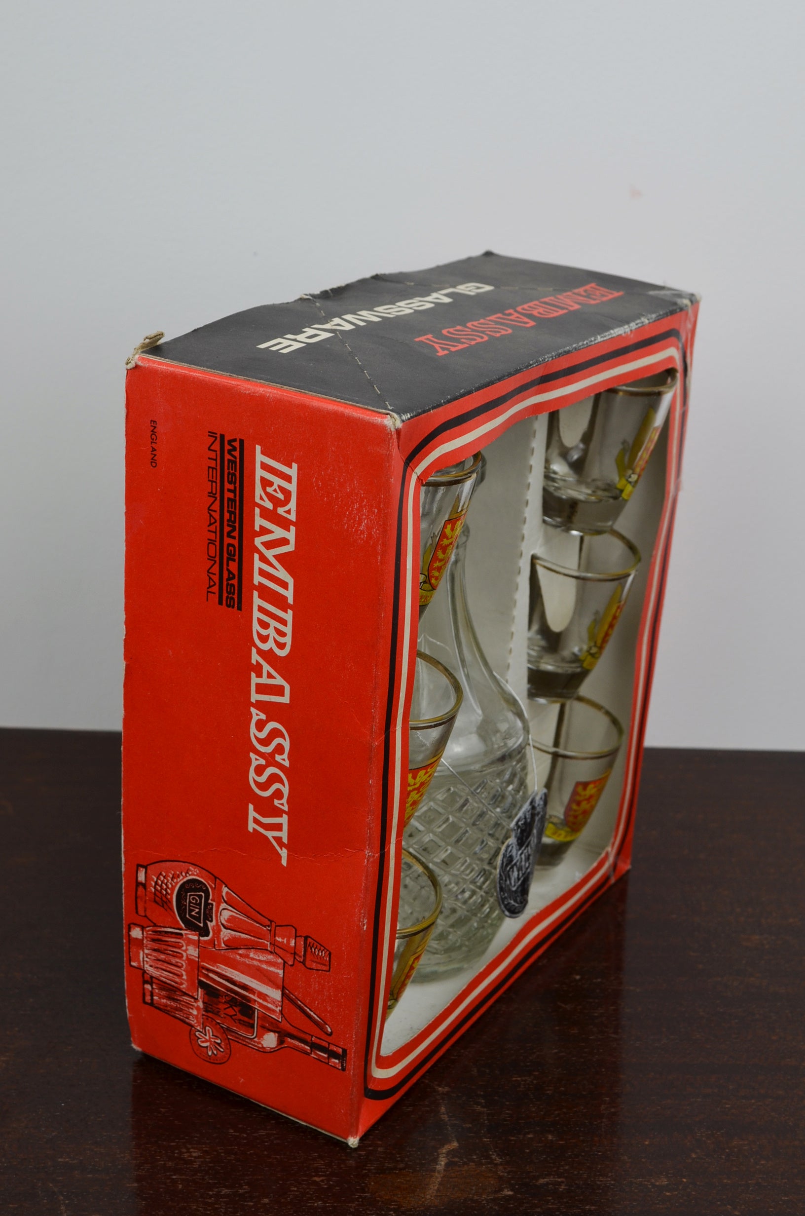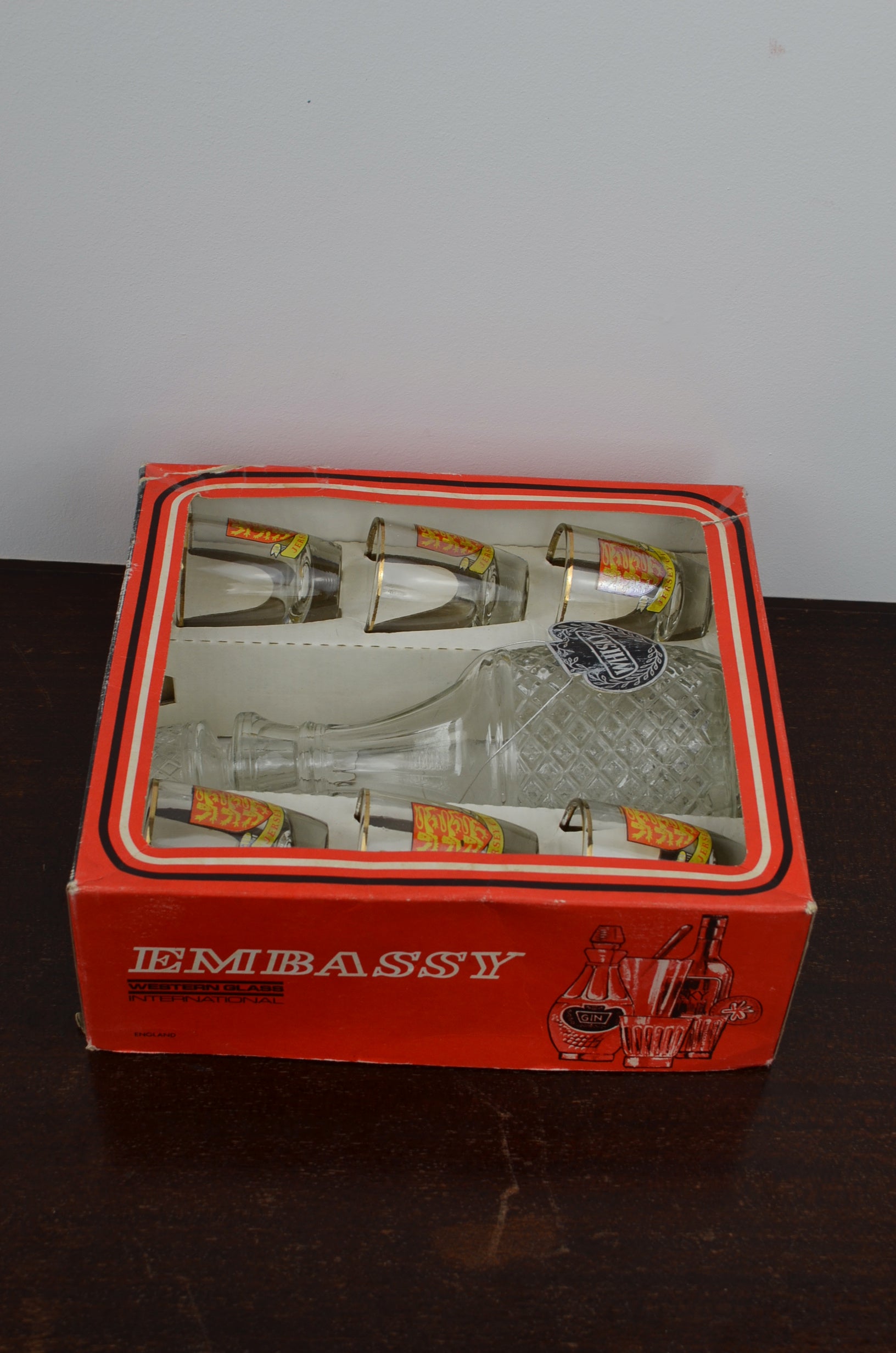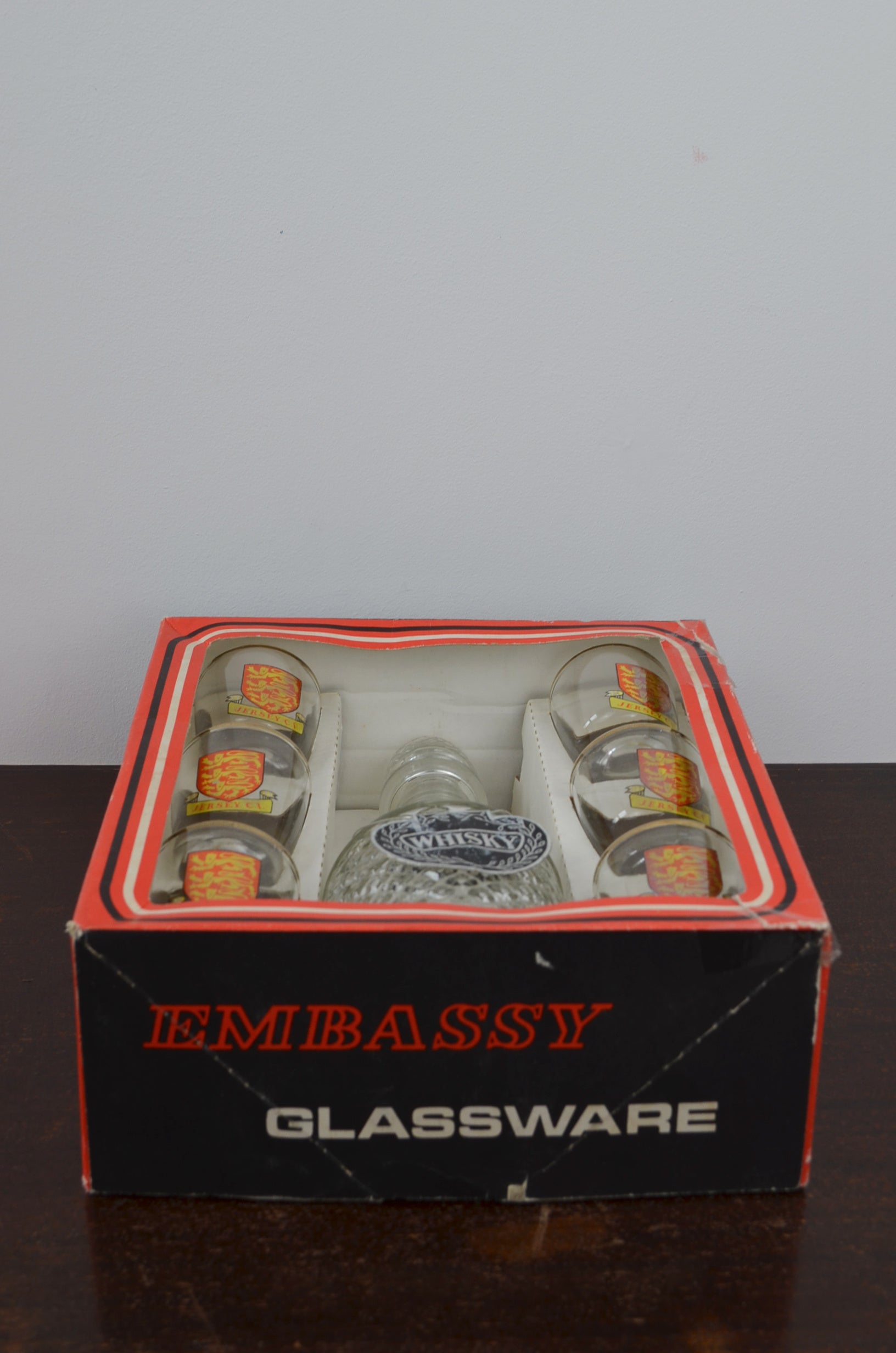 Embassy whiskey decanter with six crest shot glasses in original box. Great vintage condition apart from the box which has some damage as to be expected with age.