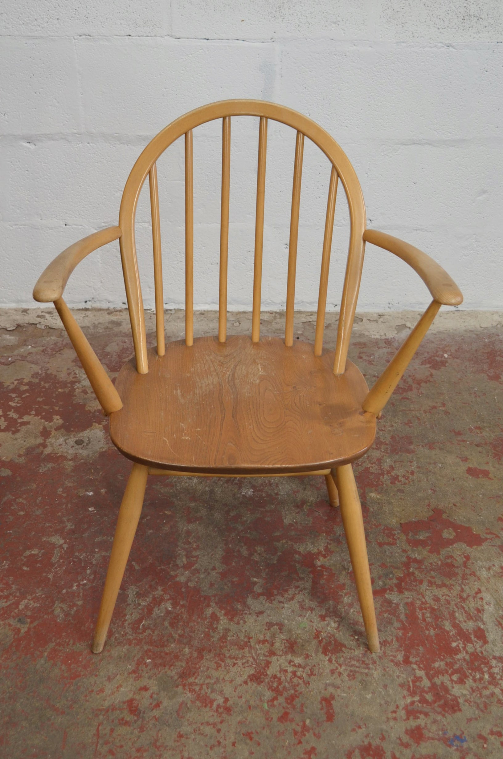A mid century Ercol Windsor carver chair. Comprising of beach frame and elm seat and boasting the iconic and distinctive design and workmanship expected from Ercol. (blue label)