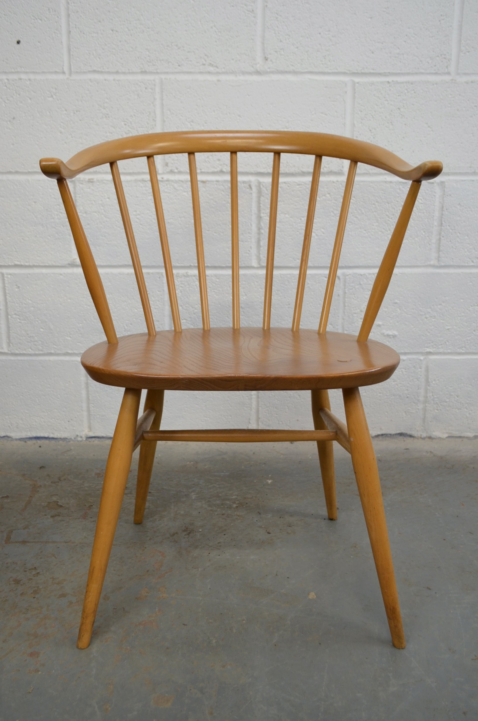 A rare mid century 1960/70s Ercol 449a Windsor 'cowhorn' bow top armchair/carver chair. Solid elm and beech, polished natural colour, wax finished with blue label.
