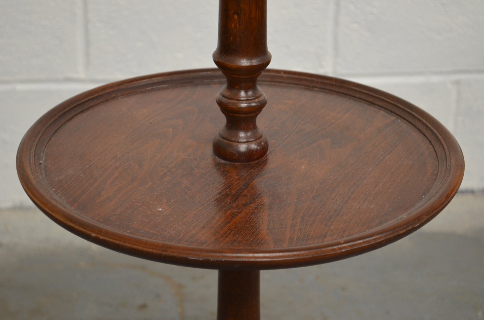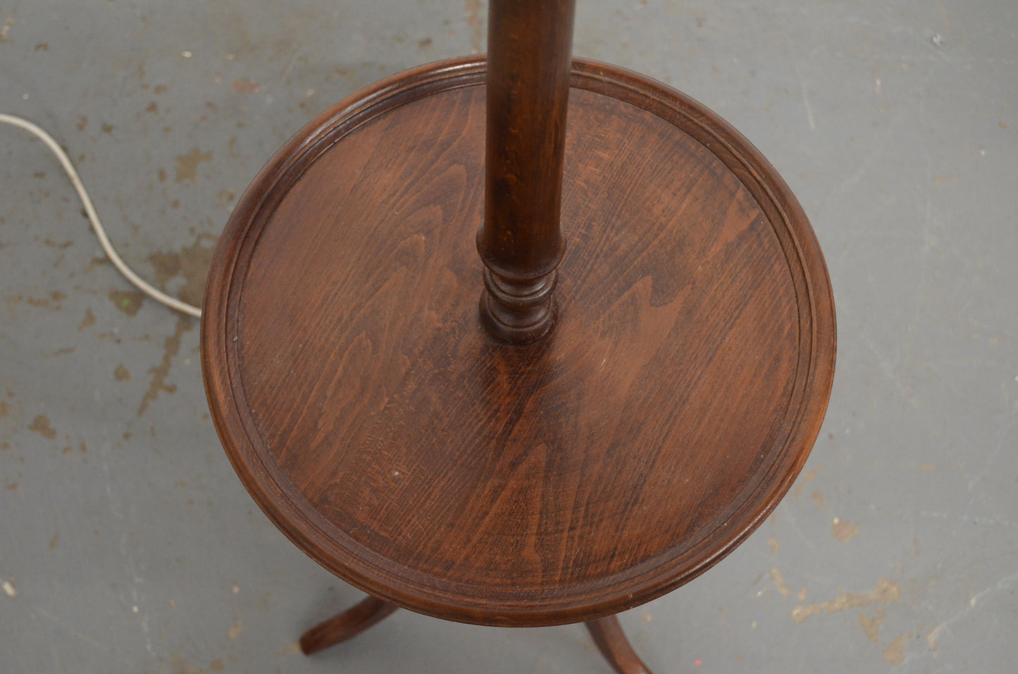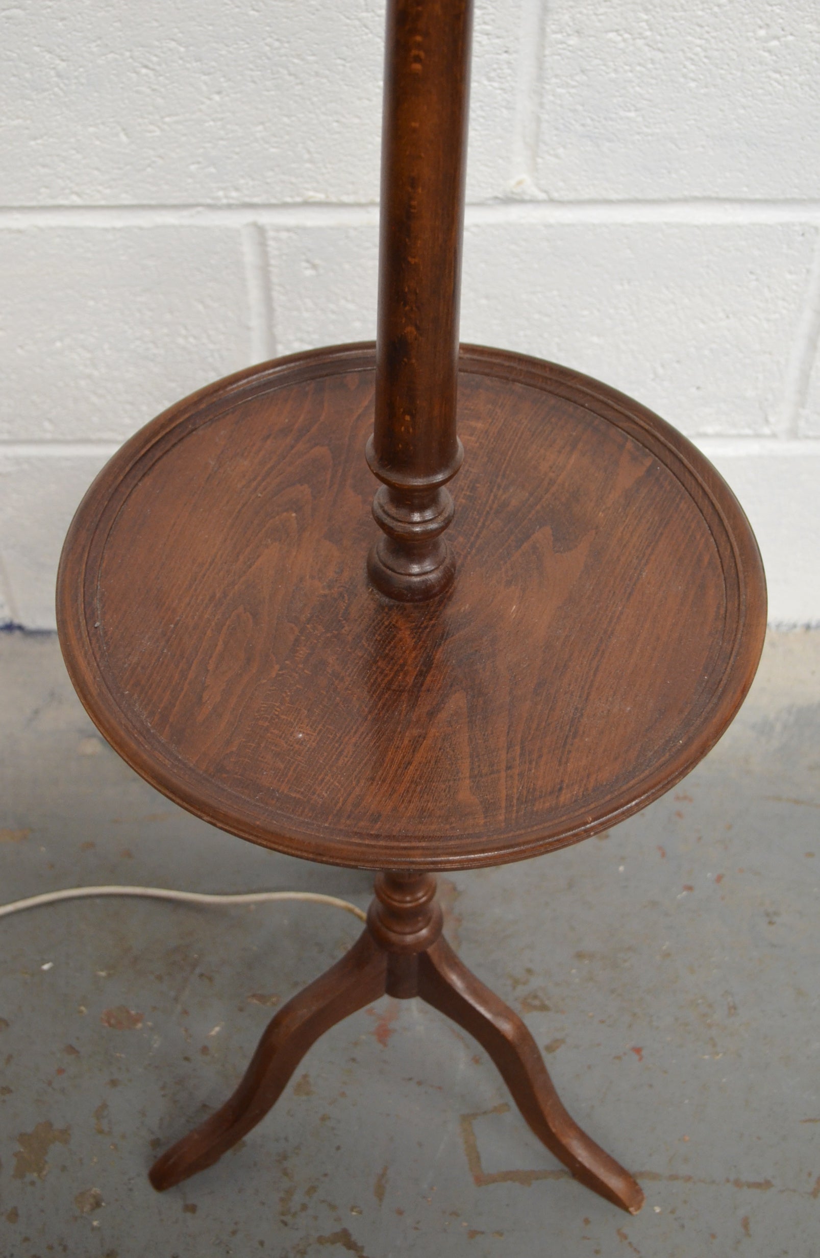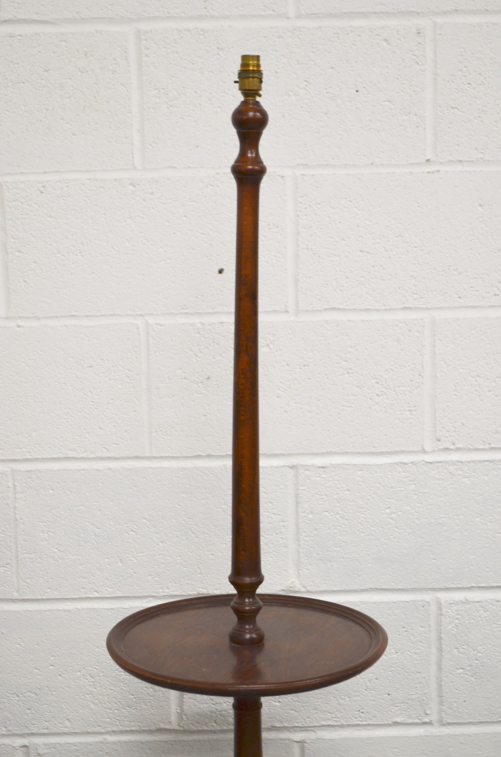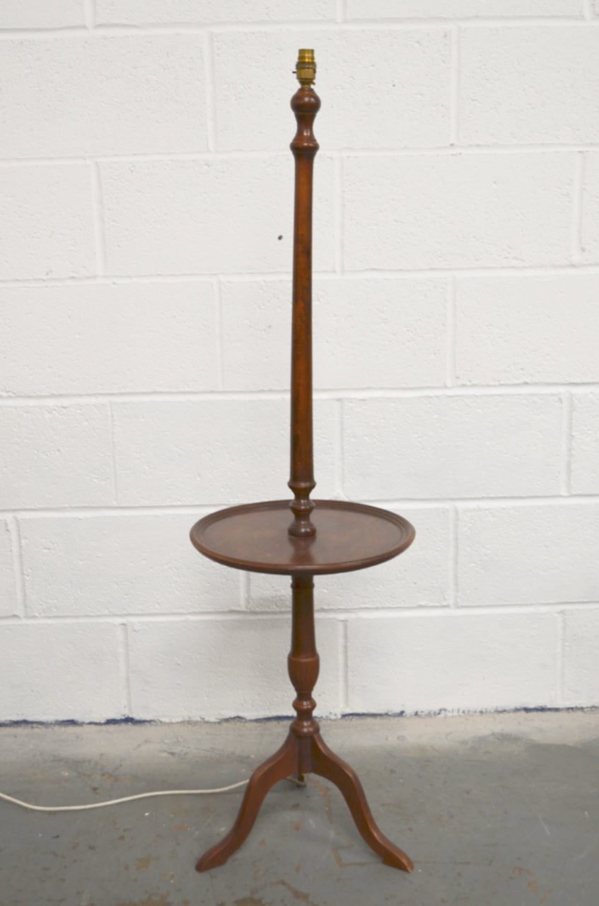 A vintage, antique style floor lamp possibly mahogany with wine table to the centre, raised on three splayed legs.