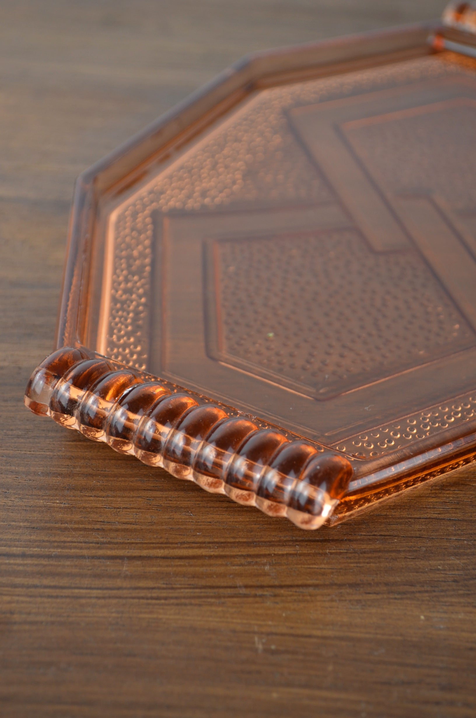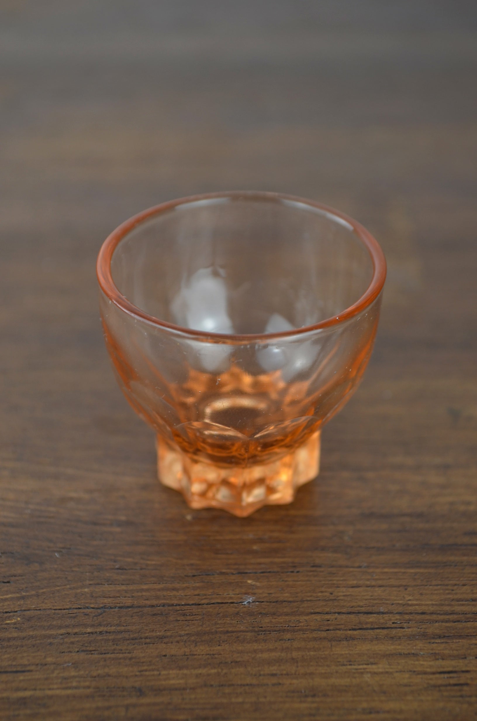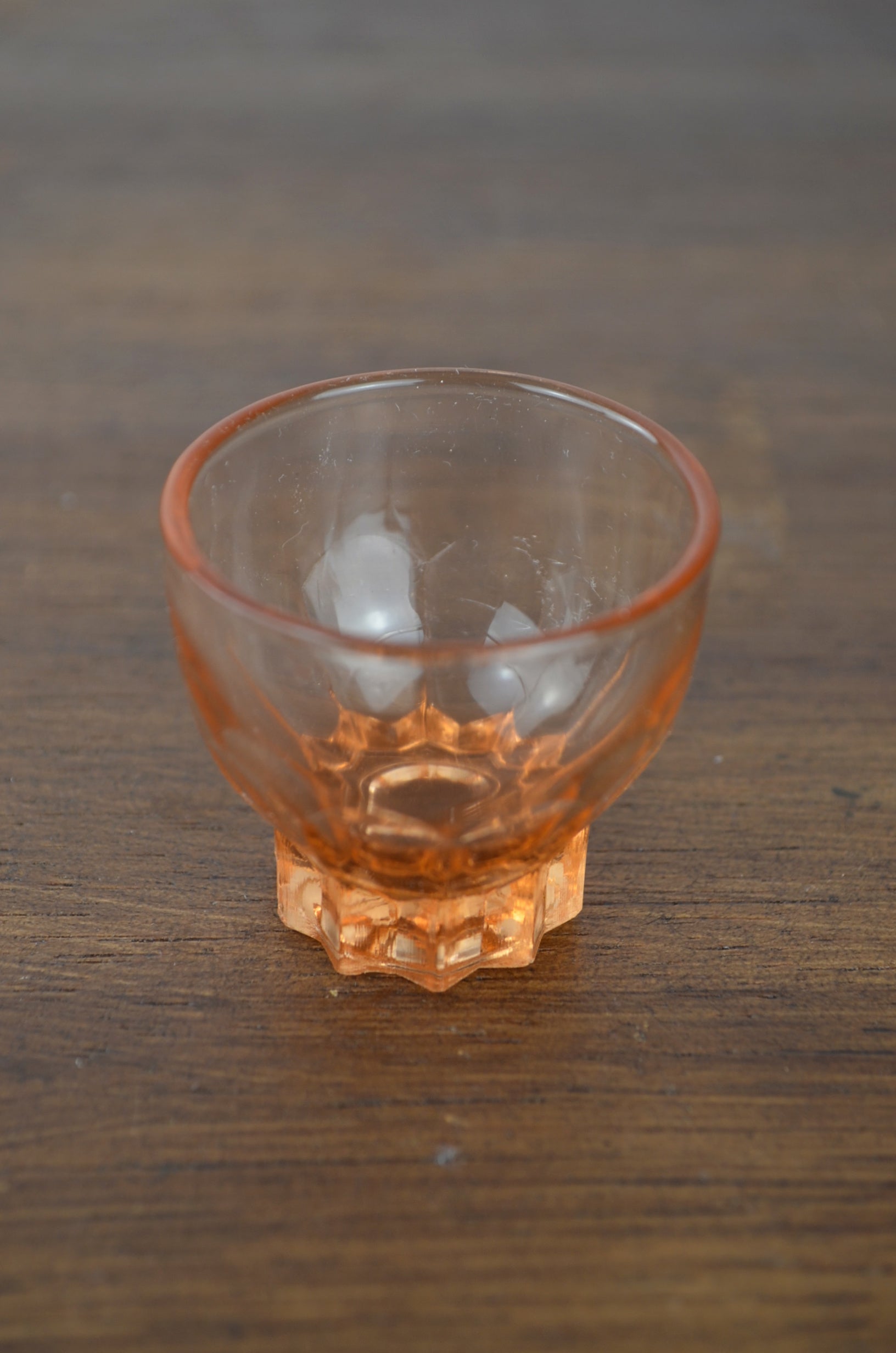 Set of six after dinner liqueur glasses with matching tray. Beautifully delicate pressed glass, pink French art deco style with detail particularly on the tray.