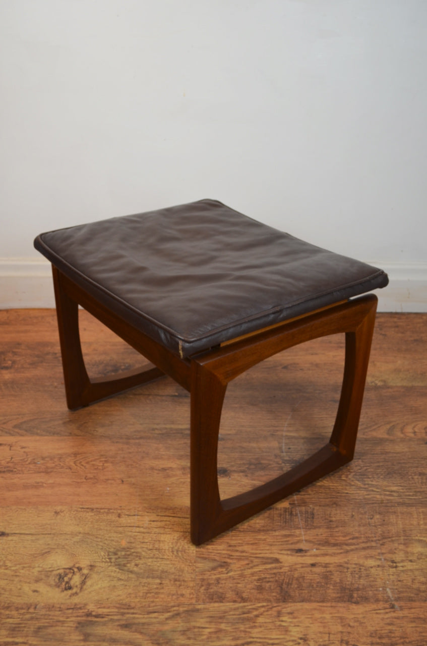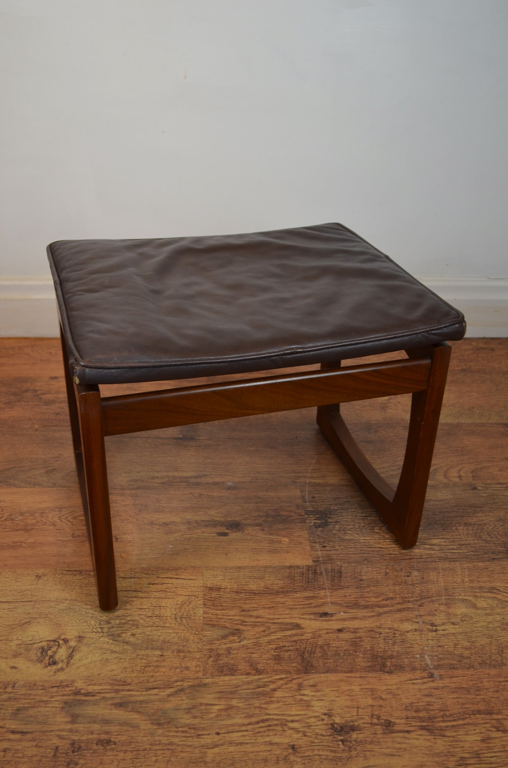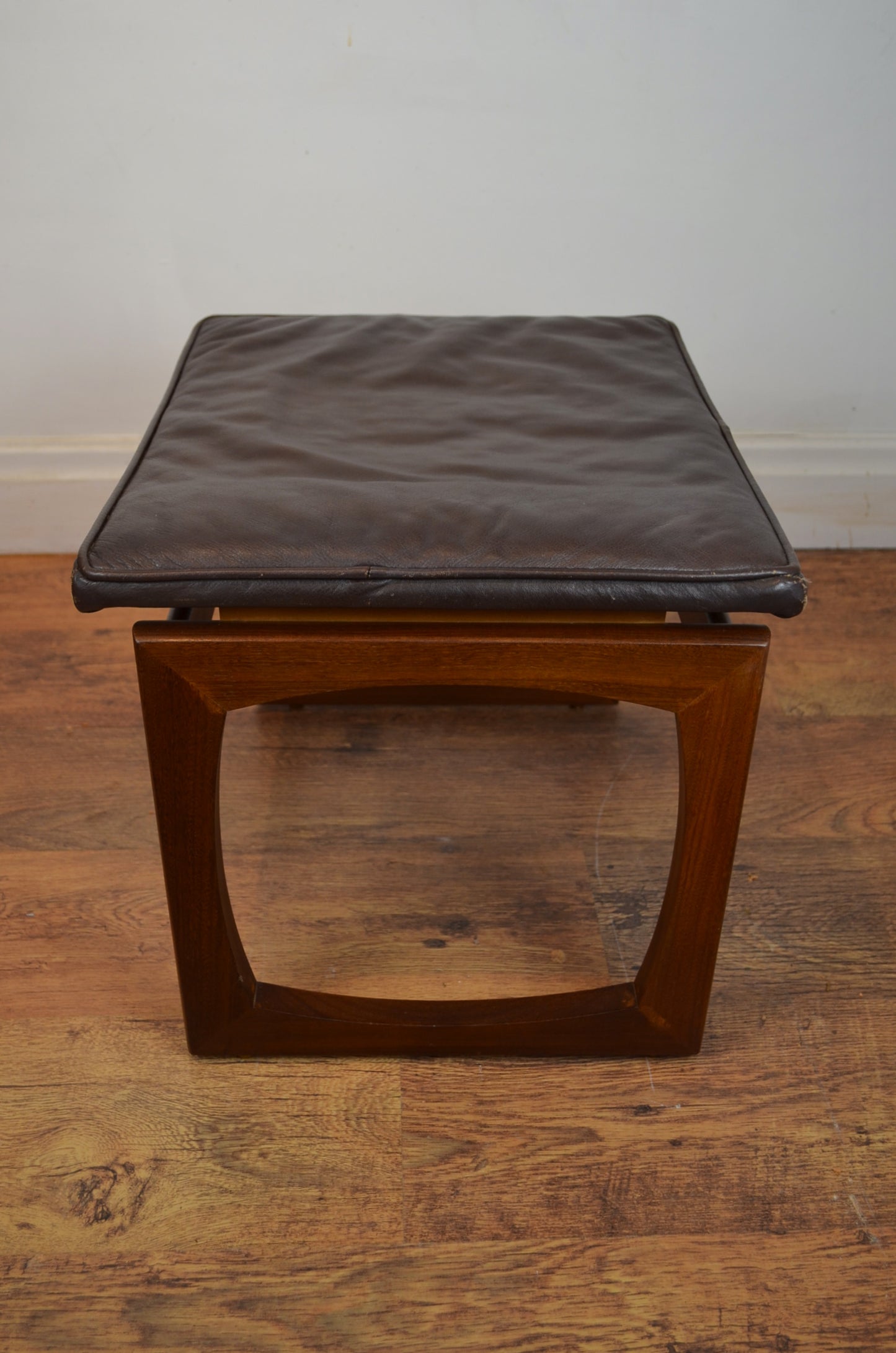 G Plan - Quadrille - A vintage mid 20th Century dark teak stool. Rectangular form with leather cushioned top on quadrille legs with stretcher supporting.