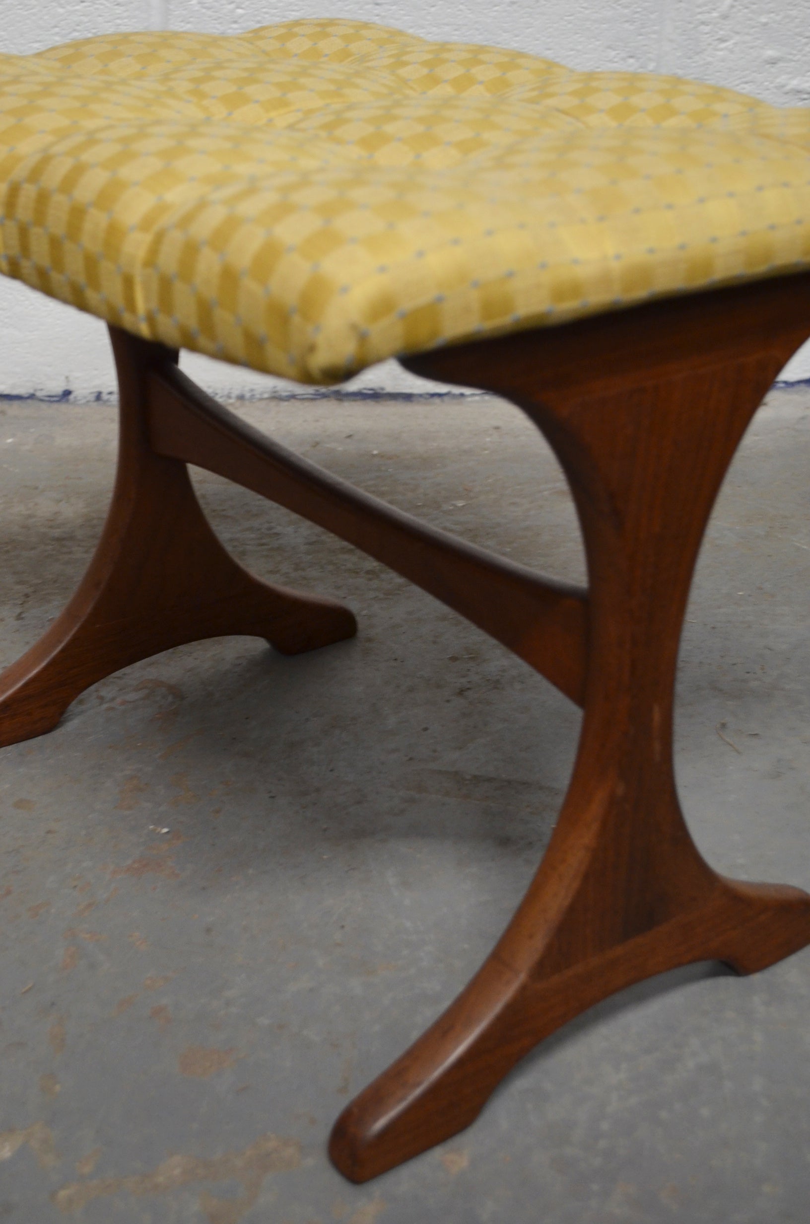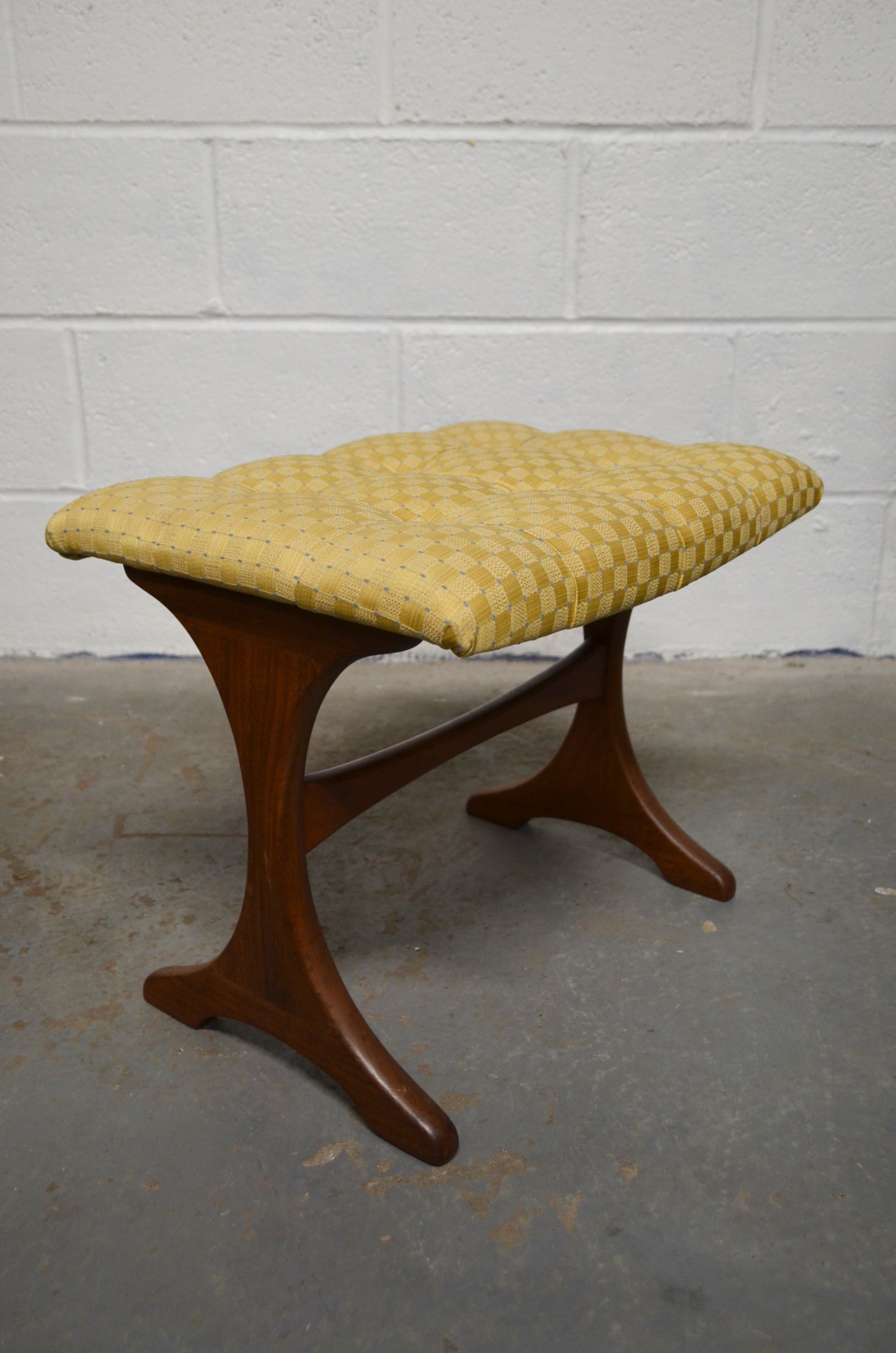 G Plan - A vintage mid 20th century circa 1960s teak dressing table stool. The stool having tufted upholstered cushion seat over a trestle type whale tale supports united by stretcher.