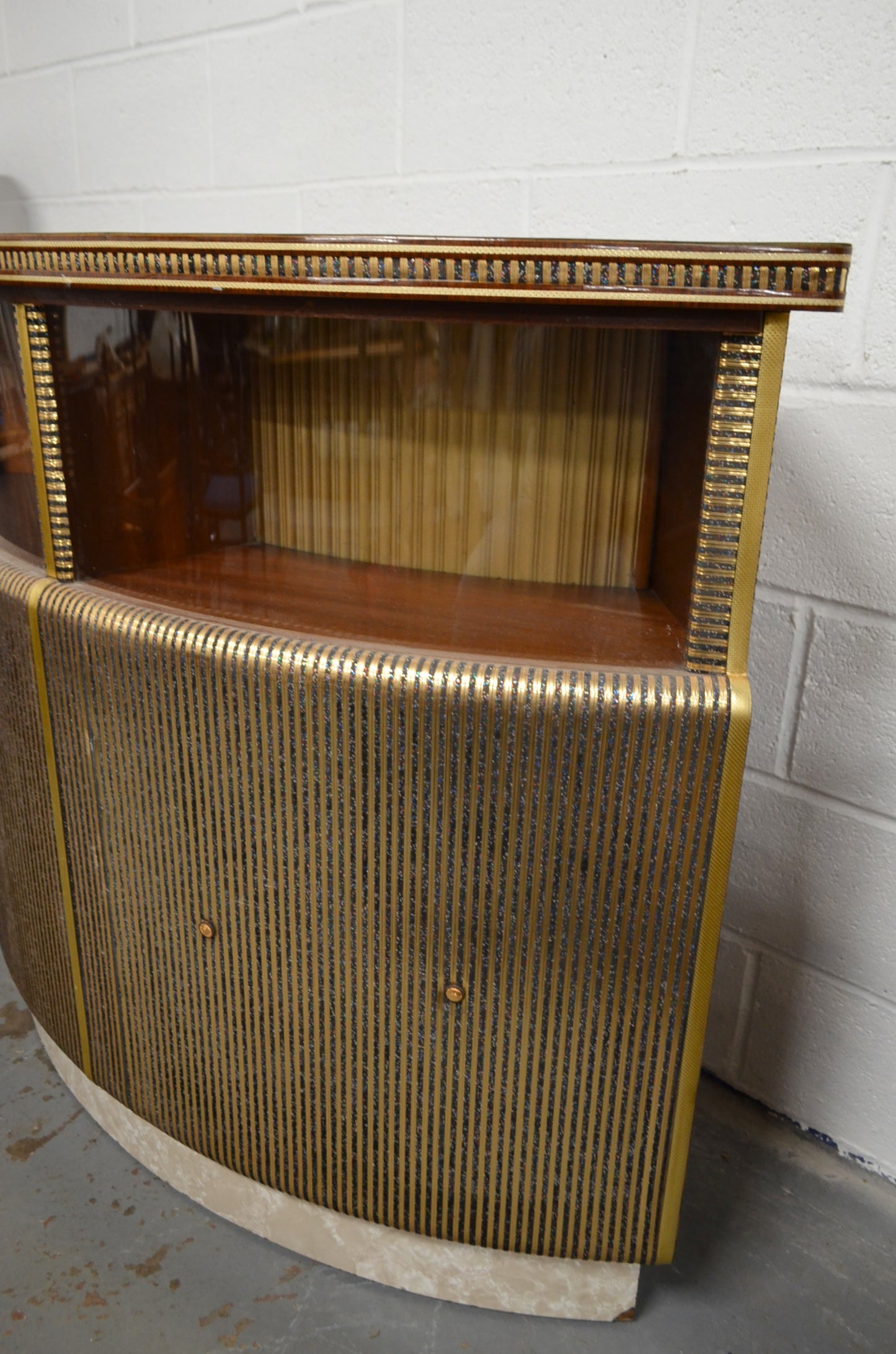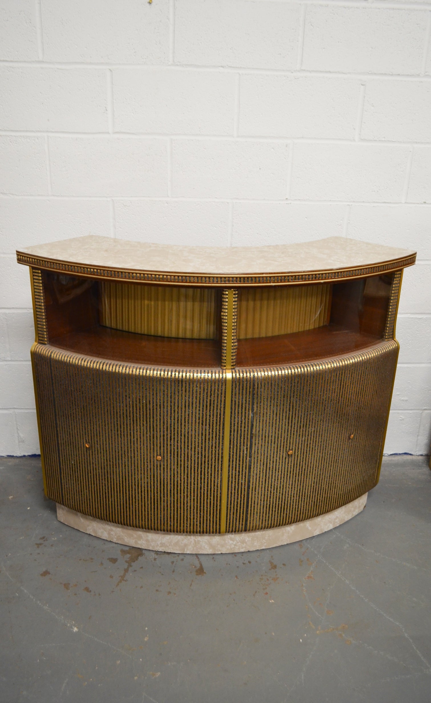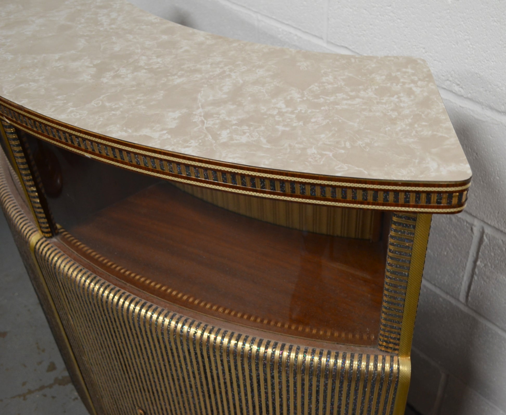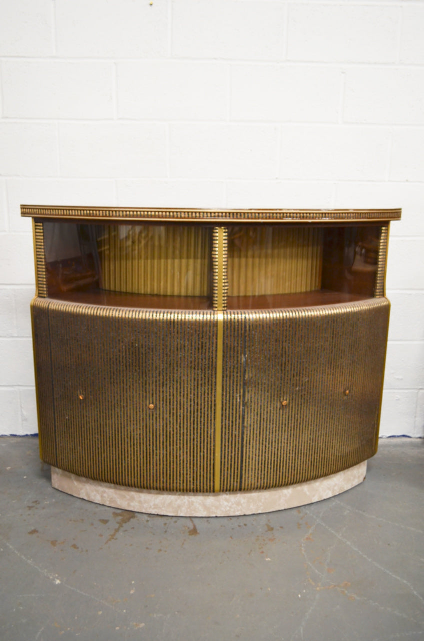 A mid 20th century bow fronted home cocktail / wine drink bar having a formica marbled top with curved glass windows to the front. The reverse of the cabinet having a series of sliding doors revealing cupboard sections. All with brass and glitter effect decoration throughout.