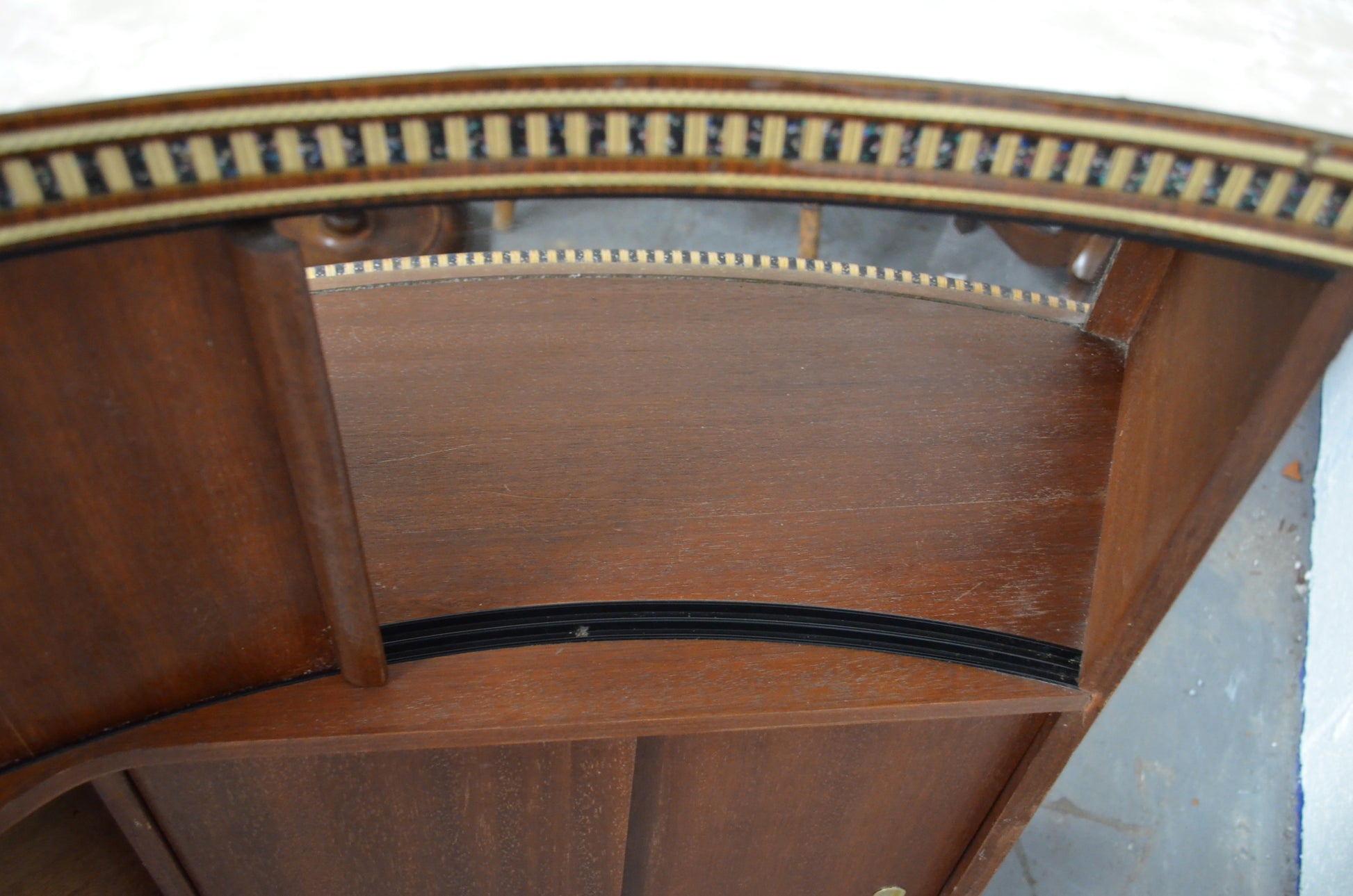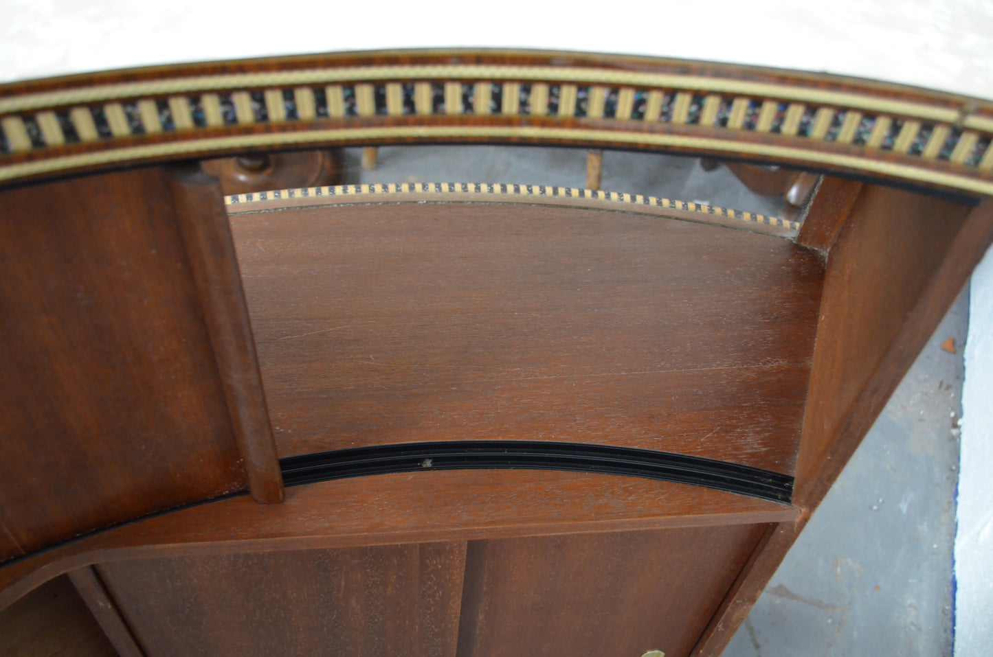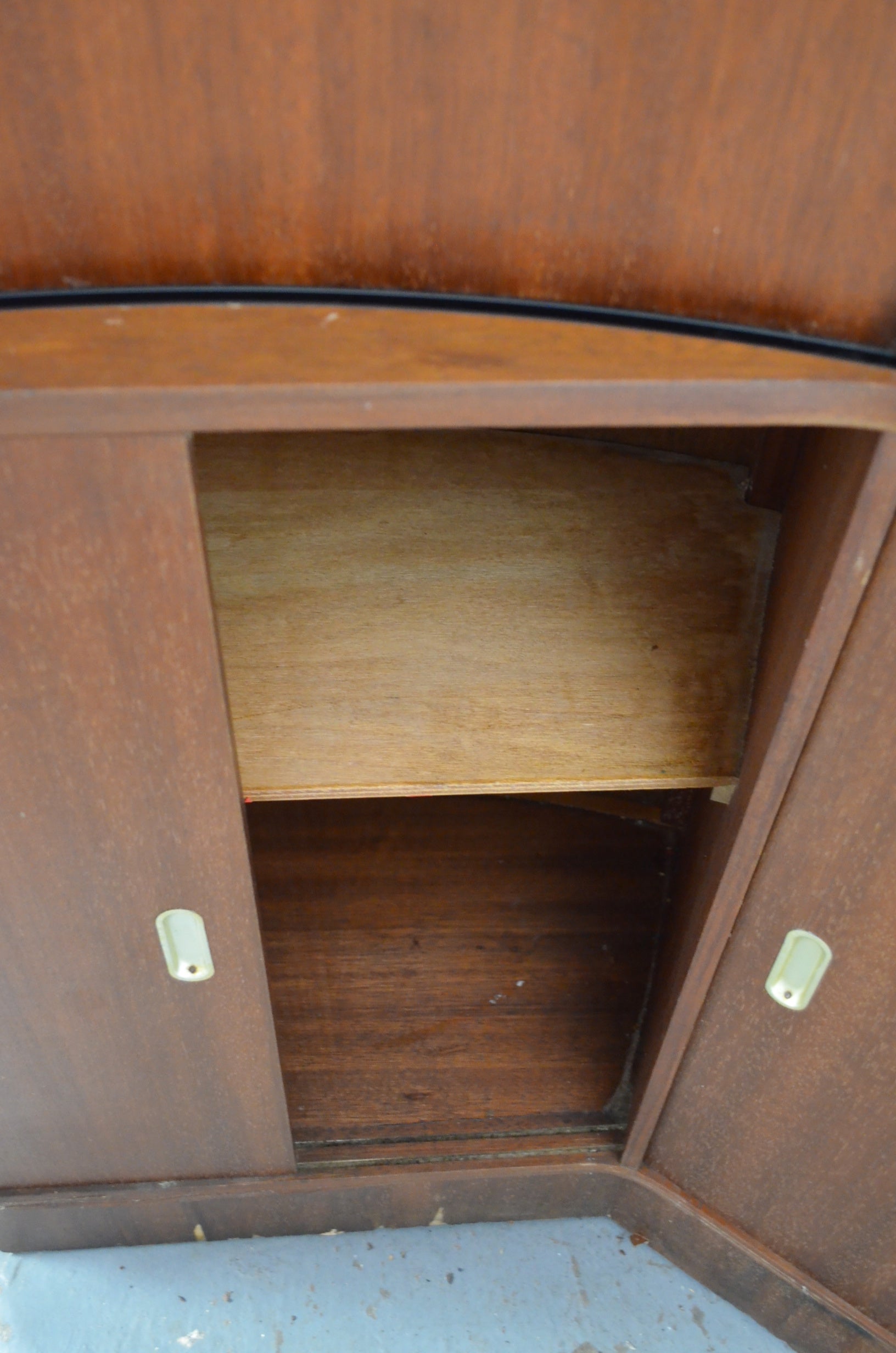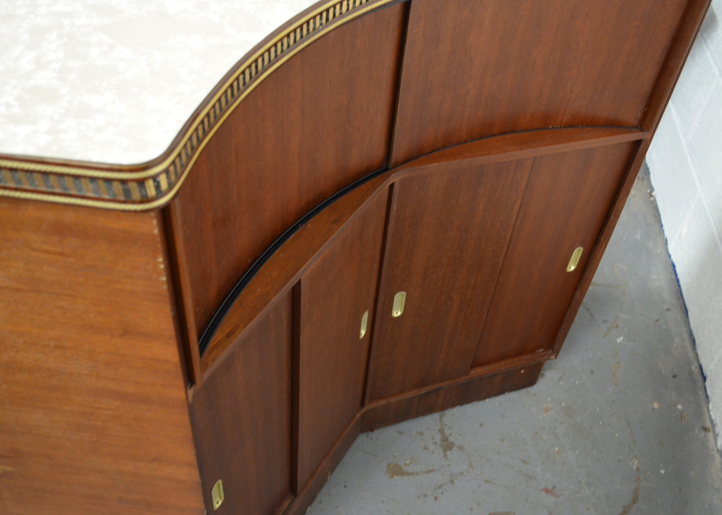 A mid 20th century bow fronted home cocktail / wine drink bar having a formica marbled top with curved glass windows to the front. The reverse of the cabinet having a series of sliding doors revealing cupboard sections. All with brass and glitter effect decoration throughout.