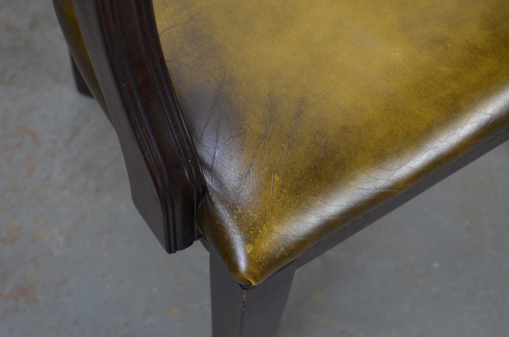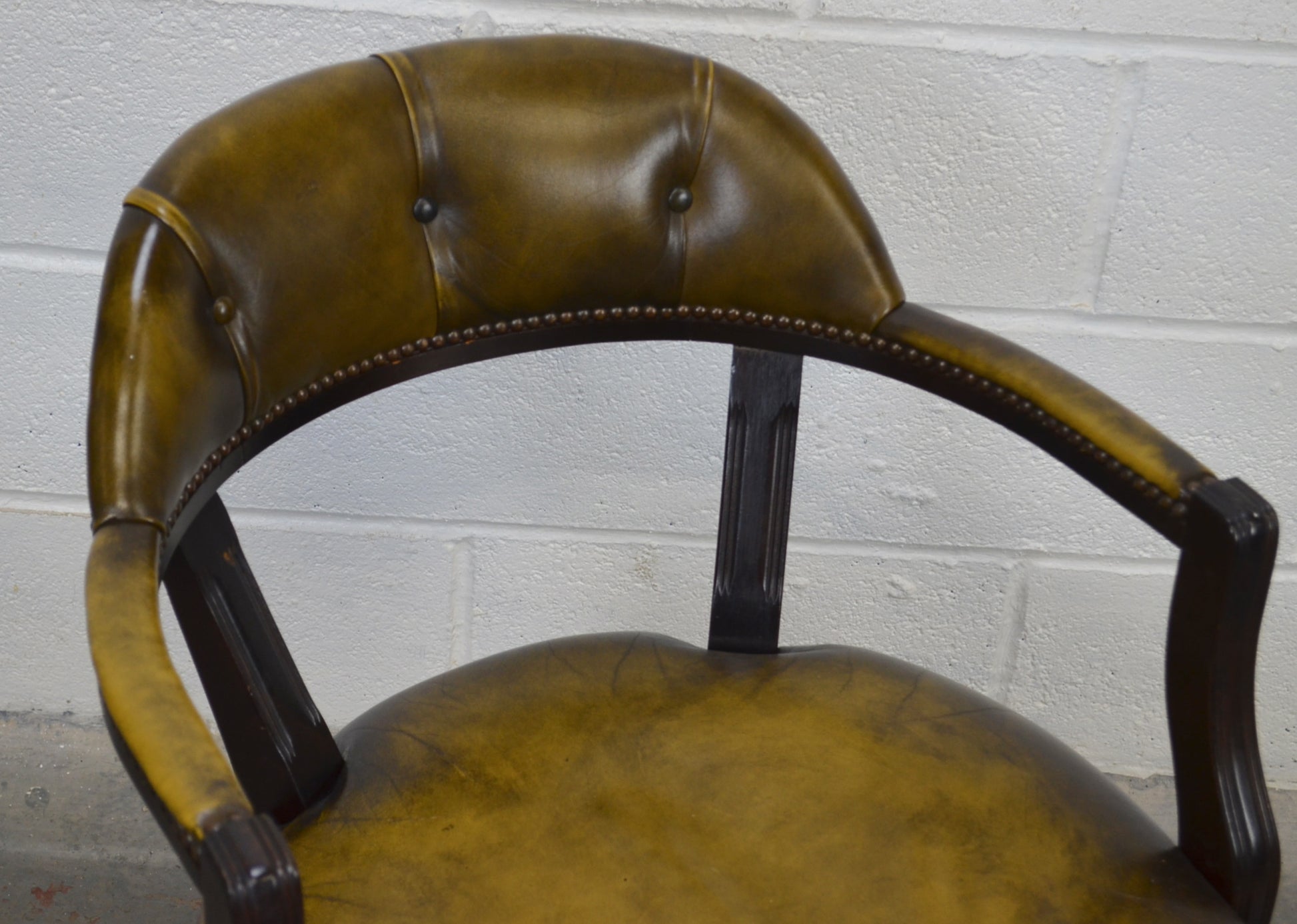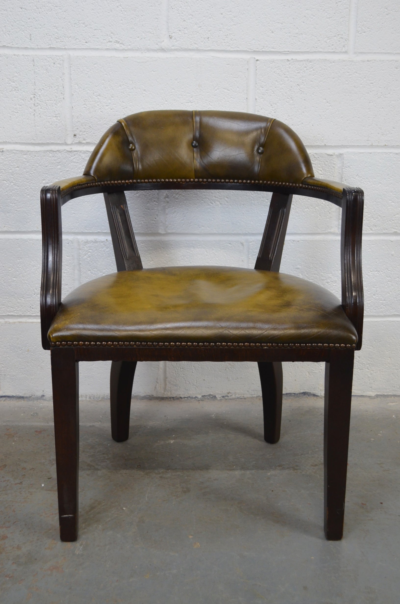 A vintage 20th century leather and mahogany antique style captains office desk chair. Raised on tapering legs with green leather upholstered seat and button backed back rest with studded edges.