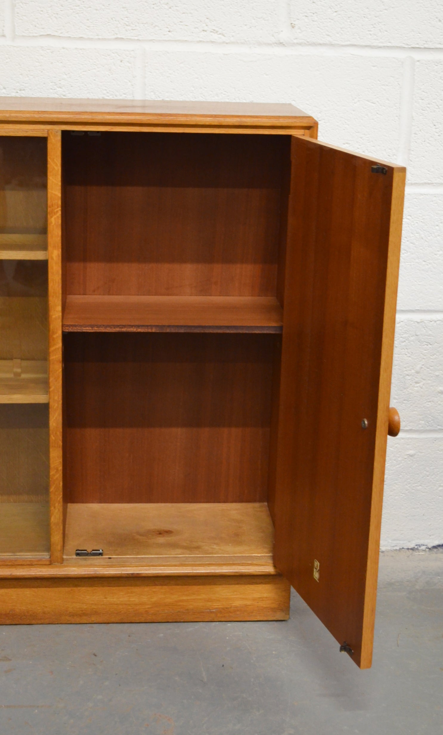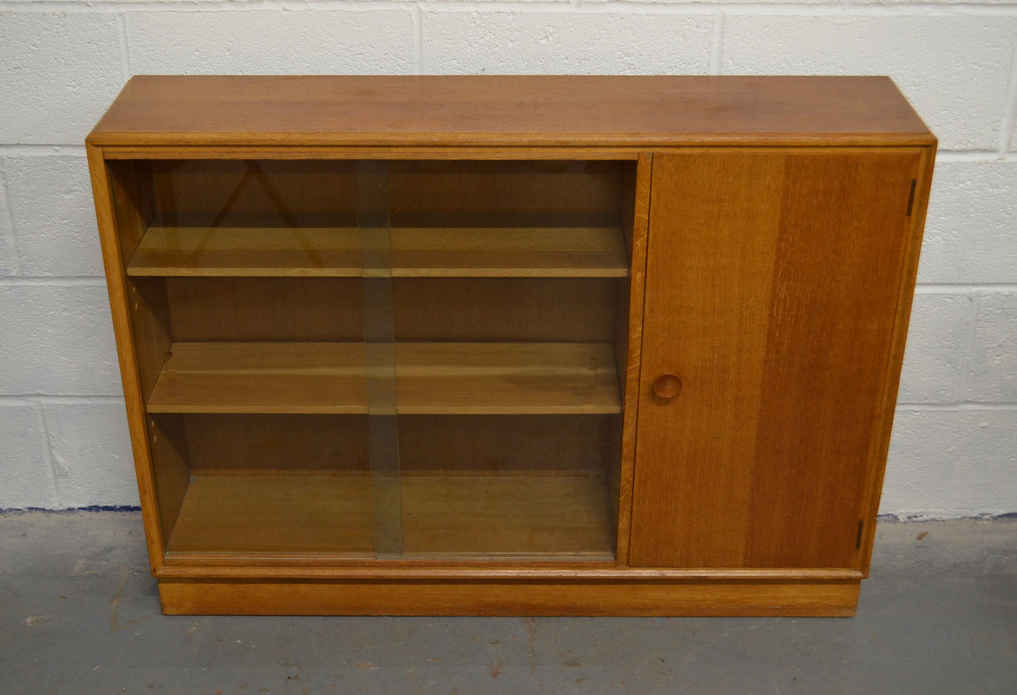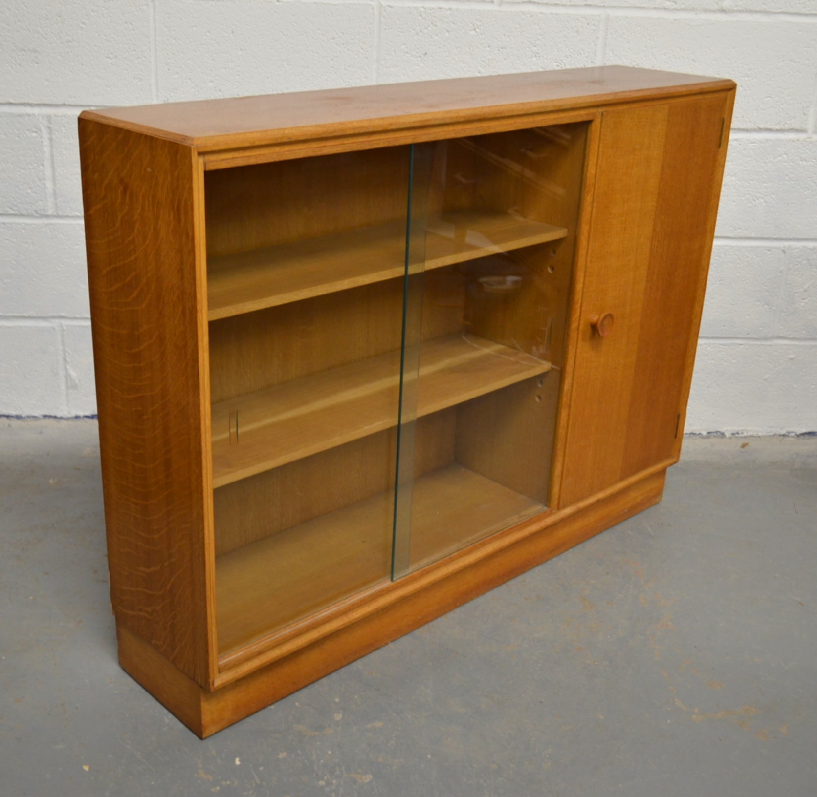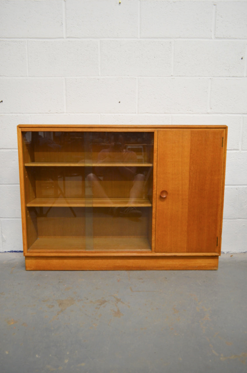 A vintage Meredew mid 20th century circa. 1960's light oak bookcase cabinet. The bookcase having twin glazed sliding doors aside a single cupboard, both opening to reveal shelved interiors, raised over a plinth base.