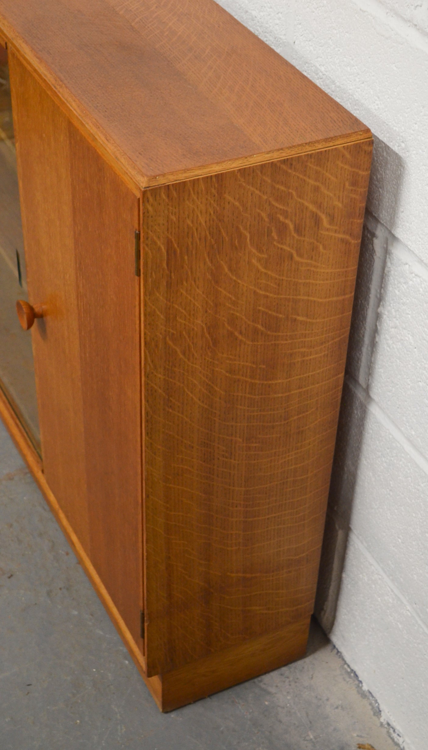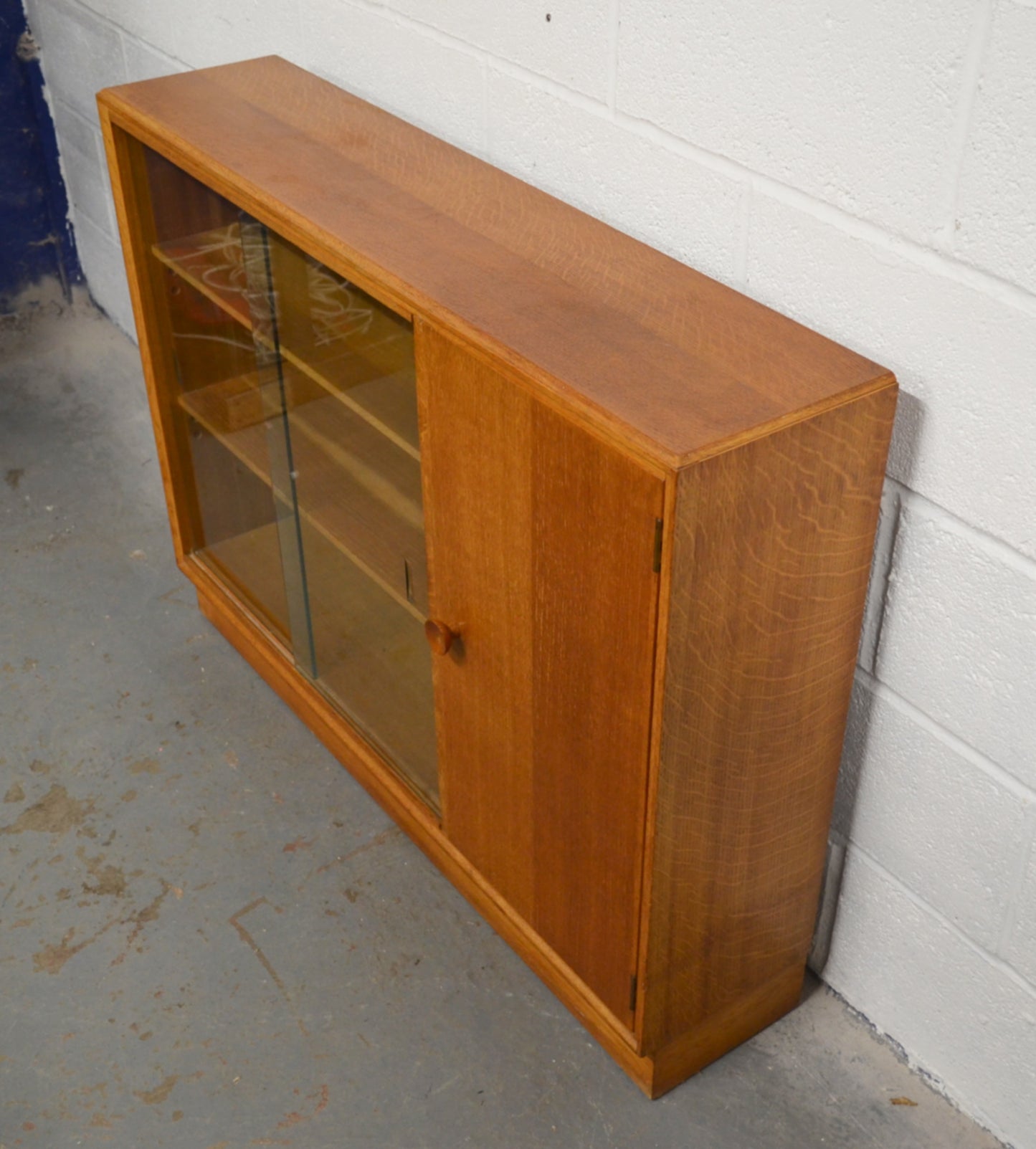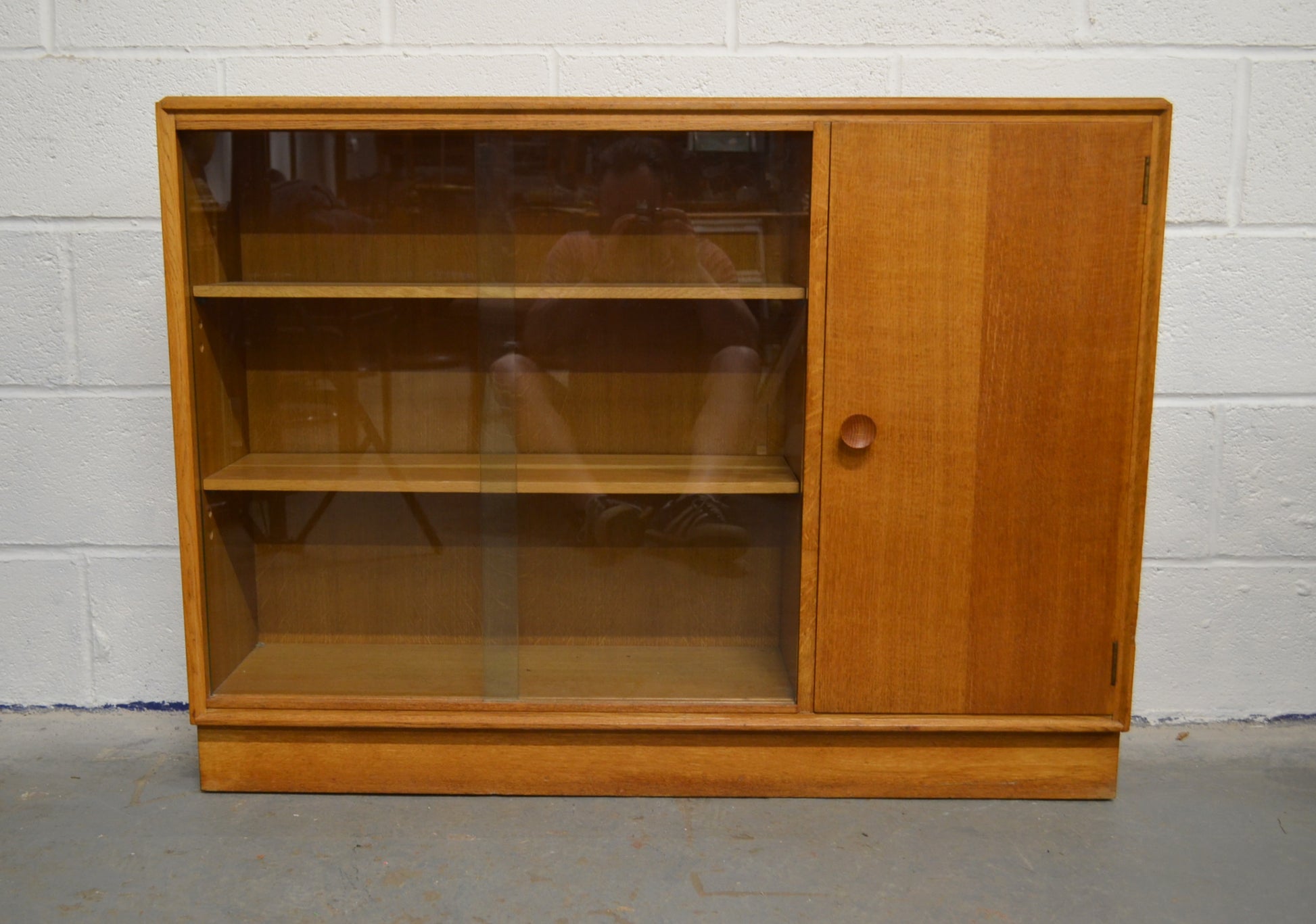 A vintage Meredew mid 20th century circa. 1960's light oak bookcase cabinet. The bookcase having twin glazed sliding doors aside a single cupboard, both opening to reveal shelved interiors, raised over a plinth base.