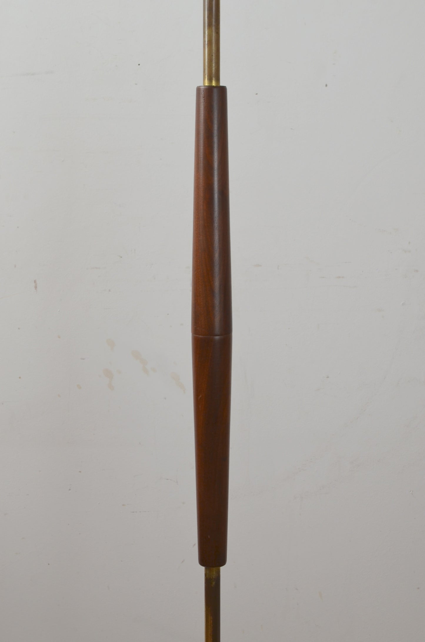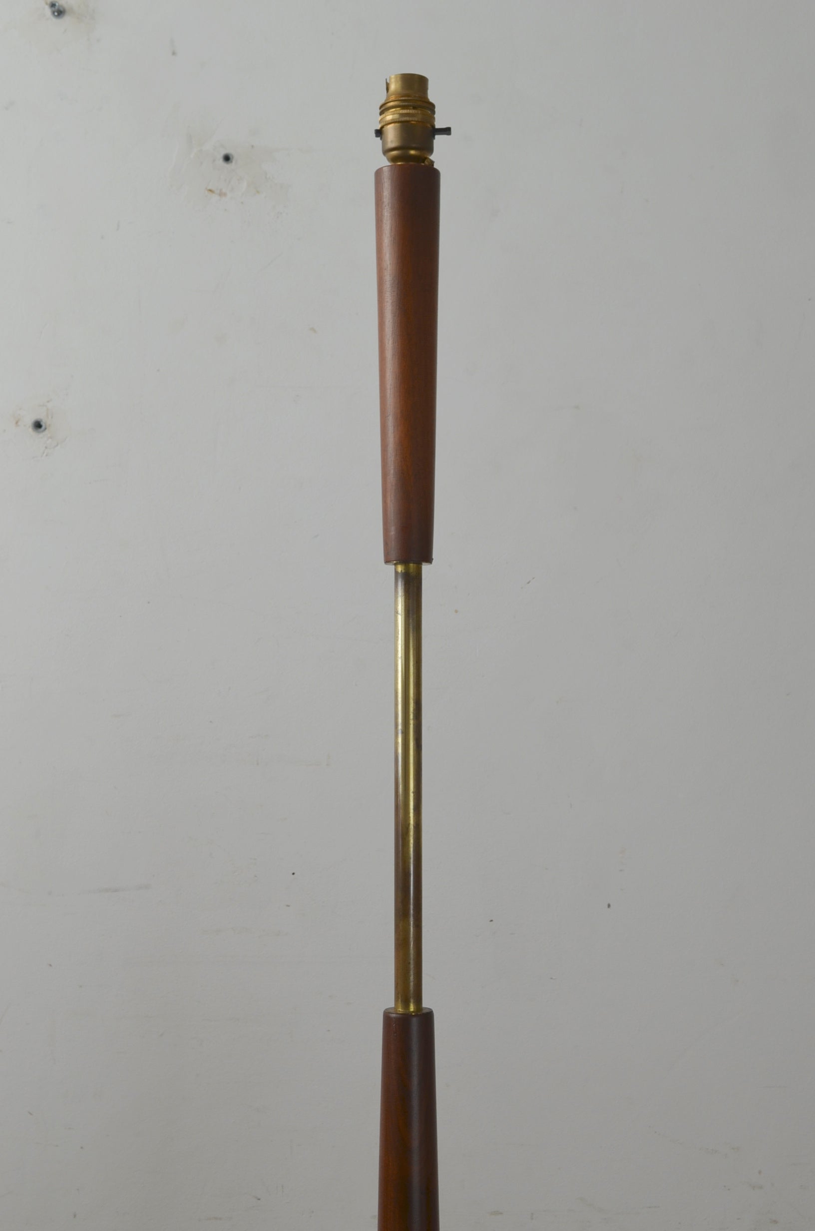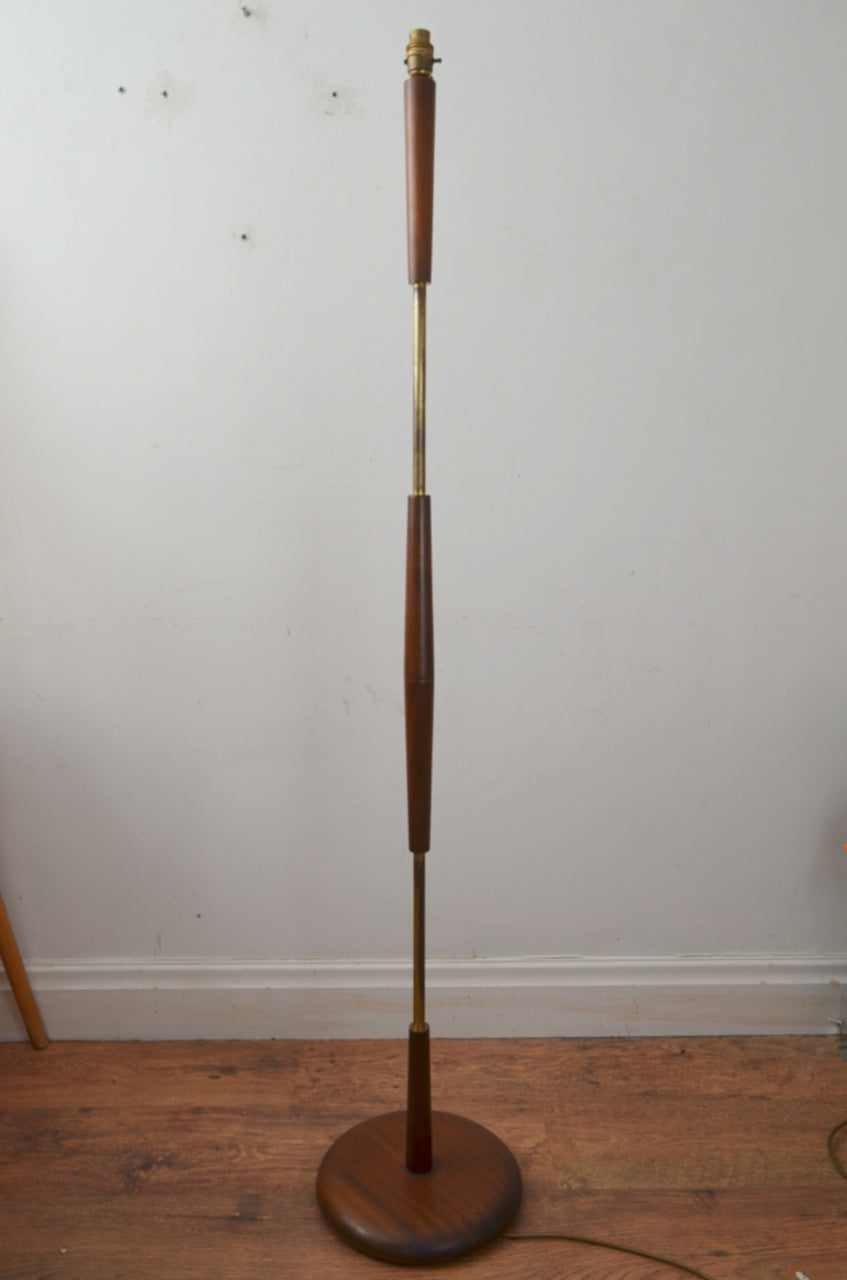 A vintage mid century teak floor lamp with graduating column consisting of teak wood and tubular metal. A taller than normal version.