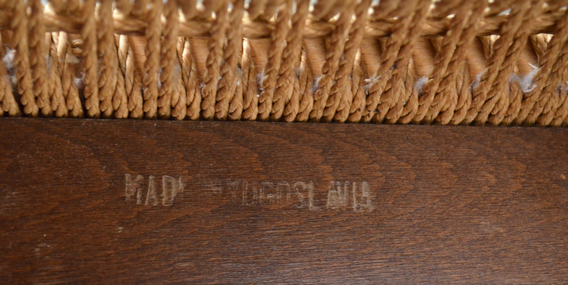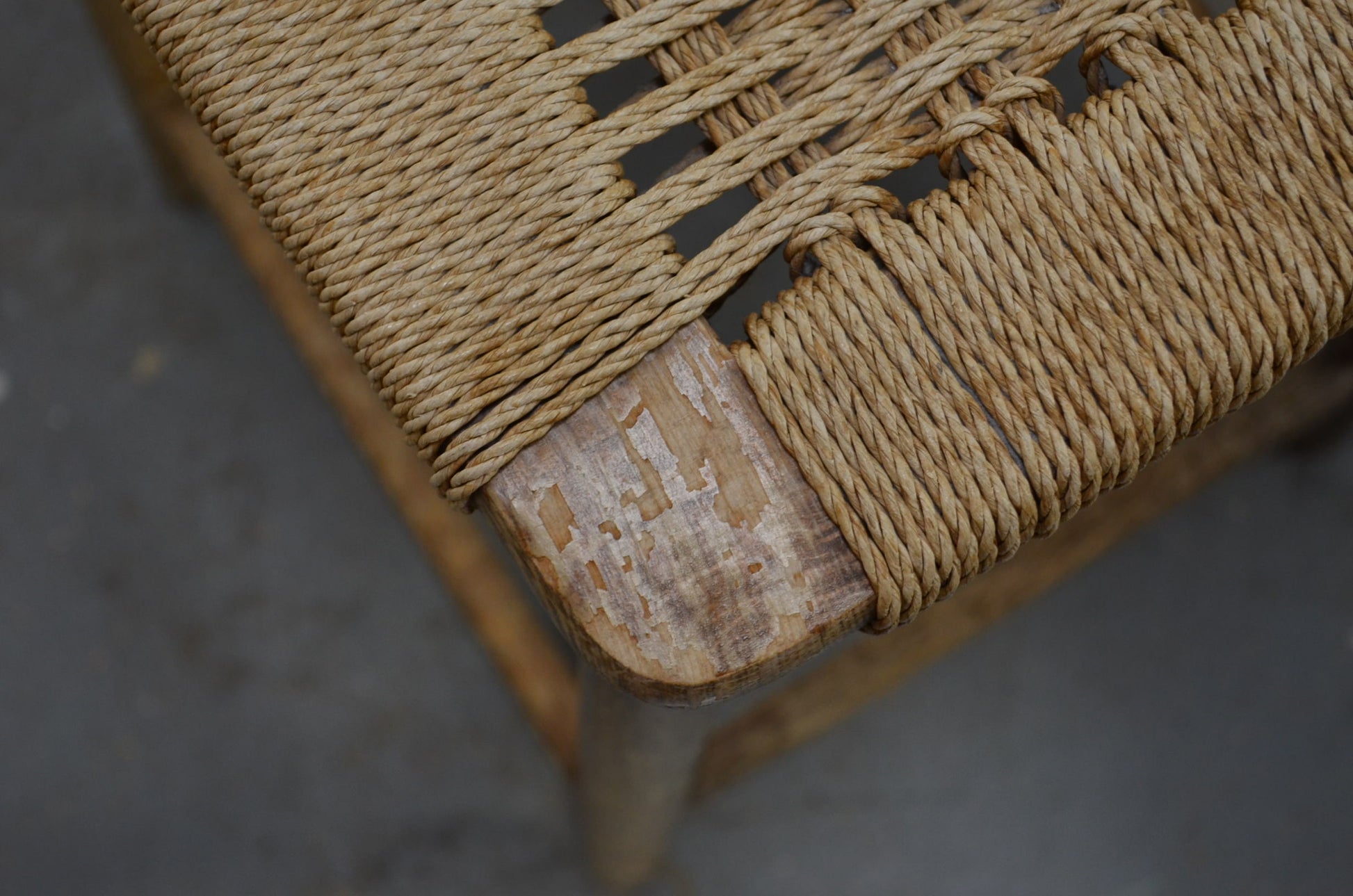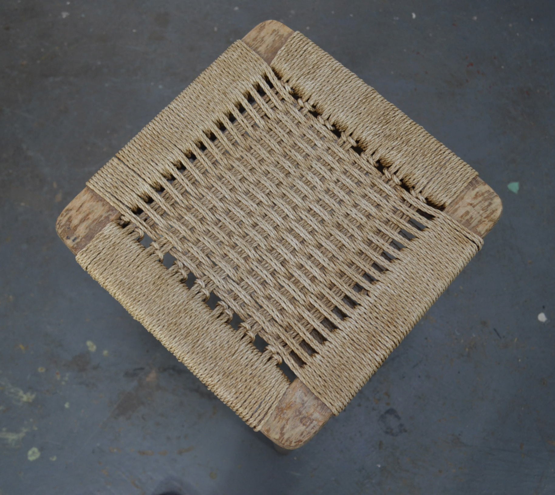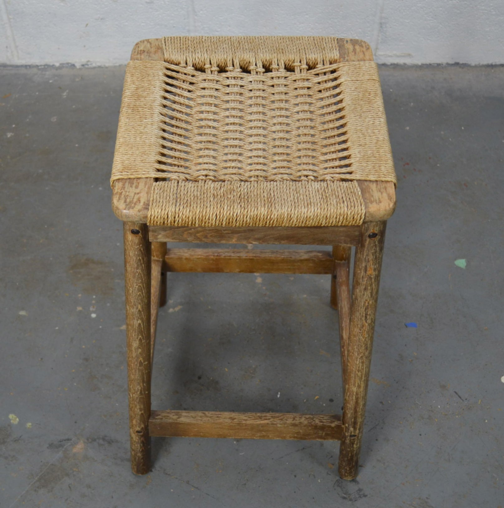 A vintage mid century stool made with wood and cord seat in the manner of Hans J Wegner. Has all the little details and quality of Wegner stools with makers mark of Made in Yugoslavia underneath rather than Denmark.