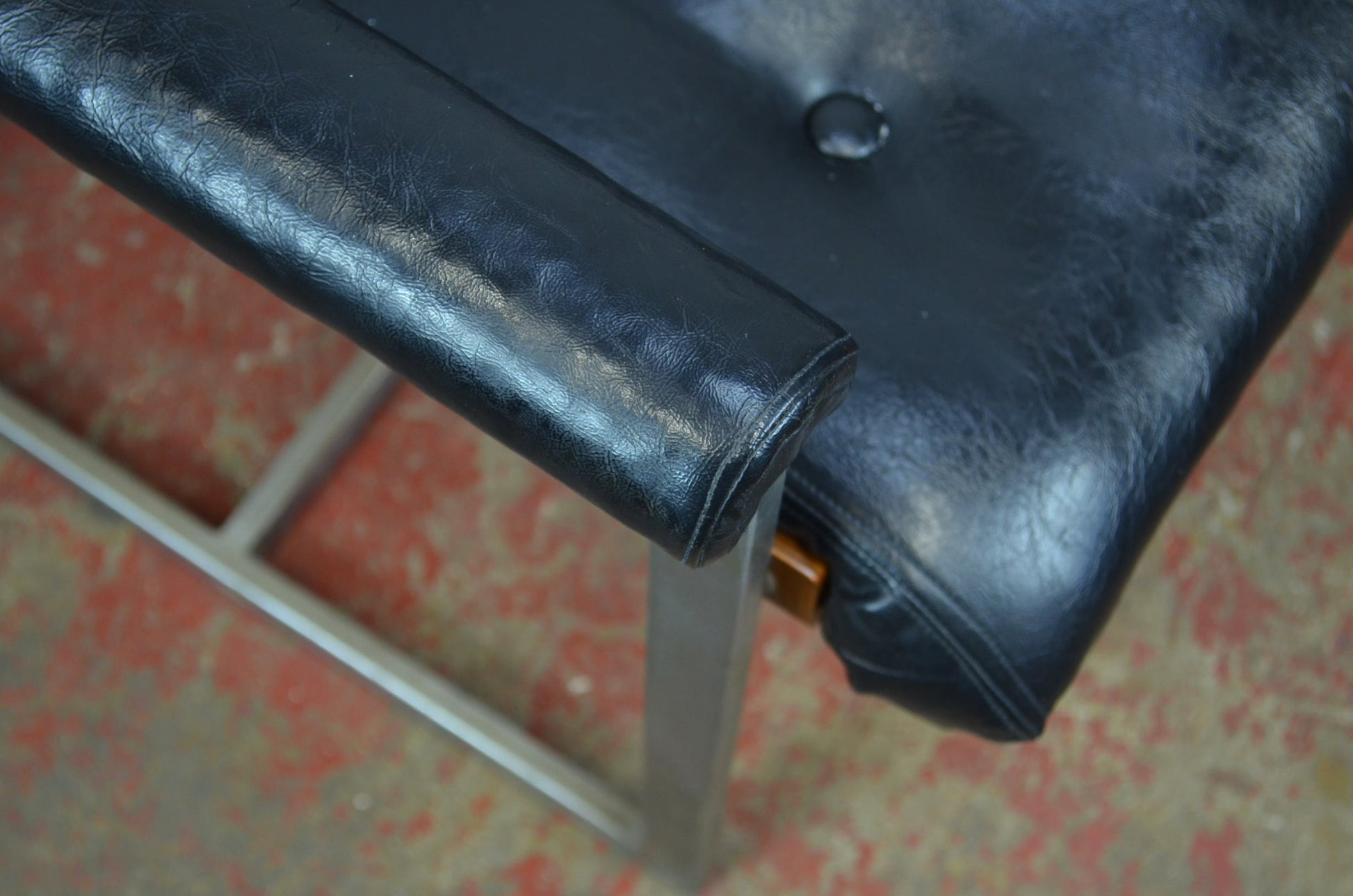 A vintage mid century modern leather and bent wood arm chair with square steal frame. A rare chair that is attributed to designer William Plunket and from either Eglin or Antocks Lairn. I have a few of these in stock and can confirm they were used with an Eglin table in a board room and were purchased in the mid 1970s.