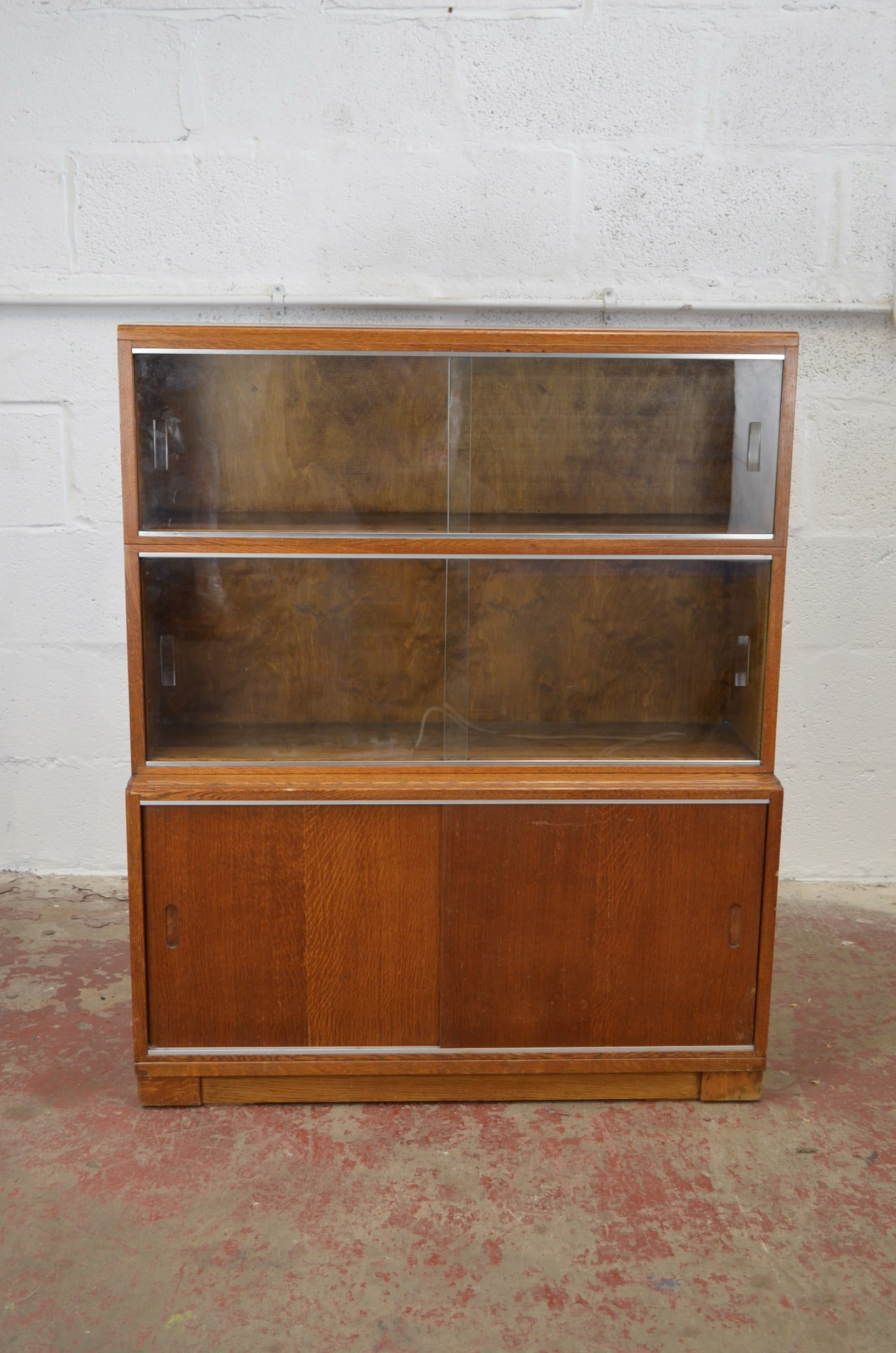 A vintage mid 20th Century bookcase by Minty of Oxford. The bookcase having a pair of glass sliding doors with cut in handles over two large shelf spaces. Below are sliding wooden doors with great grain and cut handles.