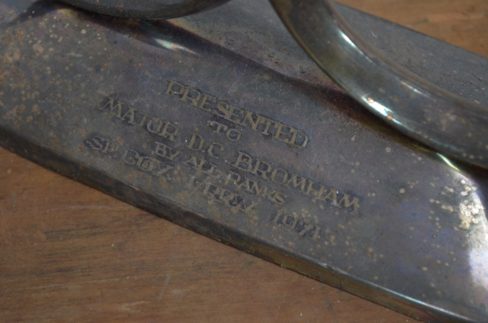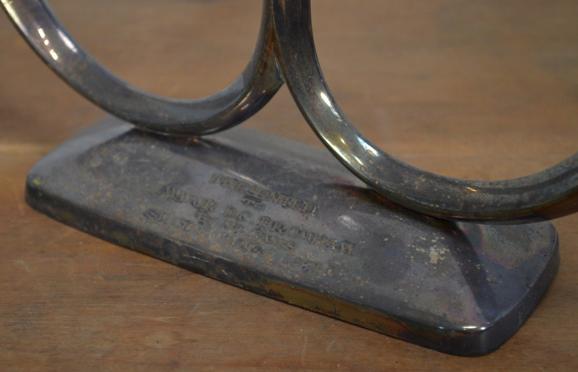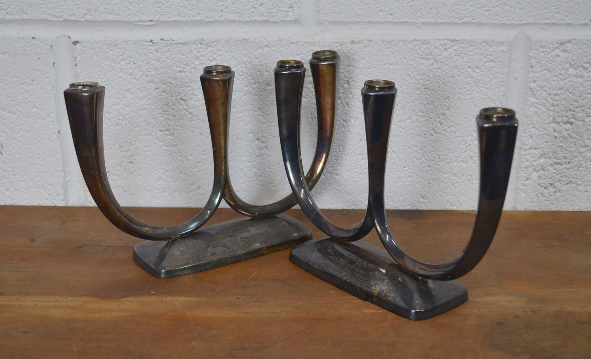 This vintage silver-plated three-candle candelabra features a distinctly Scandinavian-inspired design and is thought to have been crafted in Germany by WMF. A highly sought-after piece, this particular example was presented to a Mayor in 1971, though the design dates back to the 1960s.