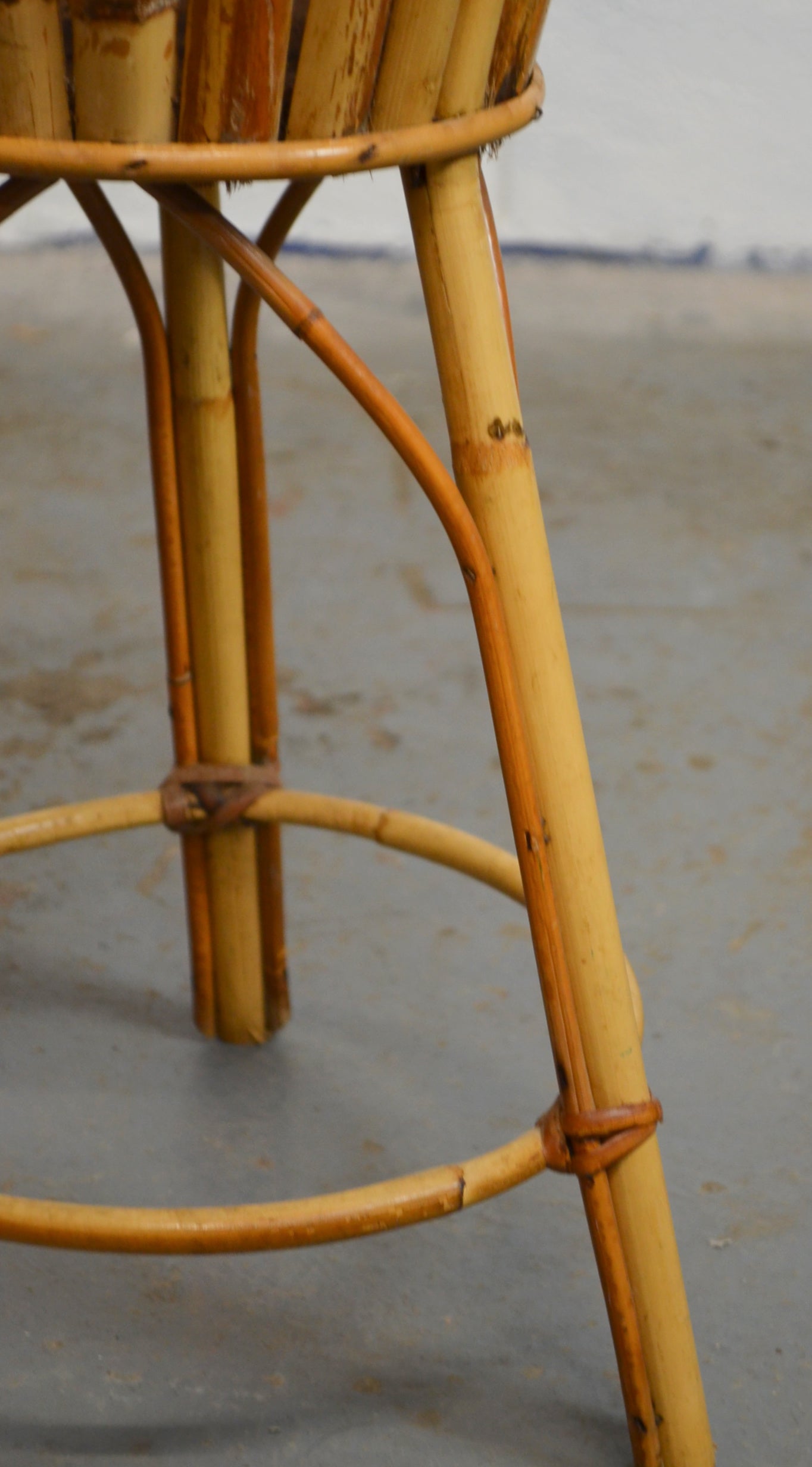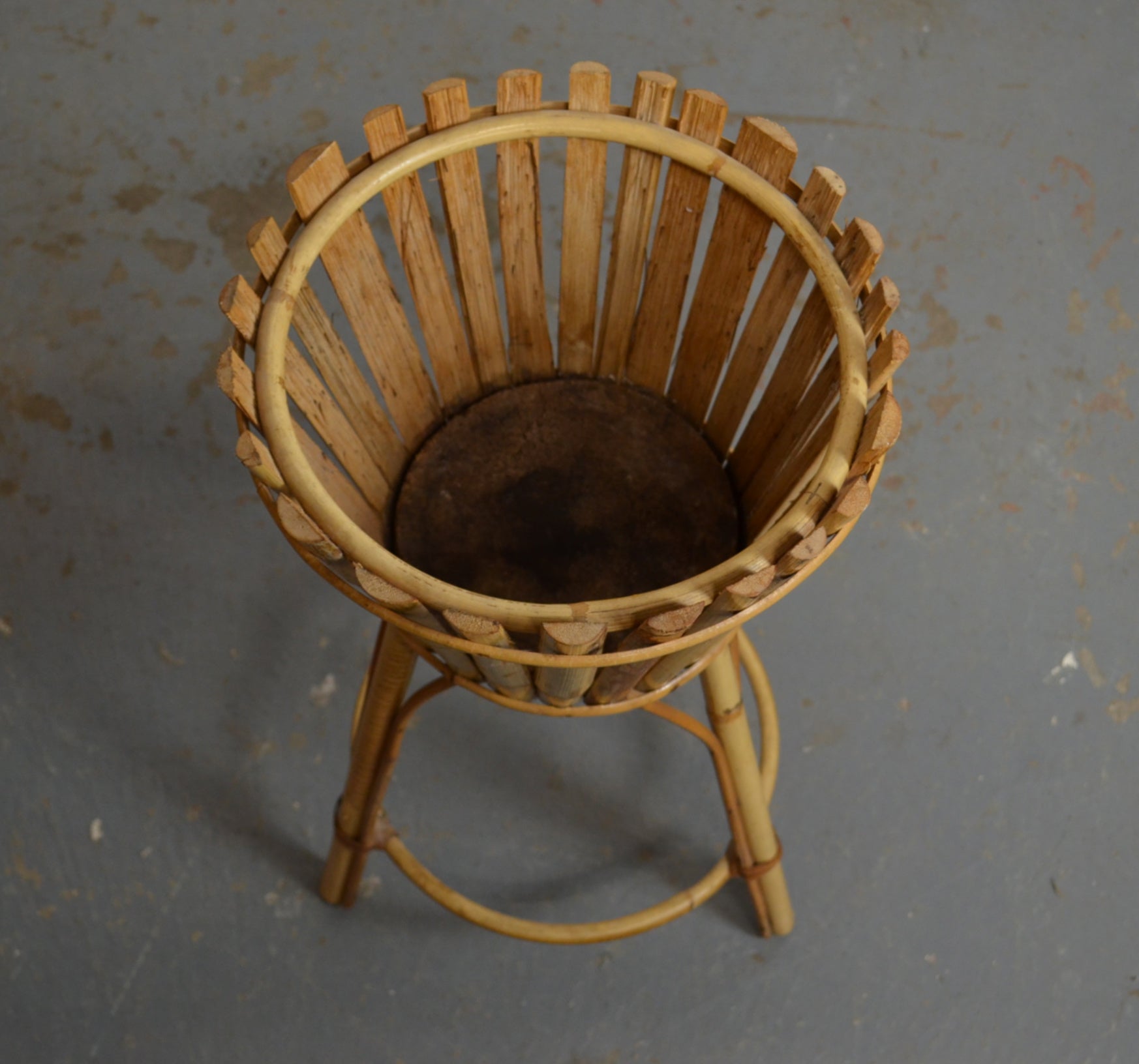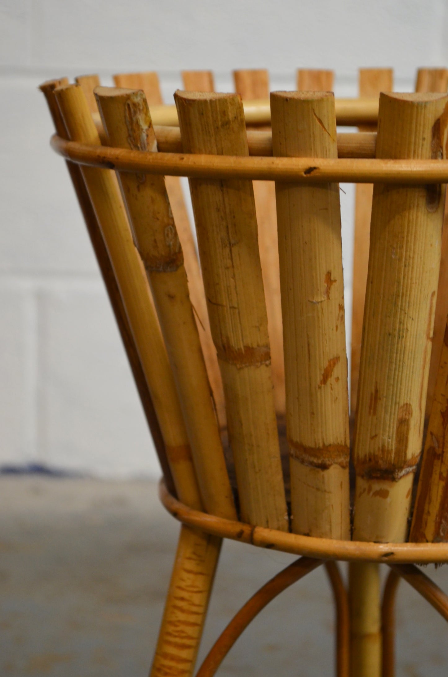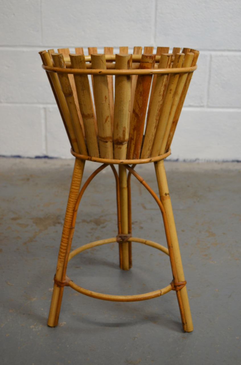 A vintage mid 20th century bamboo planter plant stand having circular bin style top over tapering splayed supports.