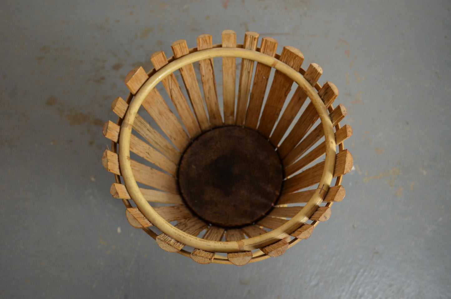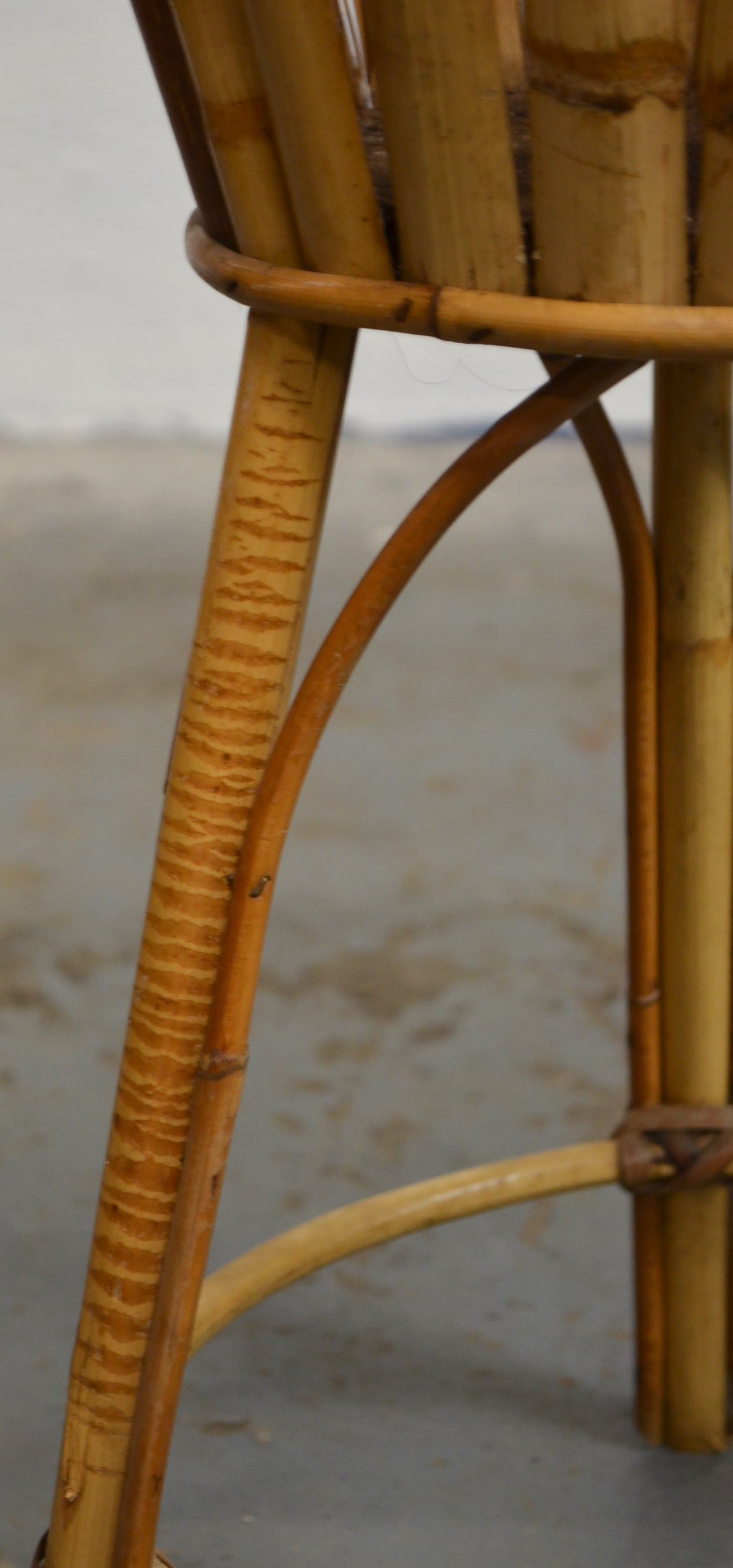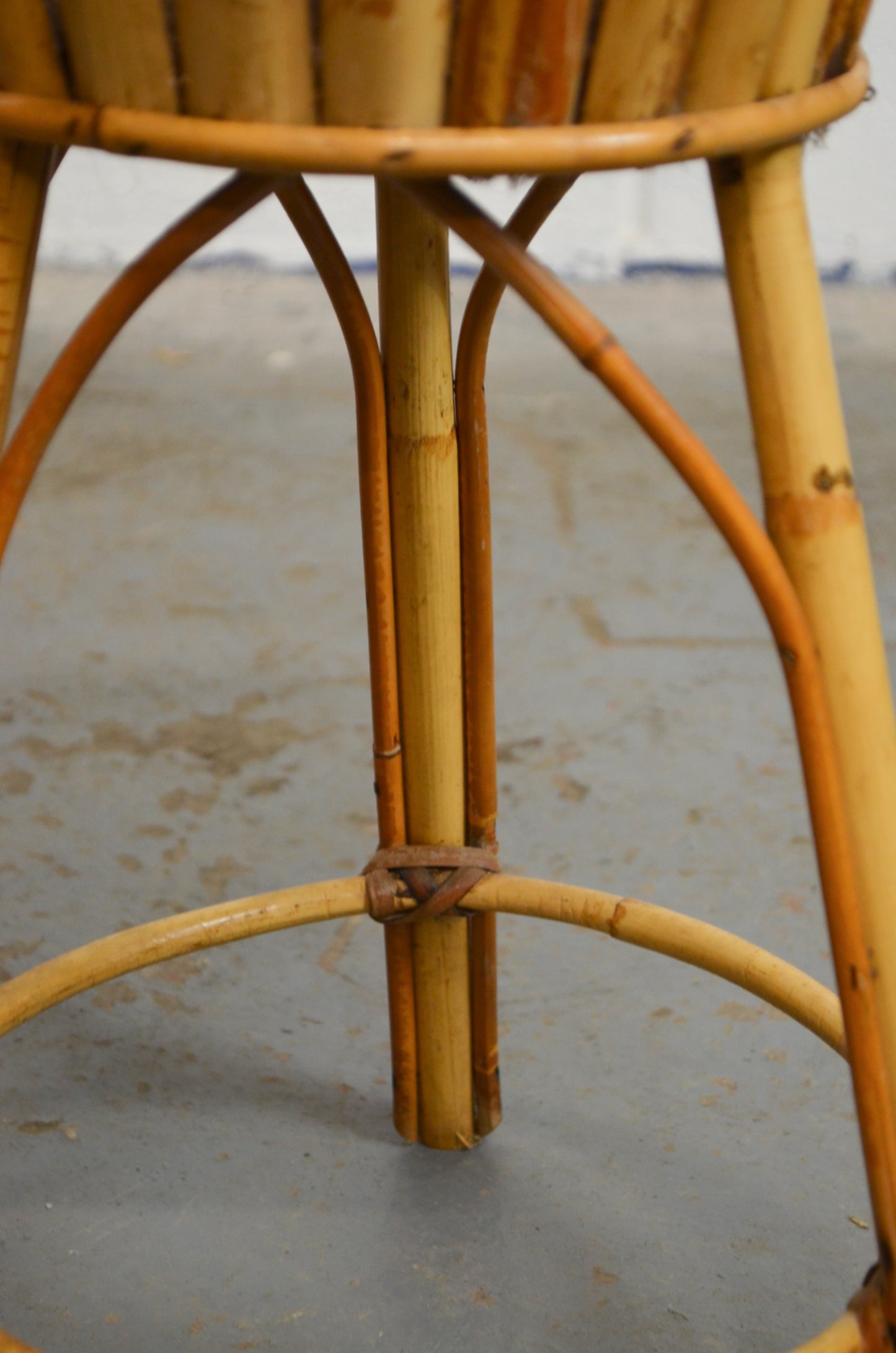 A vintage mid 20th century bamboo planter plant stand having circular bin style top over tapering splayed supports.