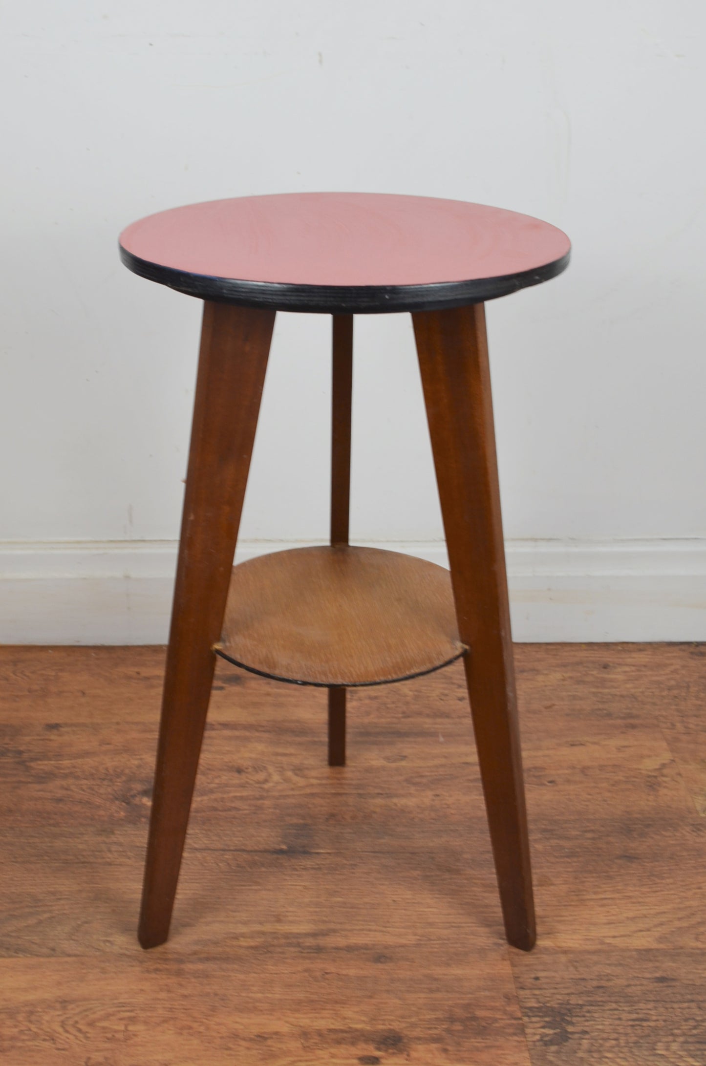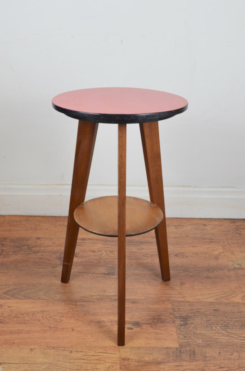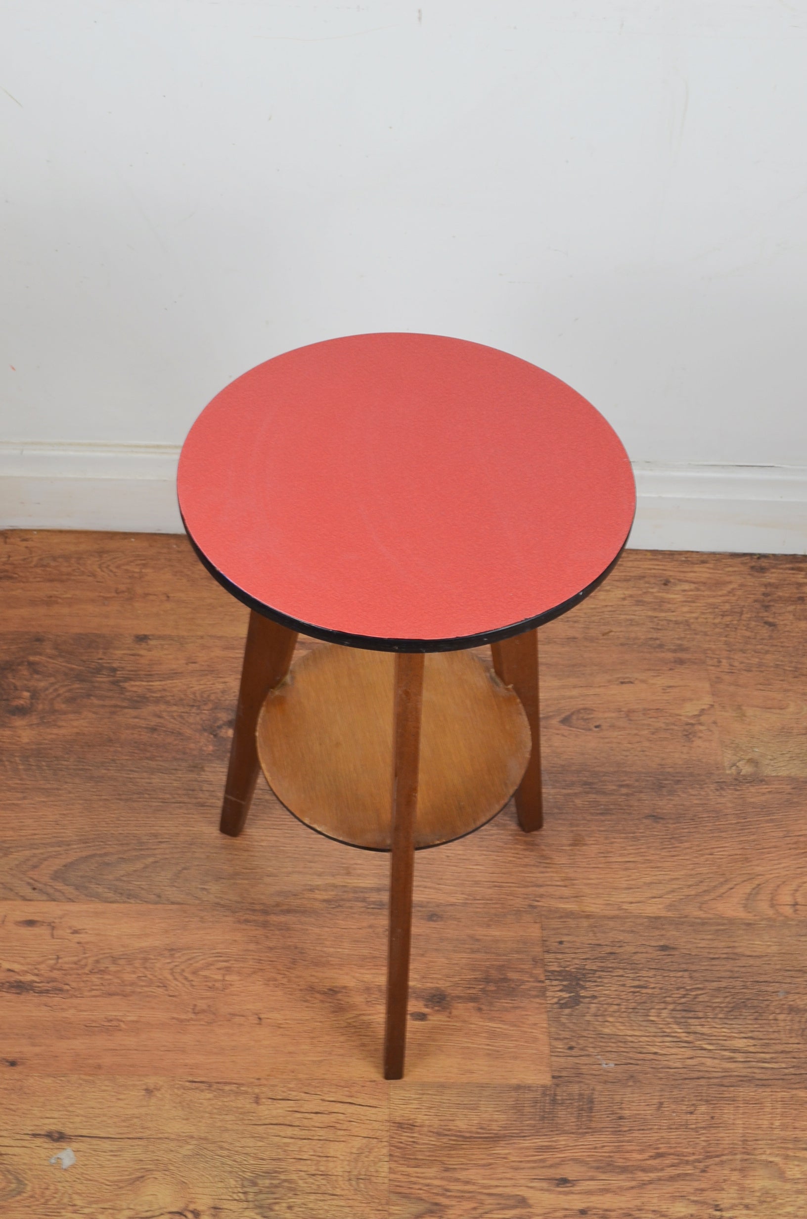A mid century occasional/plant/lamp table with red Formica circular top raised on three shaped legs with support table below.