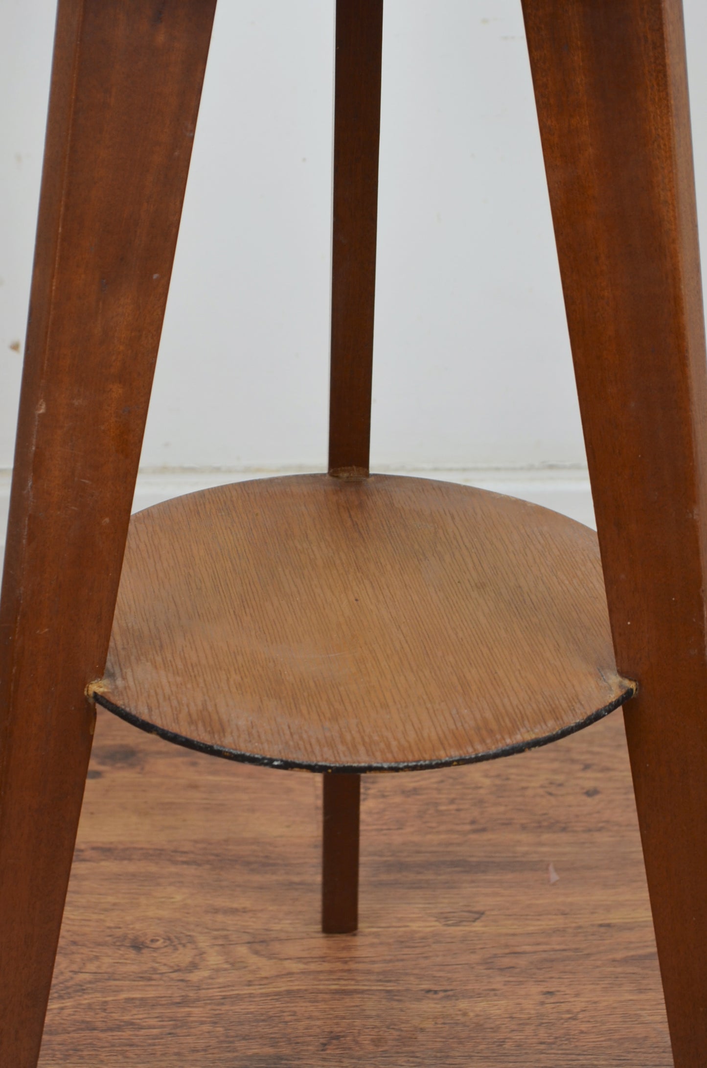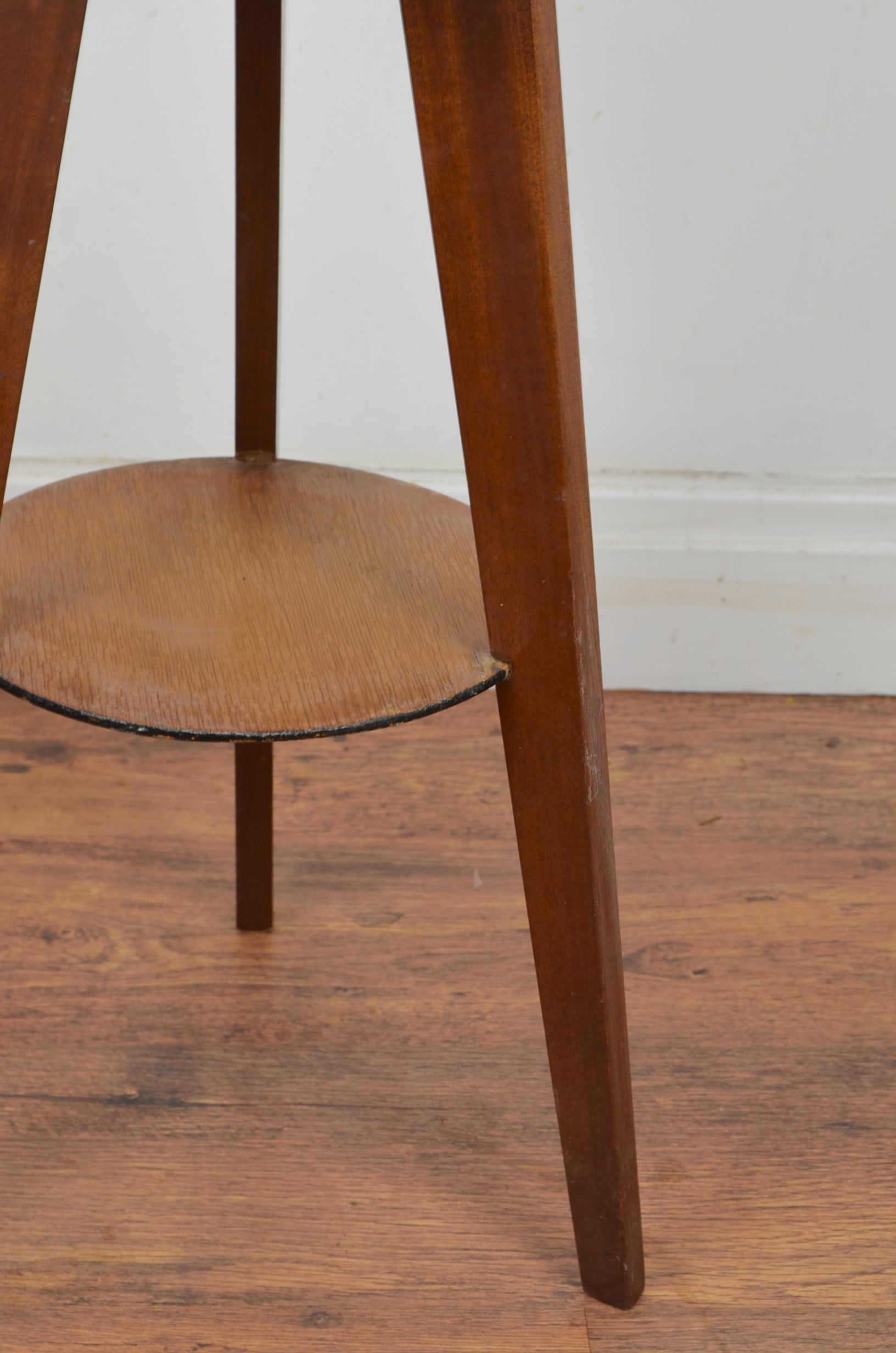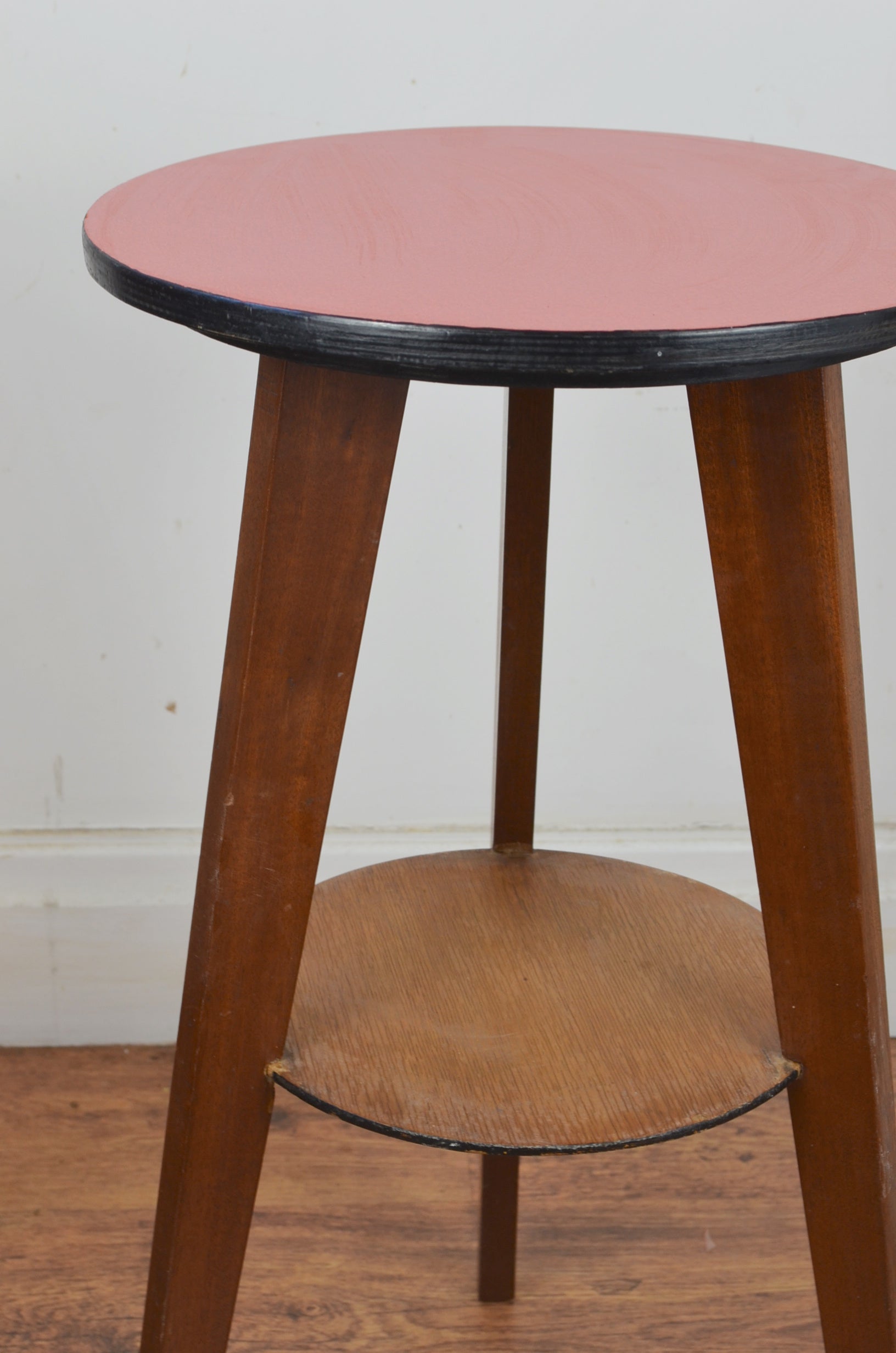 A mid century occasional/plant/lamp table with red Formica circular top raised on three shaped legs with support table below.