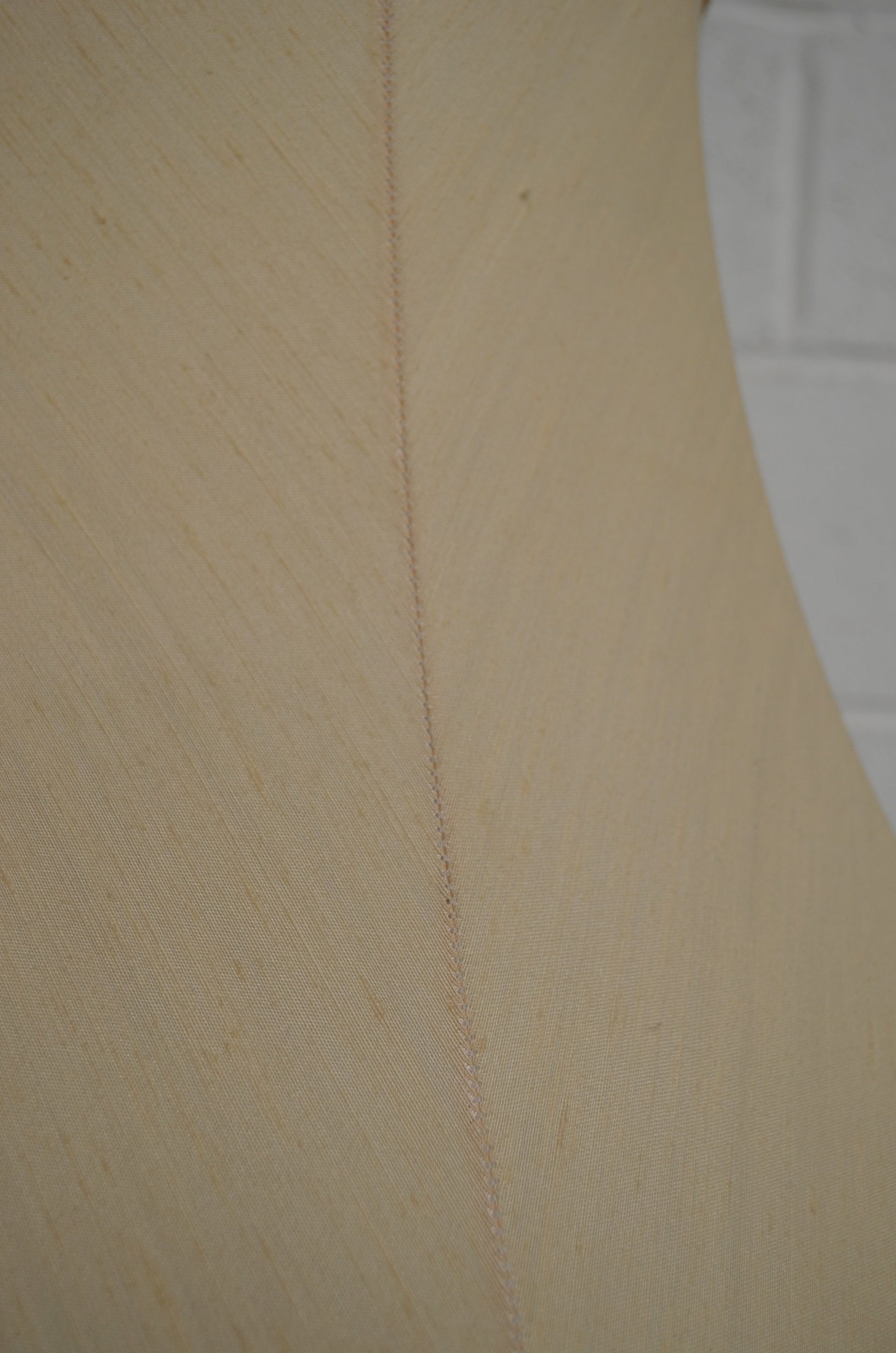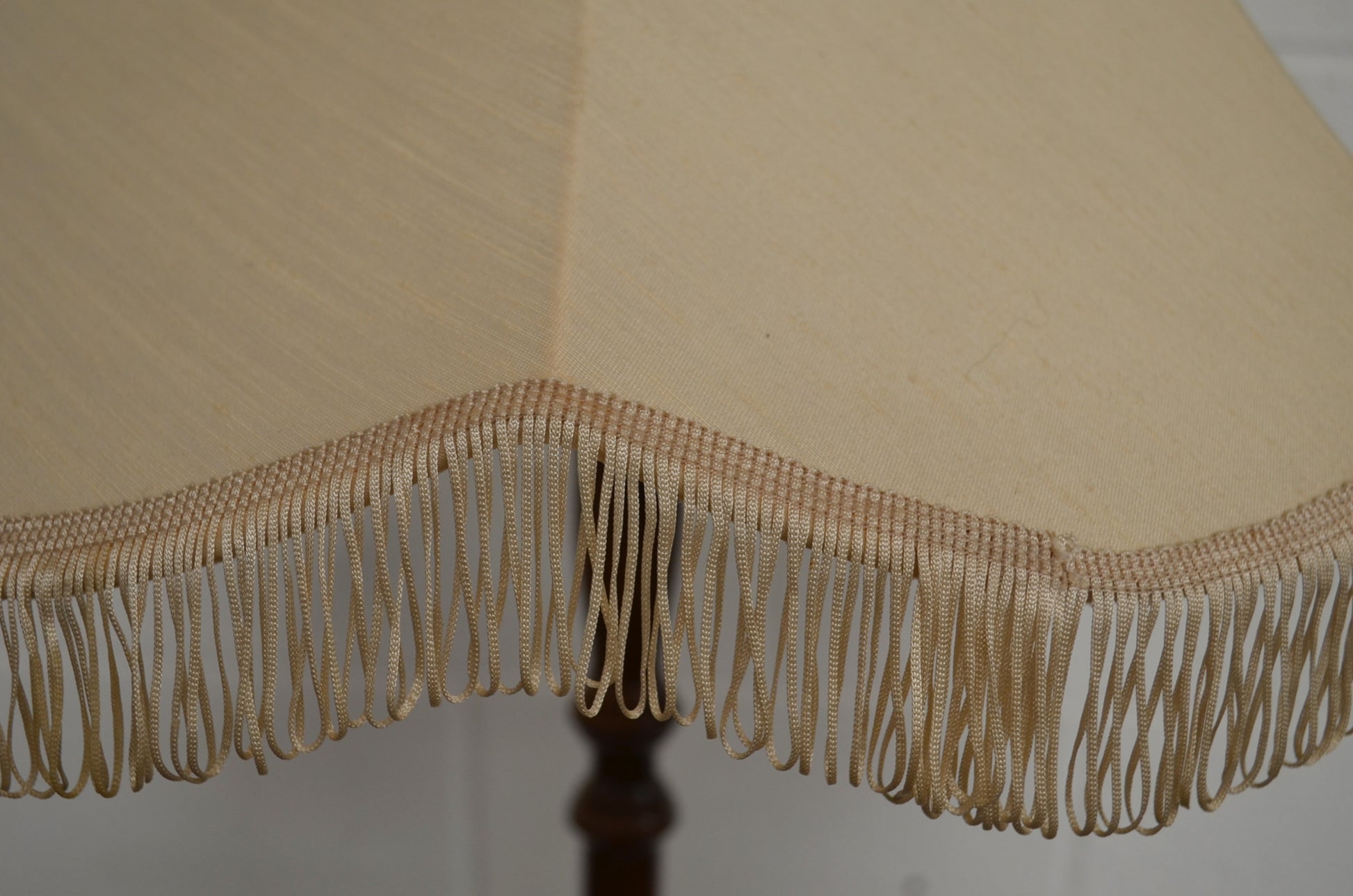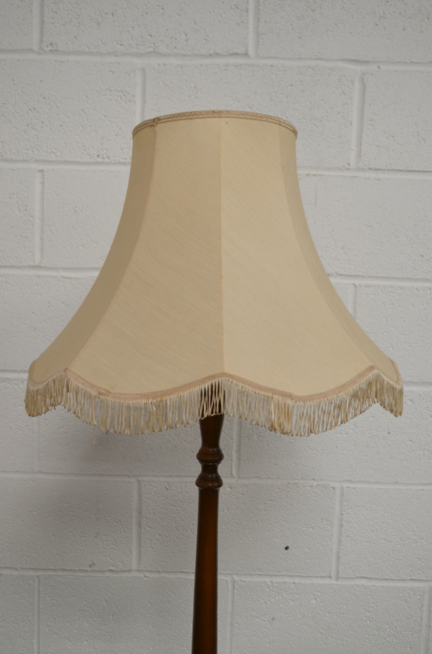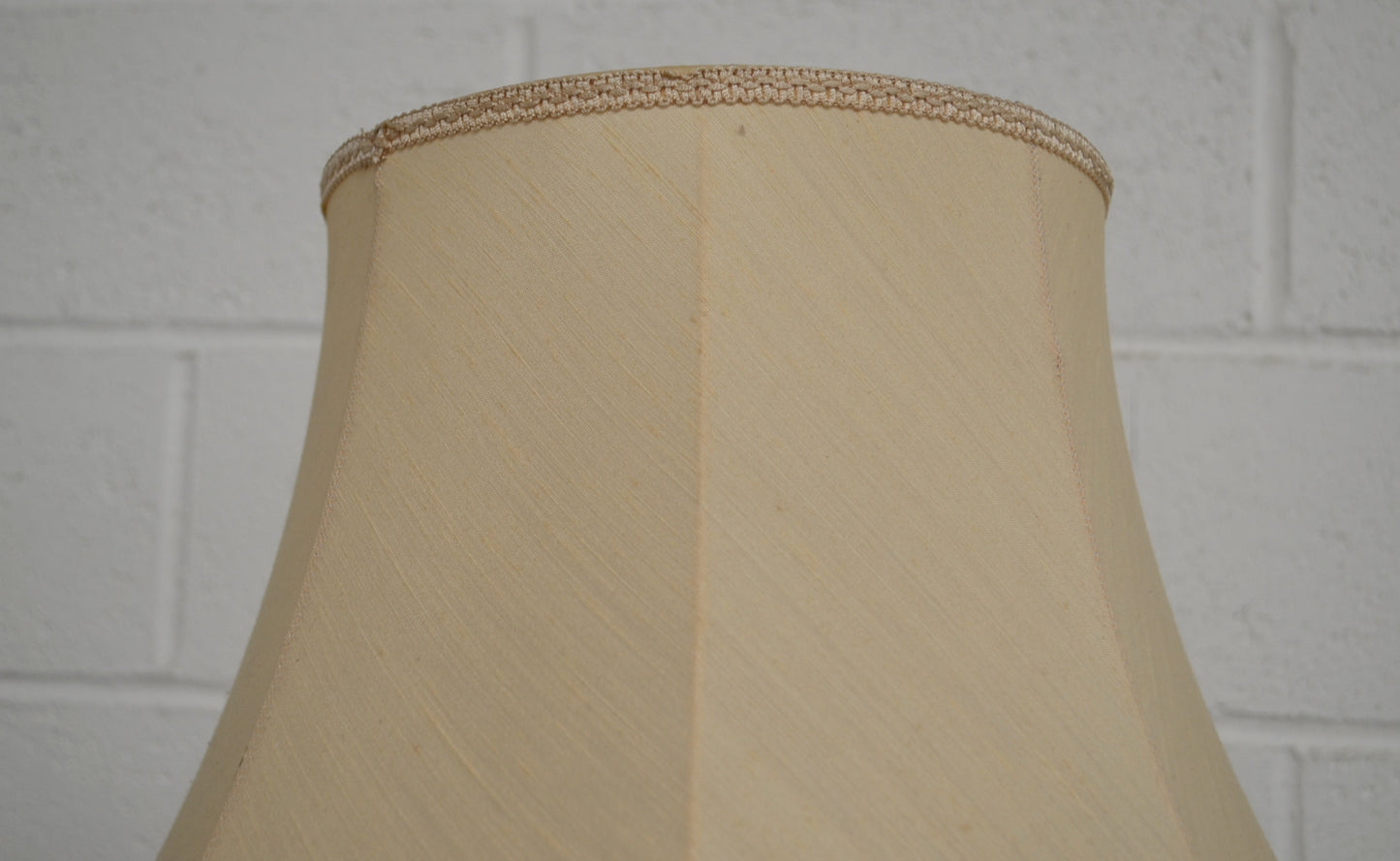 A vintage retro cream coloured lamp shade with textured covering on card and decorative trim.