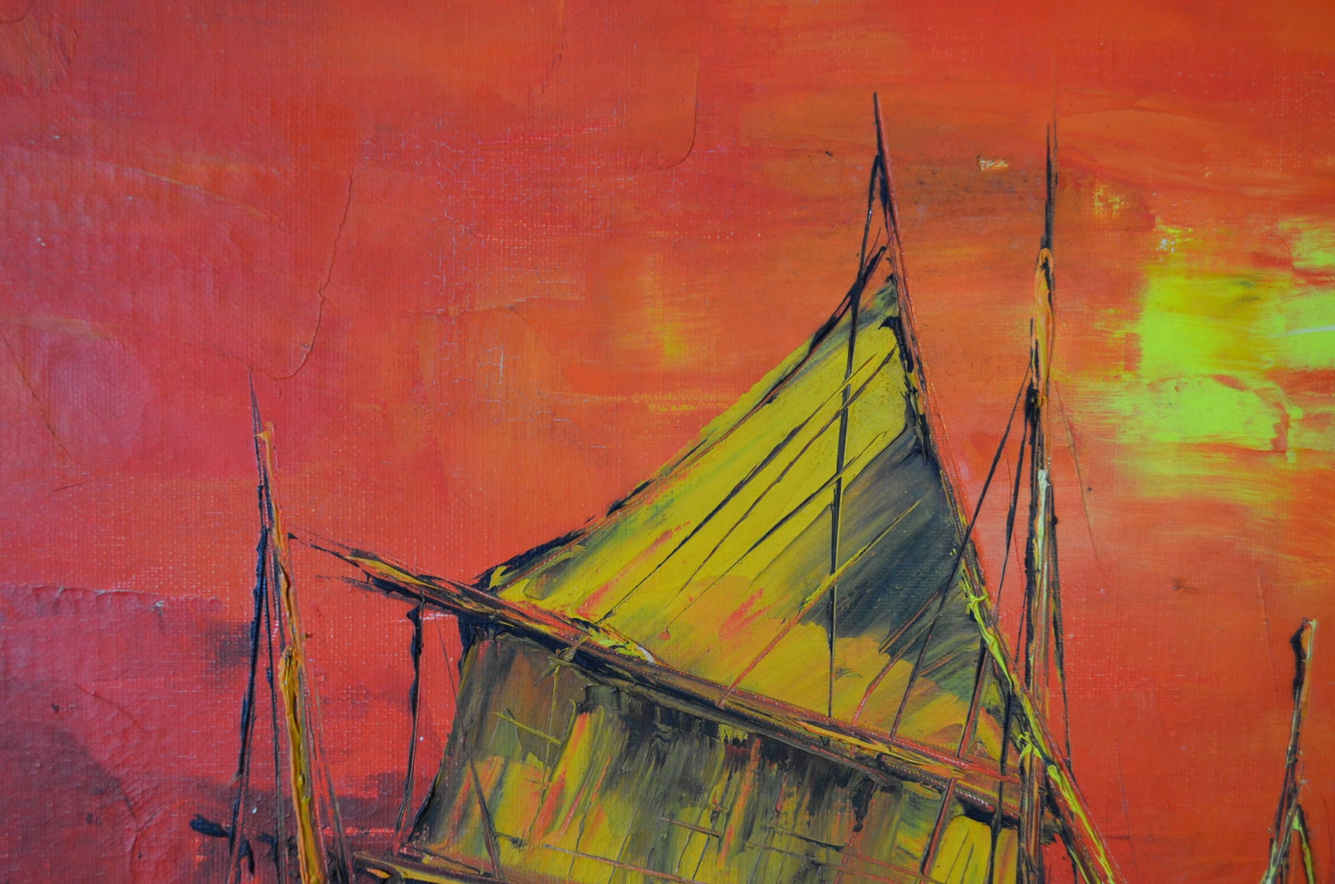 Ricky Leung - A 20th-century oil on board seascape painting depicting an Asian ship in deep orange and yellow light with other ships in the background . Signed by the artist to the bottom left corner. Framed