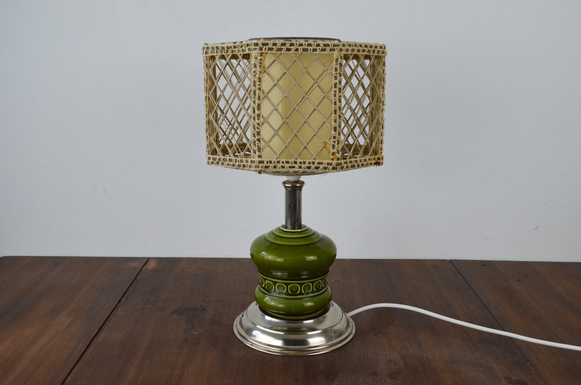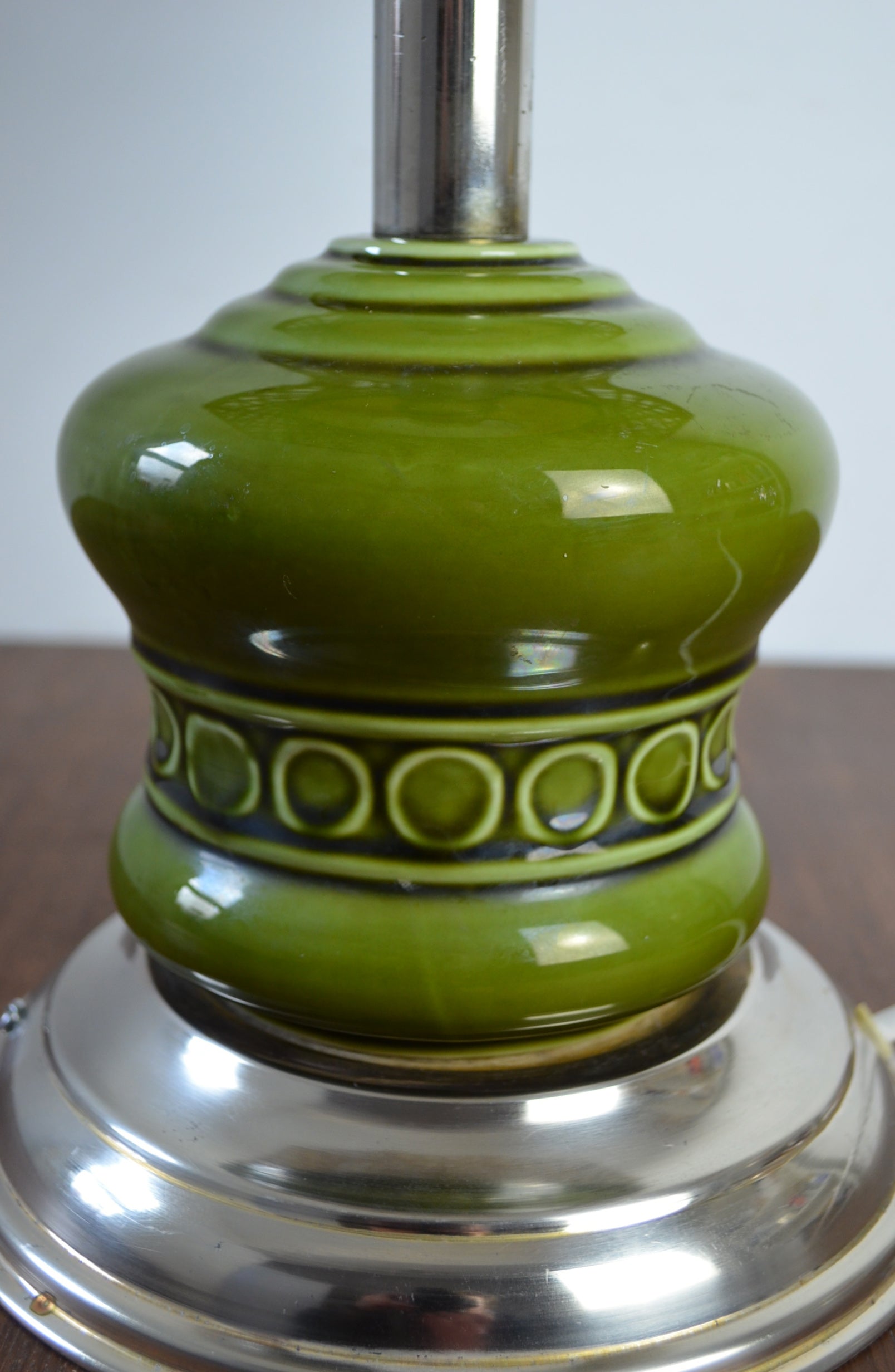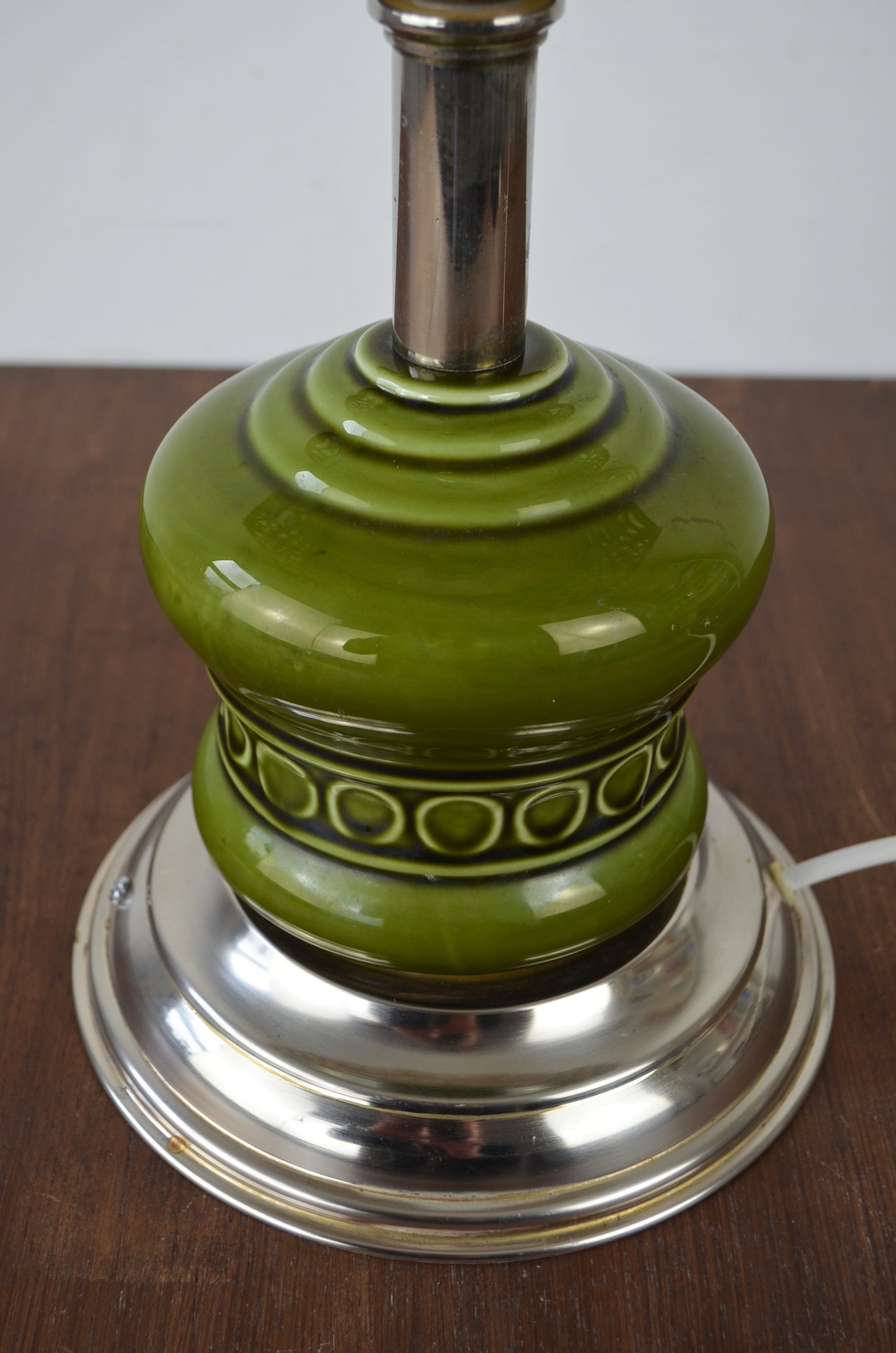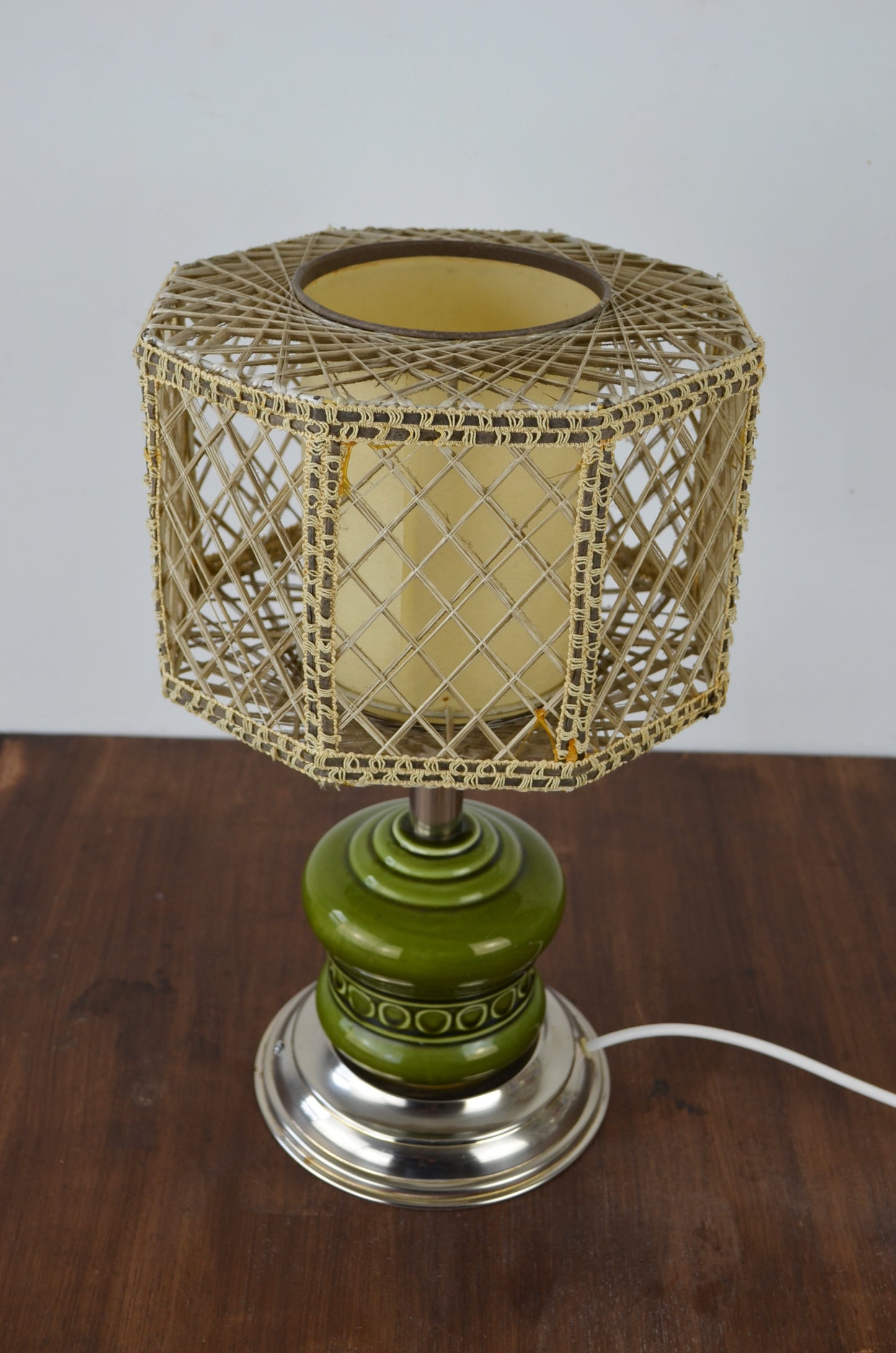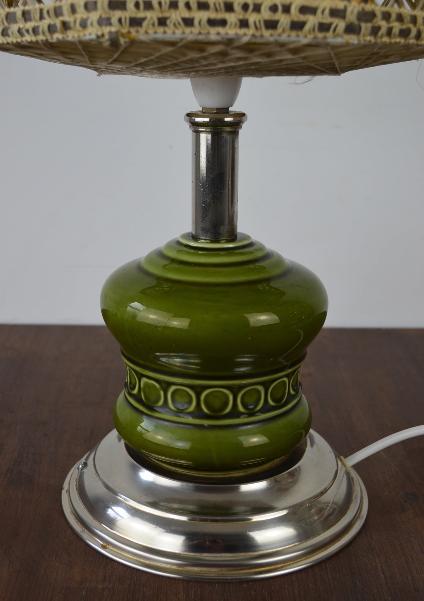 A vintage mid century West German fat lava 'style' desk lamp. The lamp having an unusual cross-wired shade, chrome cylindrical light bulb stem and green ceramic body on circular chrome plinth.