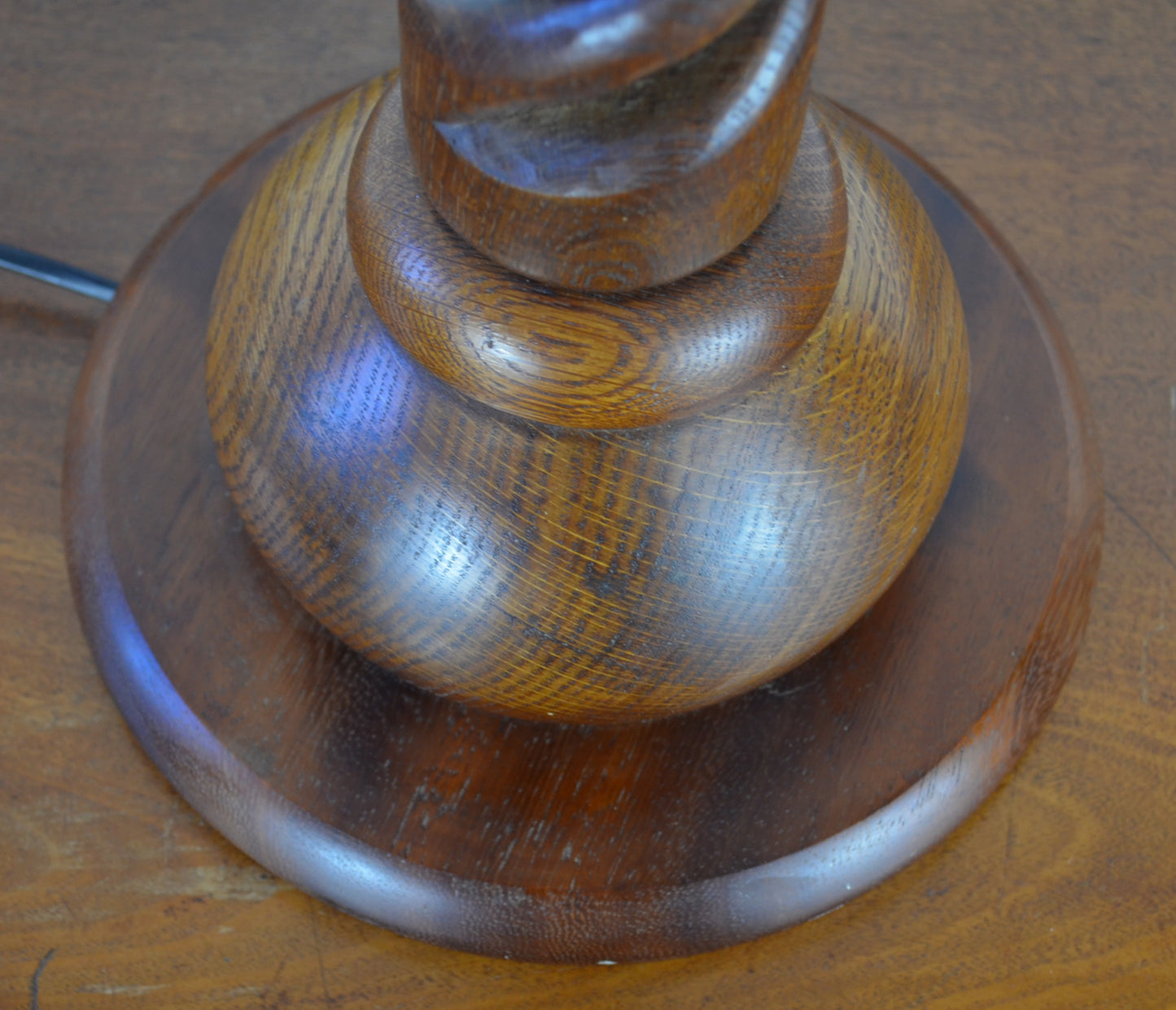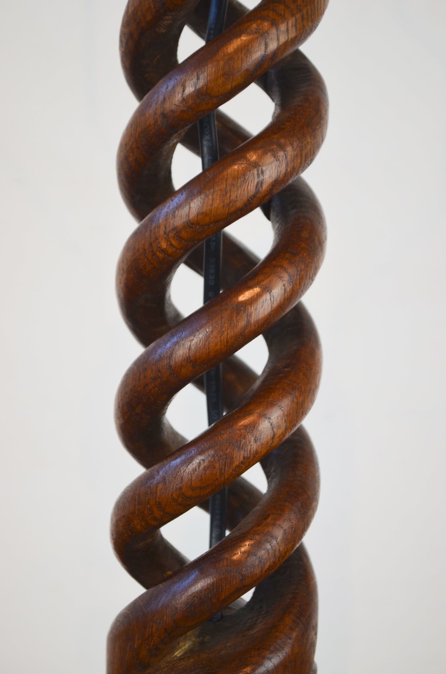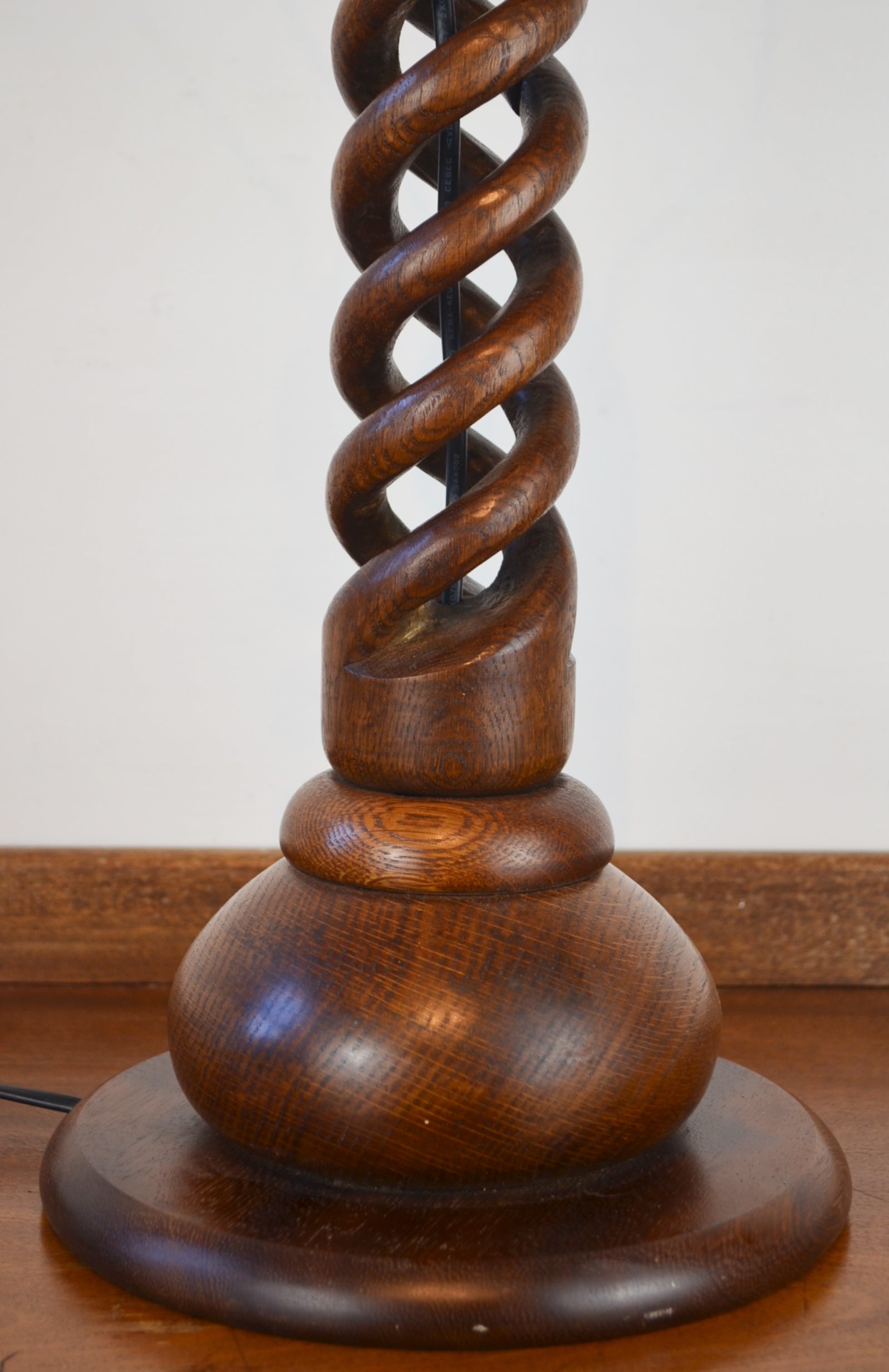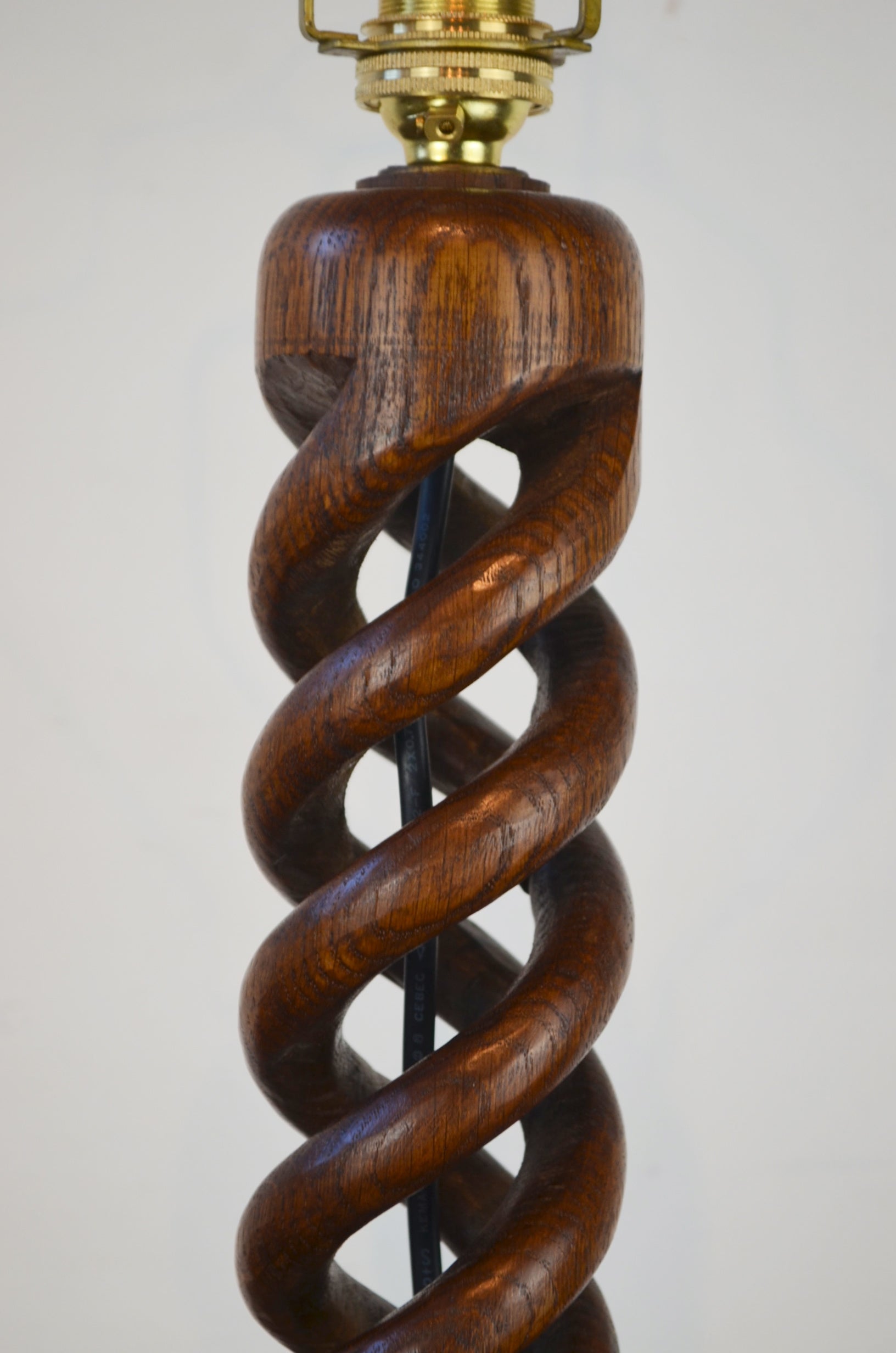 A vintage 20th Century mahogany open pierced barley twist lamp base. With brass shade fitting to top, twist column on circular spherical base.