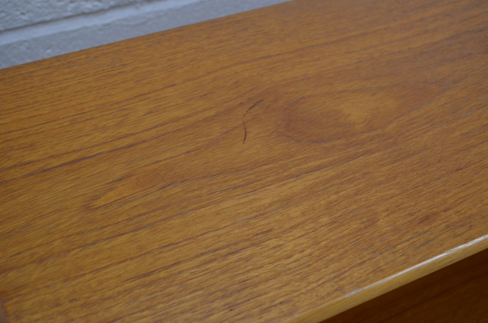 A vintage mid 20th Century teak bookcase unit by Nathan. The bookcase having open recess to top above twin drawers with turned handles and glazed shelves to base.