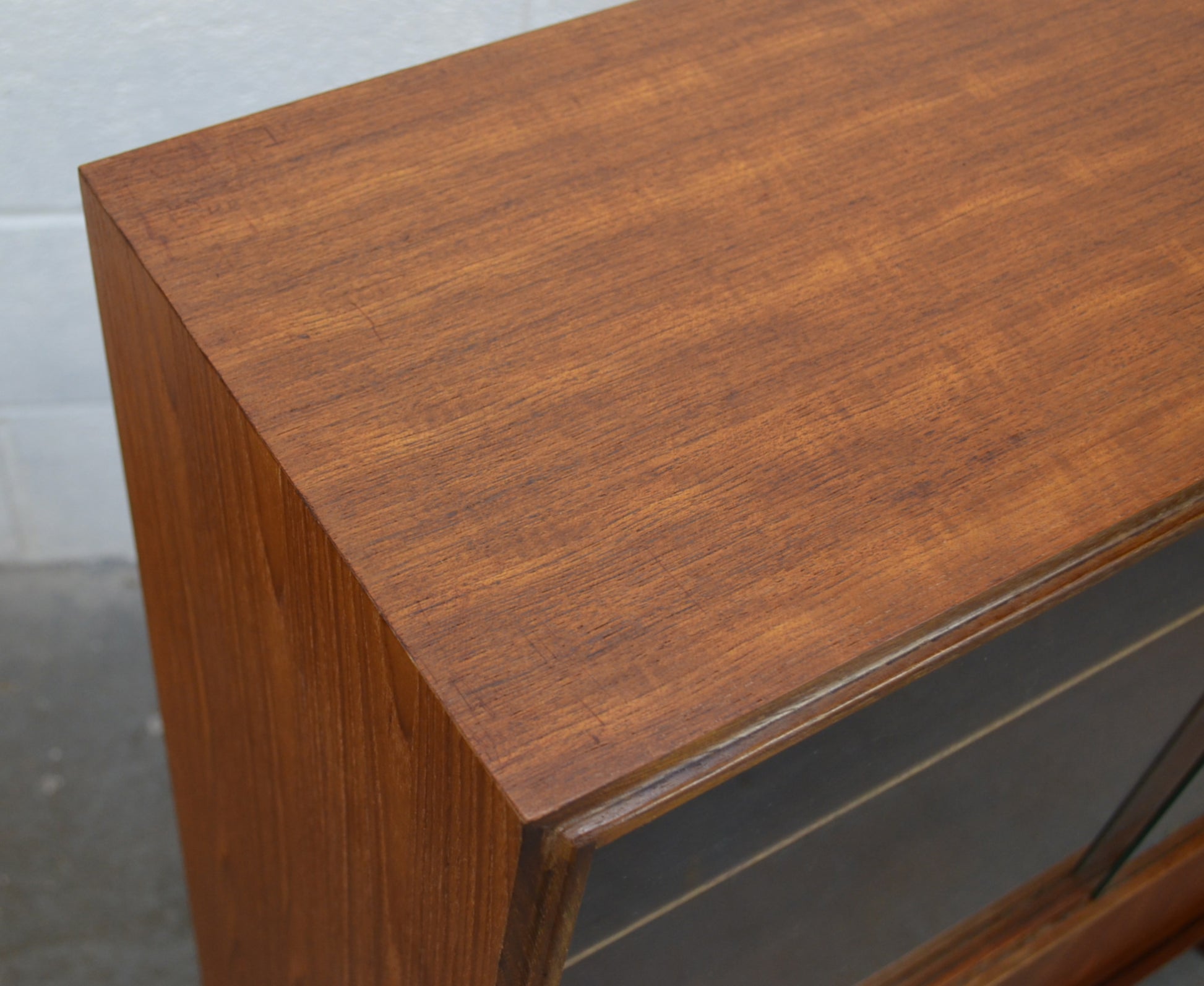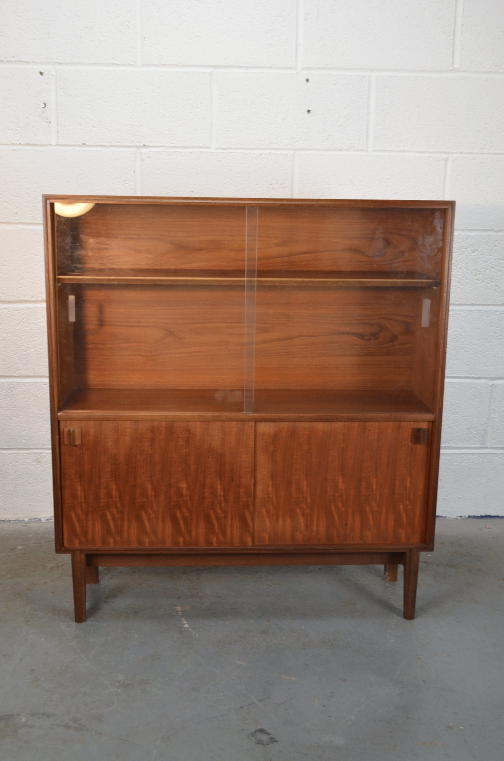 A vintage mid 20th Century teak bookcase unit. The bookcase having a pair of glass sliding doors with cut in handles, below are sliding wooden doors with great grain and nice handles.