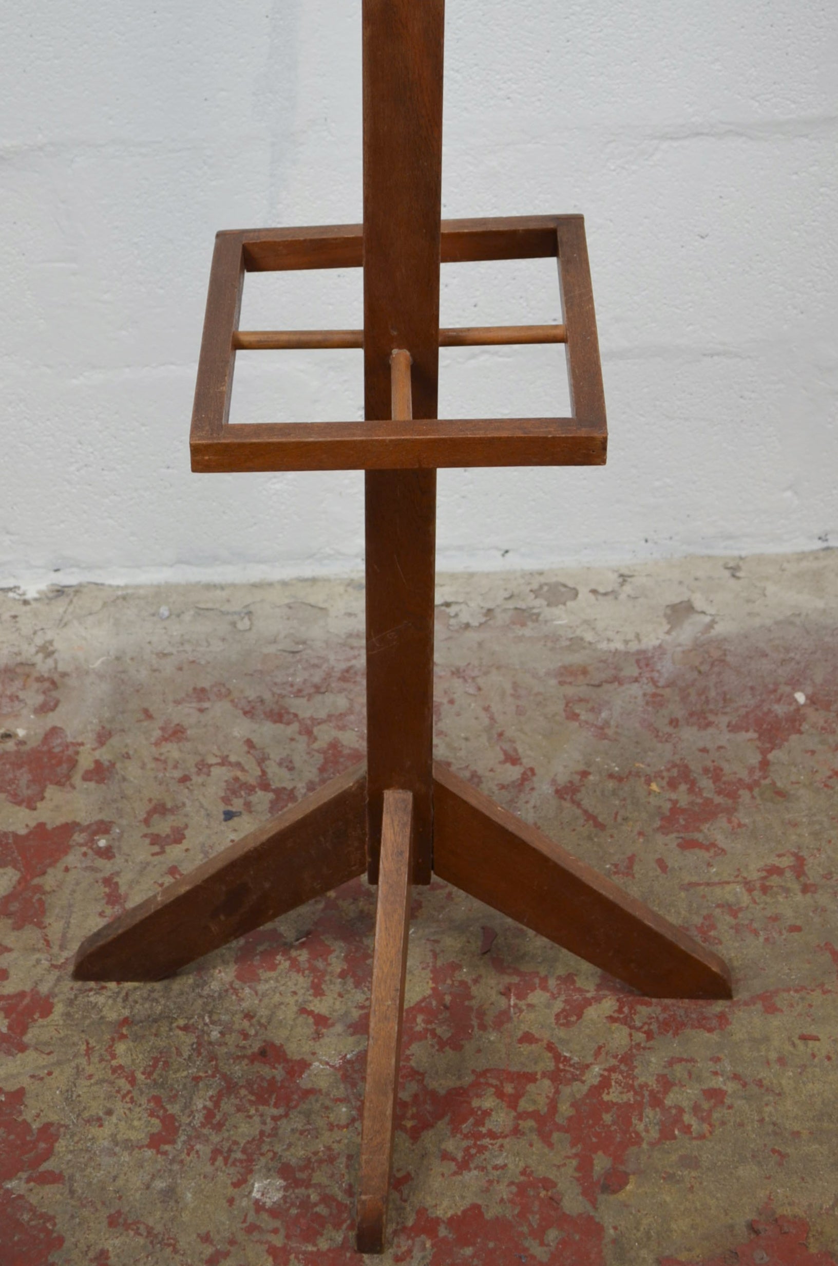 British Modern Design - Mid-century teak wood hall coat stand. Raised on four-point base with hooks atop. Stick stand quadrant to lower centre.