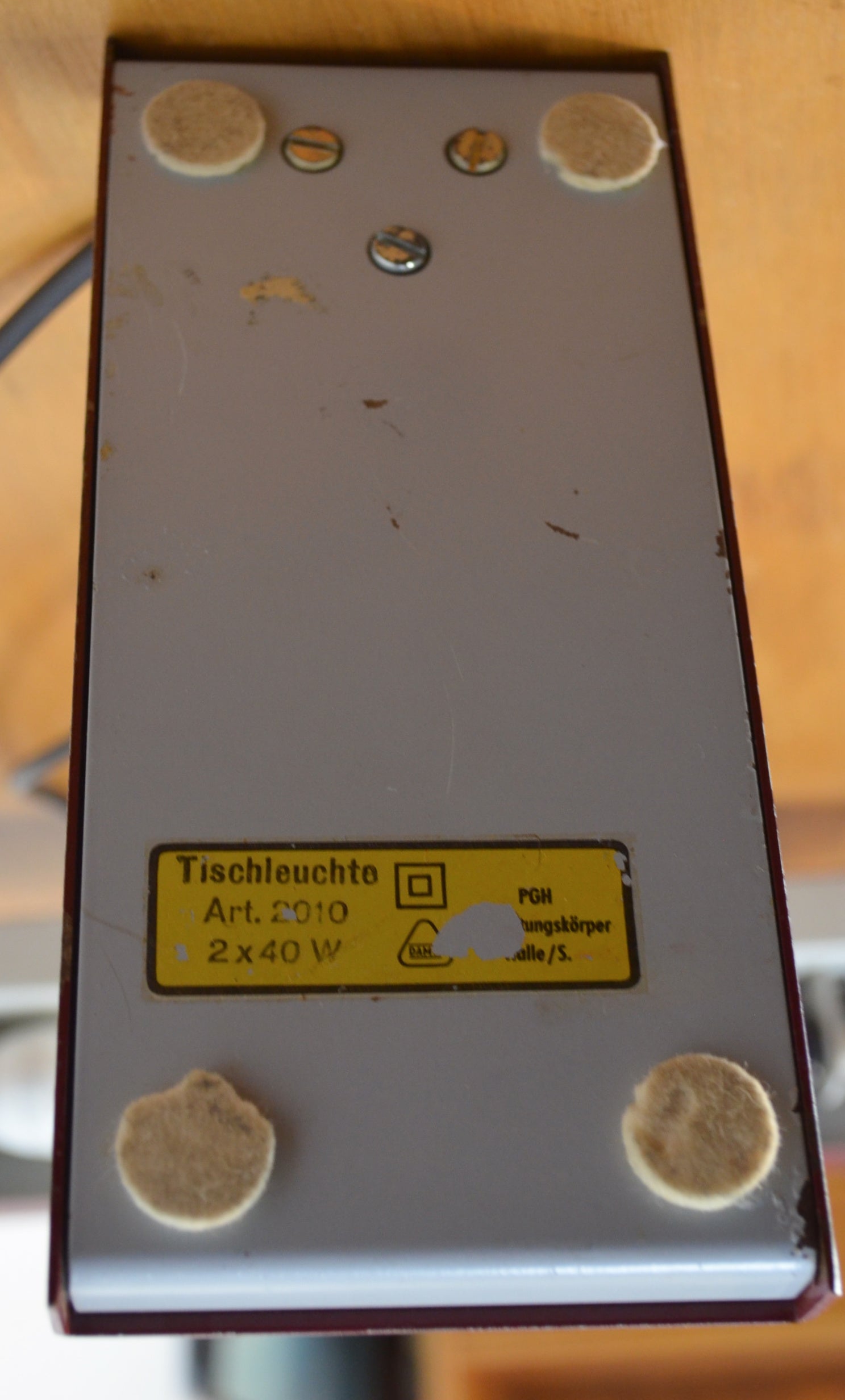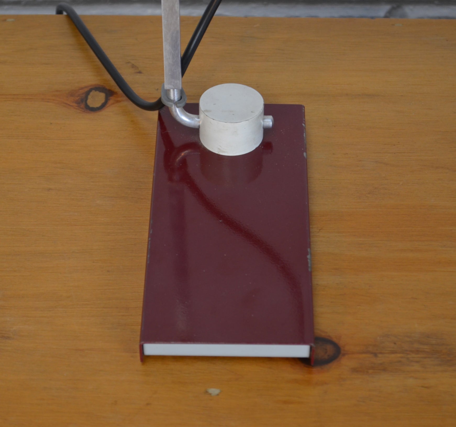 Tischleuchte - a retro 20th century painted metal Space Age desk office table lamp light. The lamp having an elongated rectangular burgundy shade, central column support below. All raised on rectangular matching base. Label to underside.