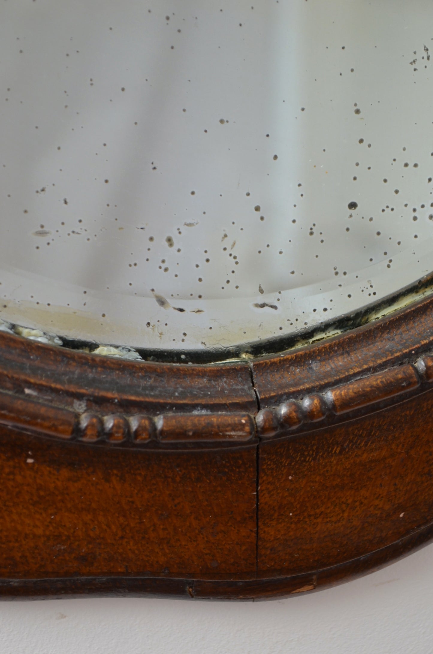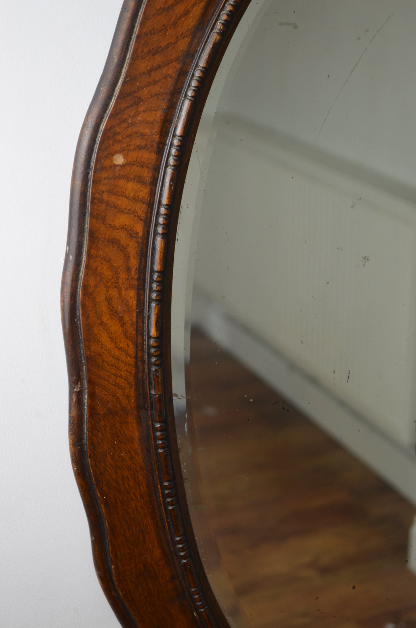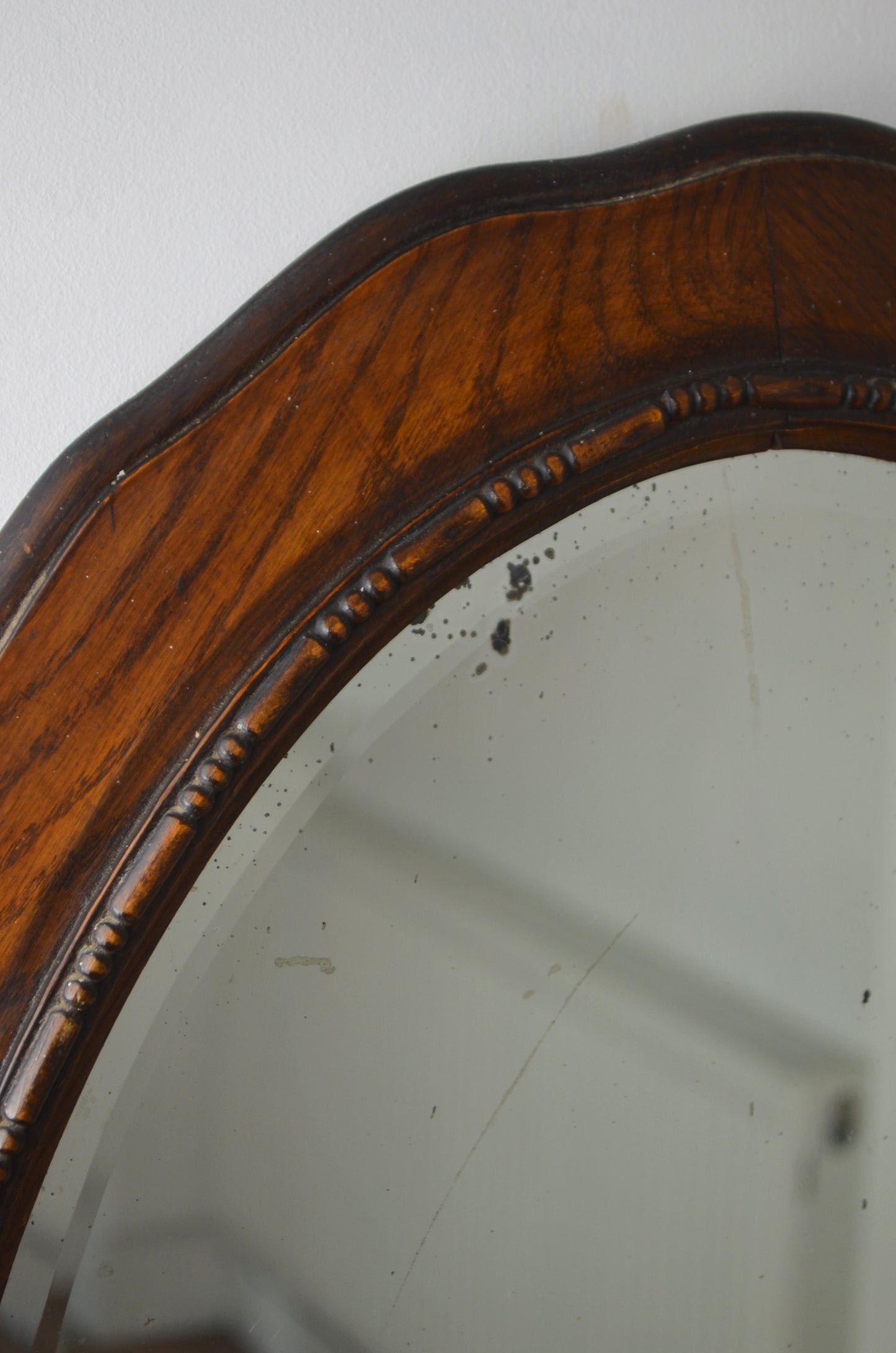 An oval oak framed wall mirror circa 1940-50s. Great colour and decorative trim.